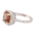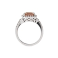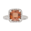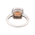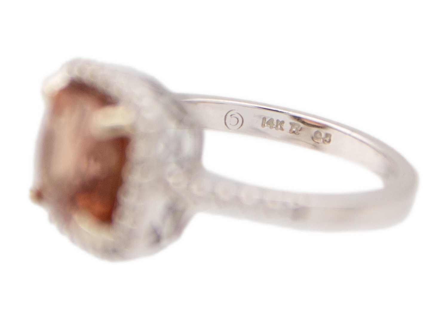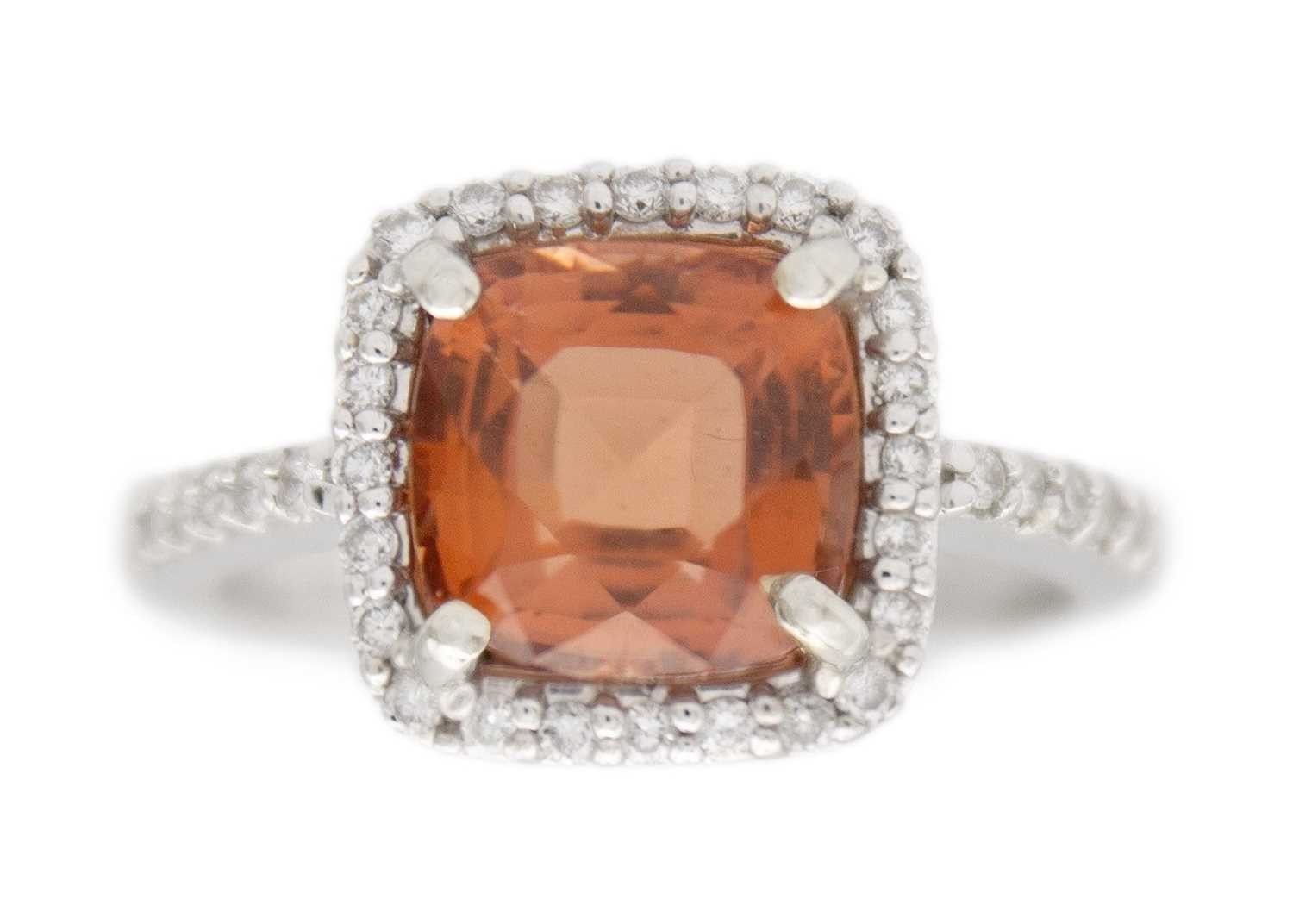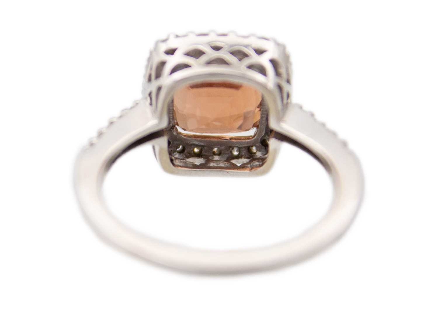 A pinkish orange tourmaline and diamond set white gold ring. The square-shaped cushion-cut tourmaline, 8mm x 8mm, surrounded by round melee white diamonds, stamped 14k, size M1/2, total weight 4.79g.