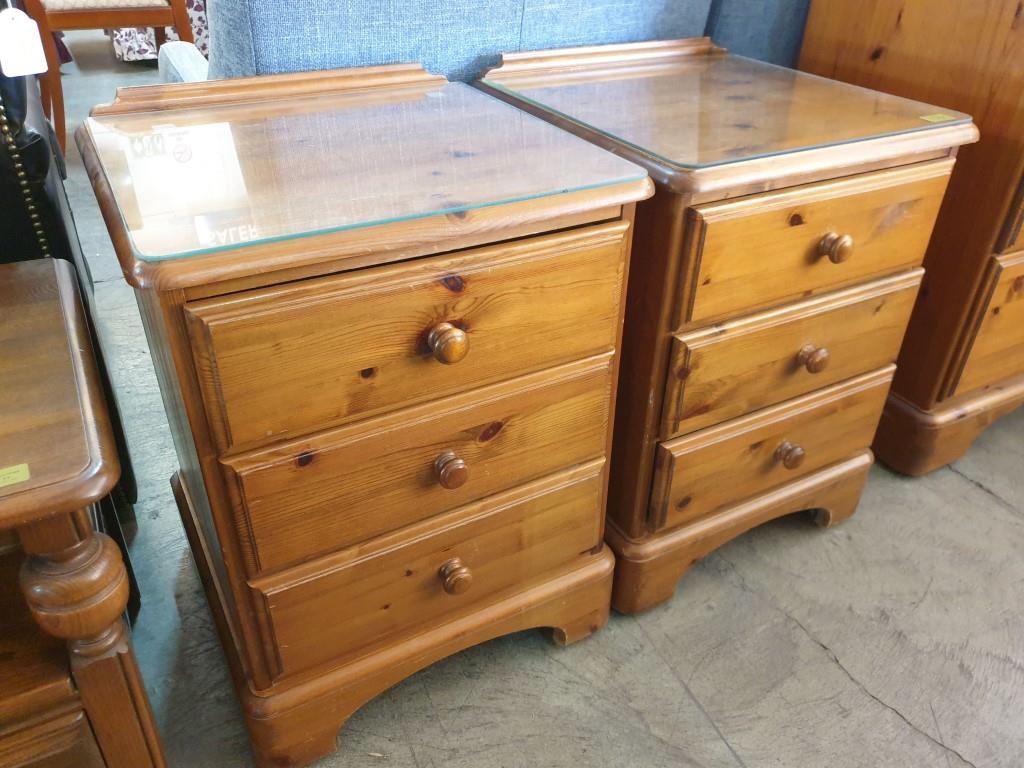 Pair of Pine 3 - Drawer Bedside Units with Glass Top (46 x 44 x 61cm) (2)