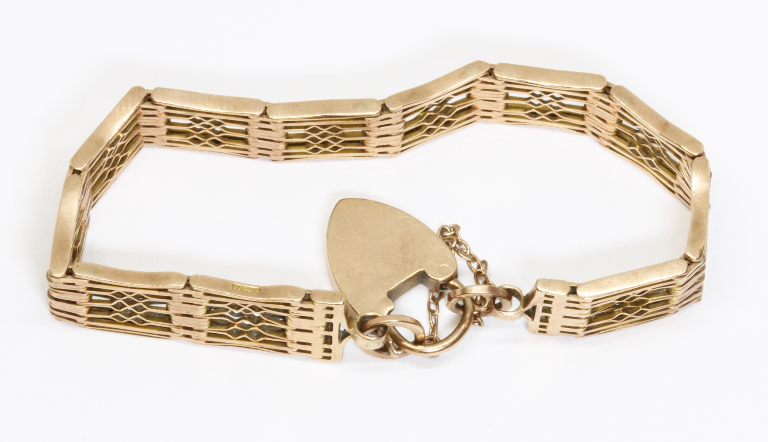 A hallmarked 9ct gold gate bracelet, length 16cm, weight 22.8g, 10% buyer's premium (inclusive of VAT), normal online bidding fees apply.