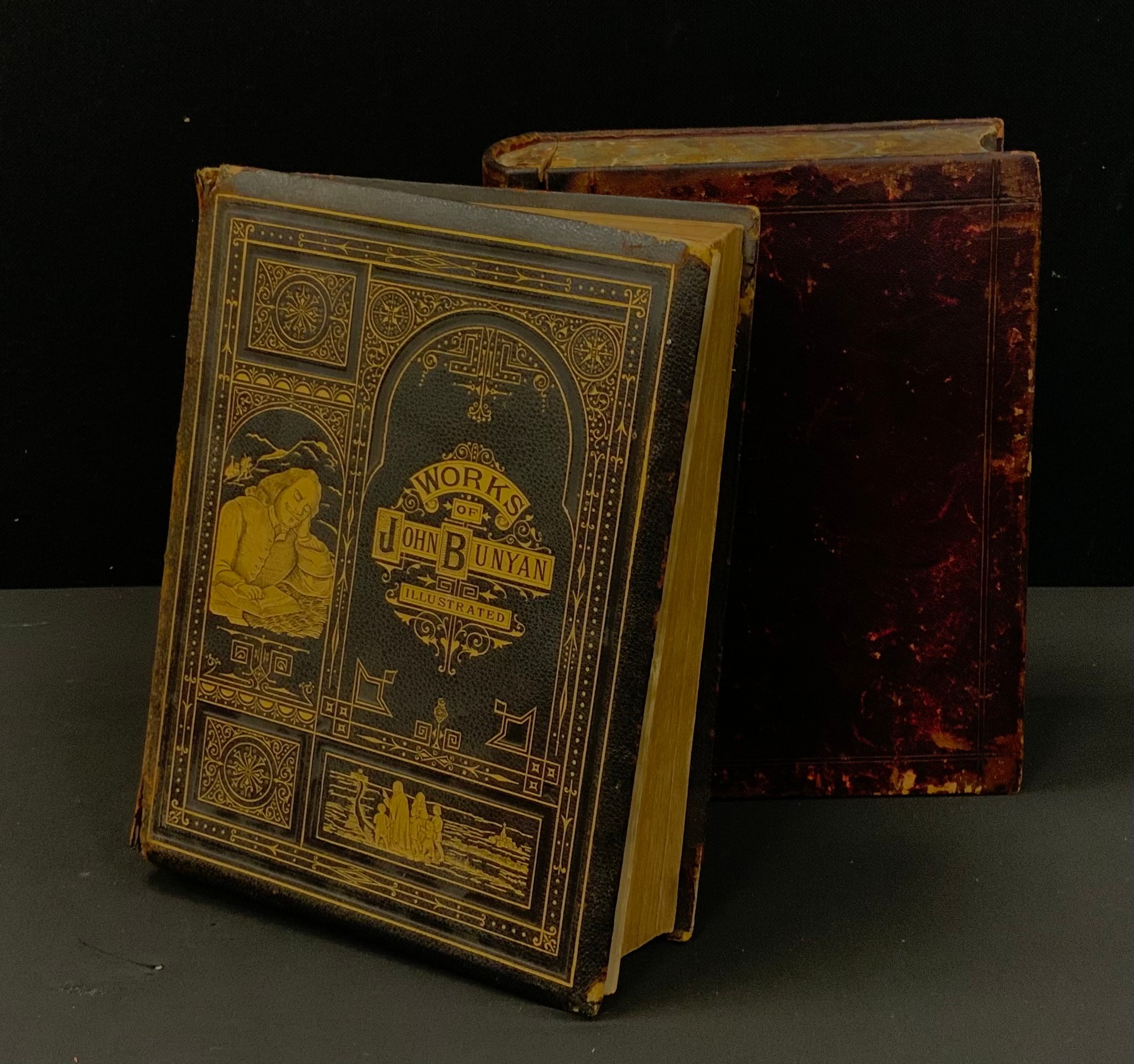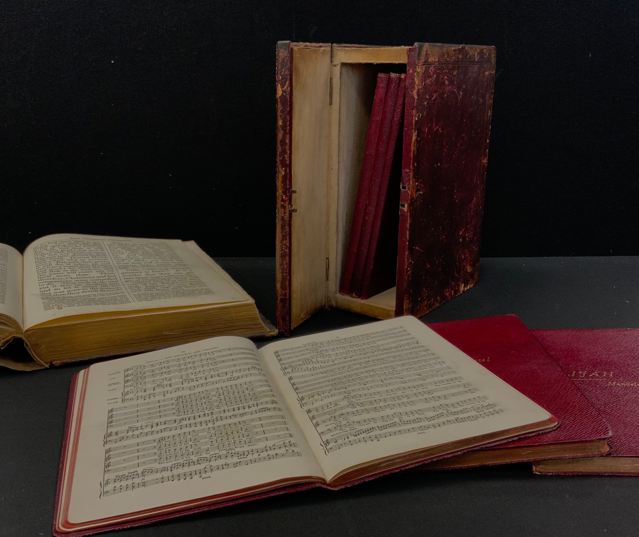 Books - Novello's original octavo Edition, cased set of six vocal score pianoforte booklets, G F Handel, Messiah & Judas Maccaboeus, W A Mozart, Twelfth Mass, Felix Mendelssohn Bartholdy Elijah & Saint Paul, J Haydn, The Creation, printed London & New York, Novello, Ewer and Co, in book form box case incribed Presented to Mr Arthur Lucas by the members of the North Meols Choral Society in recognition of his service as accompanist, April 23rd 1897; Pilgrims Progress and other selected Bunyan's Works (2)
