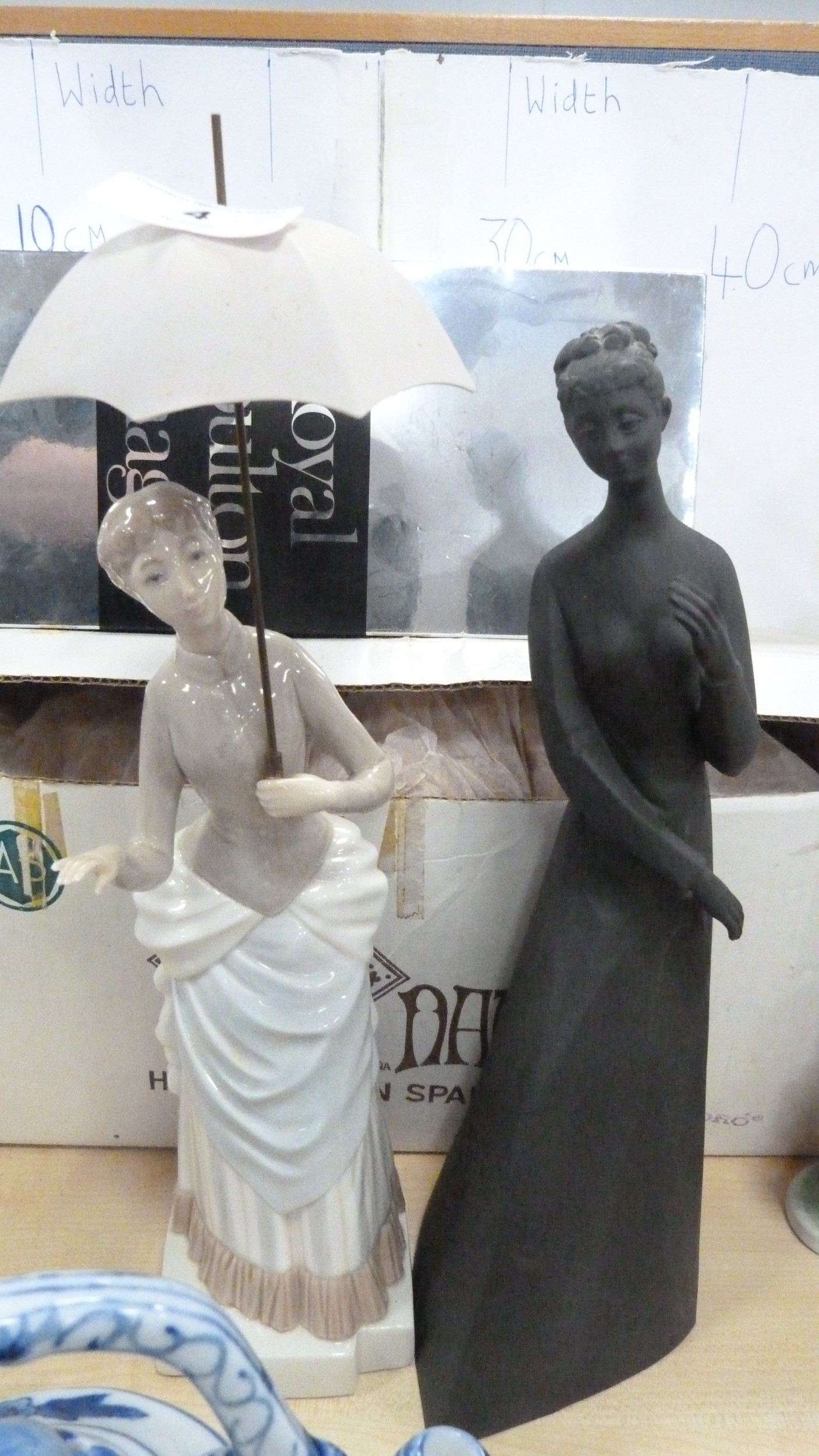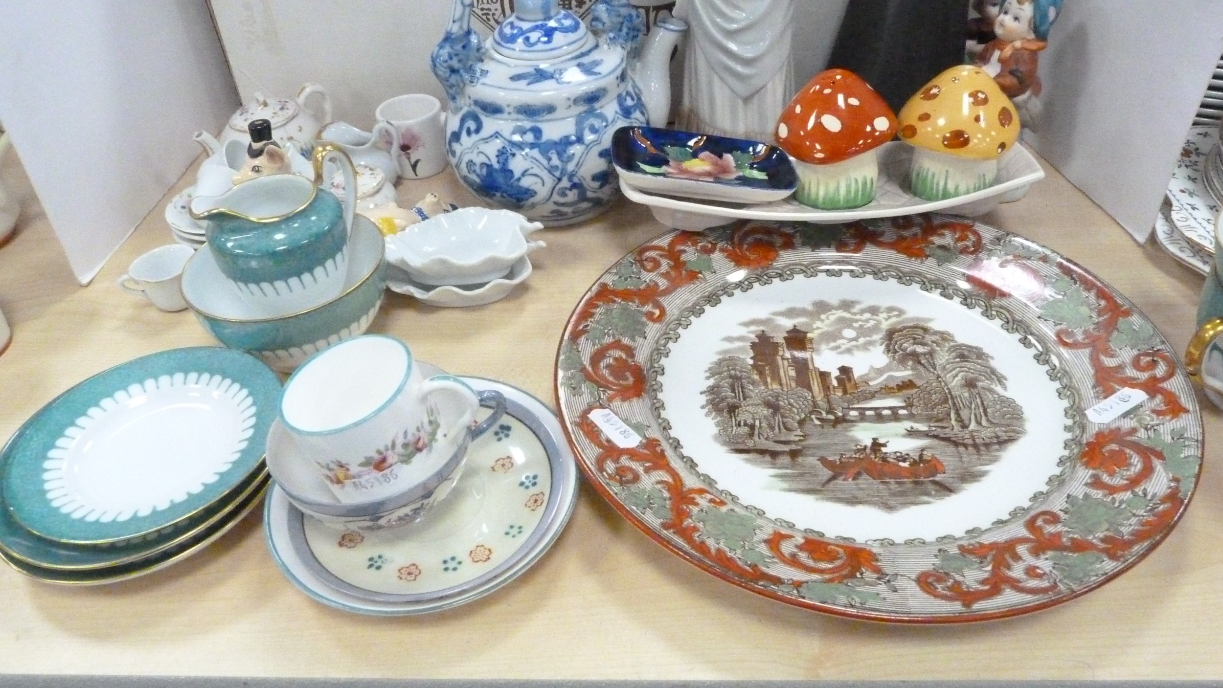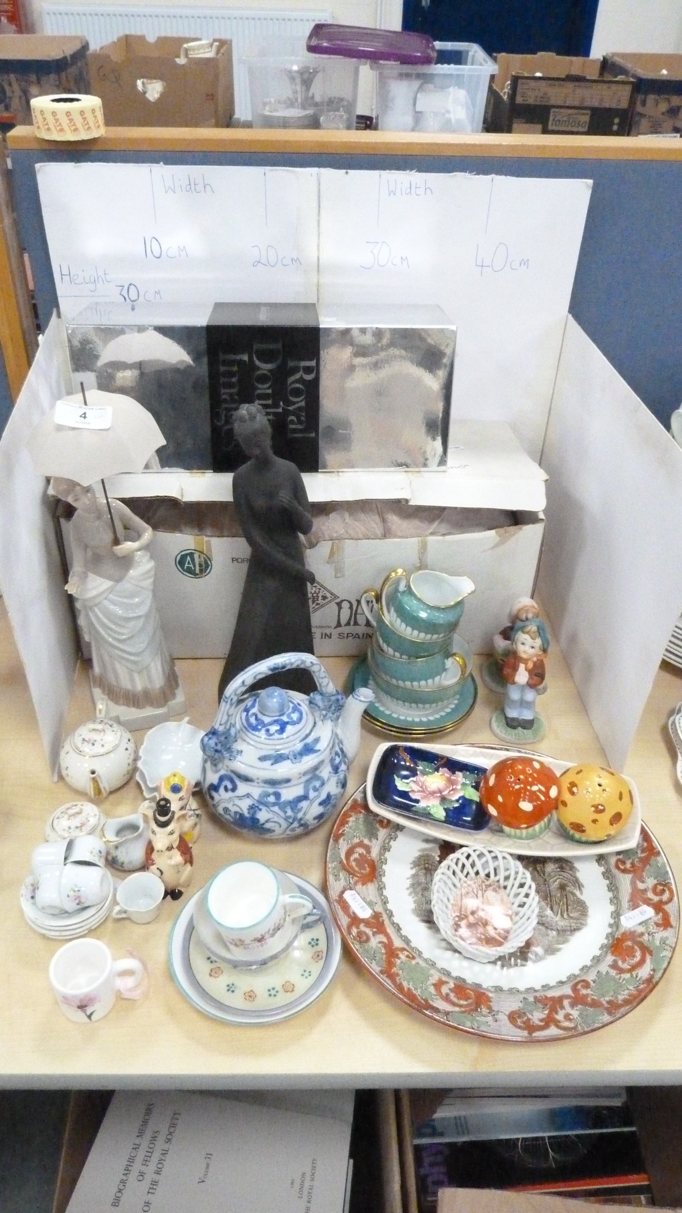 Royal Doulton boxed Images figure, Nao figure of a lady with parasol, boxed, 20th century Chinese blue and white teapot, miniature porcelain, cabinet cups and saucers, figures, plate, pair of Wade pig condiments etc.