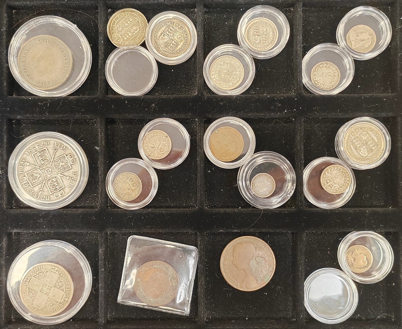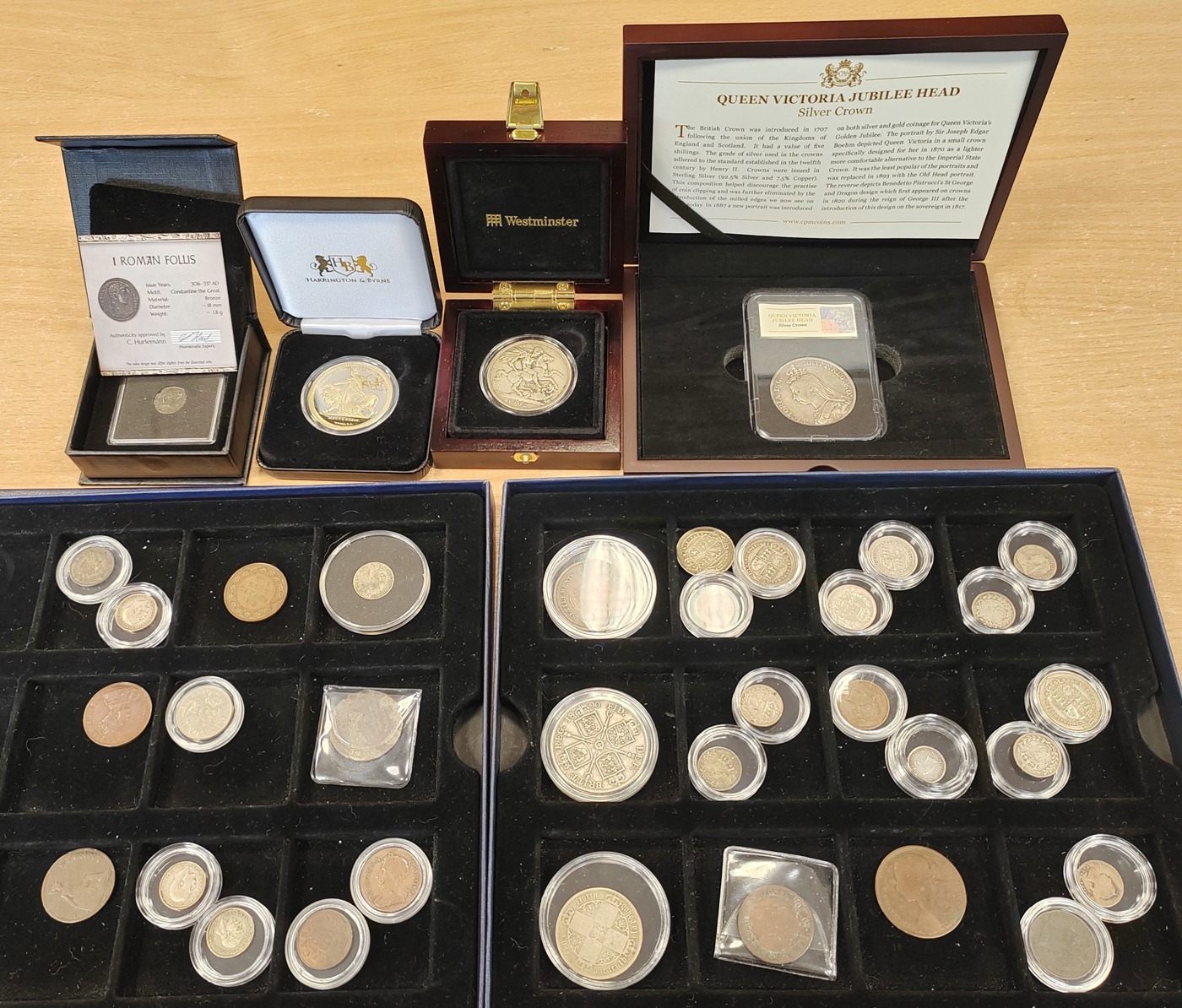 Collection generally fair to good fine with some better with 1887 crown boxed with certificate, 1902 in Westminster box, plus range of encapsulated coins with crowns, shillings, sixpence, silver threepence etc. plus 1 Roman follis boxed with certificate and Commemorative Coins for Circulation of The People's Republic of China 1984-1991 set. (½B)