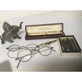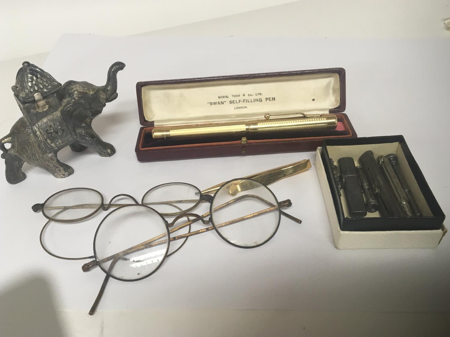 A cased Swan fountain pen a similar pencil an elephant table lighter and silver pencils and oddments.