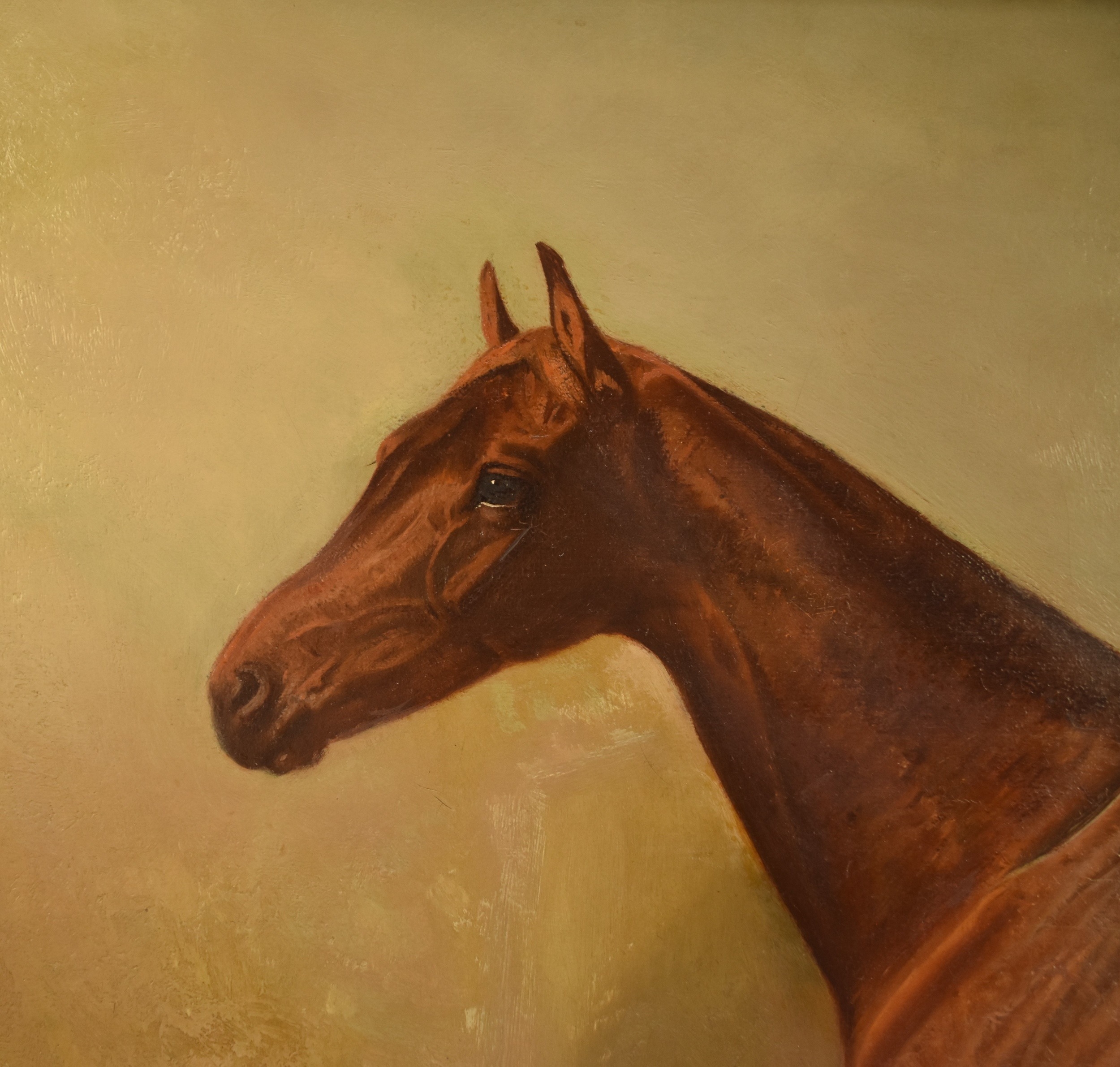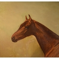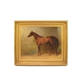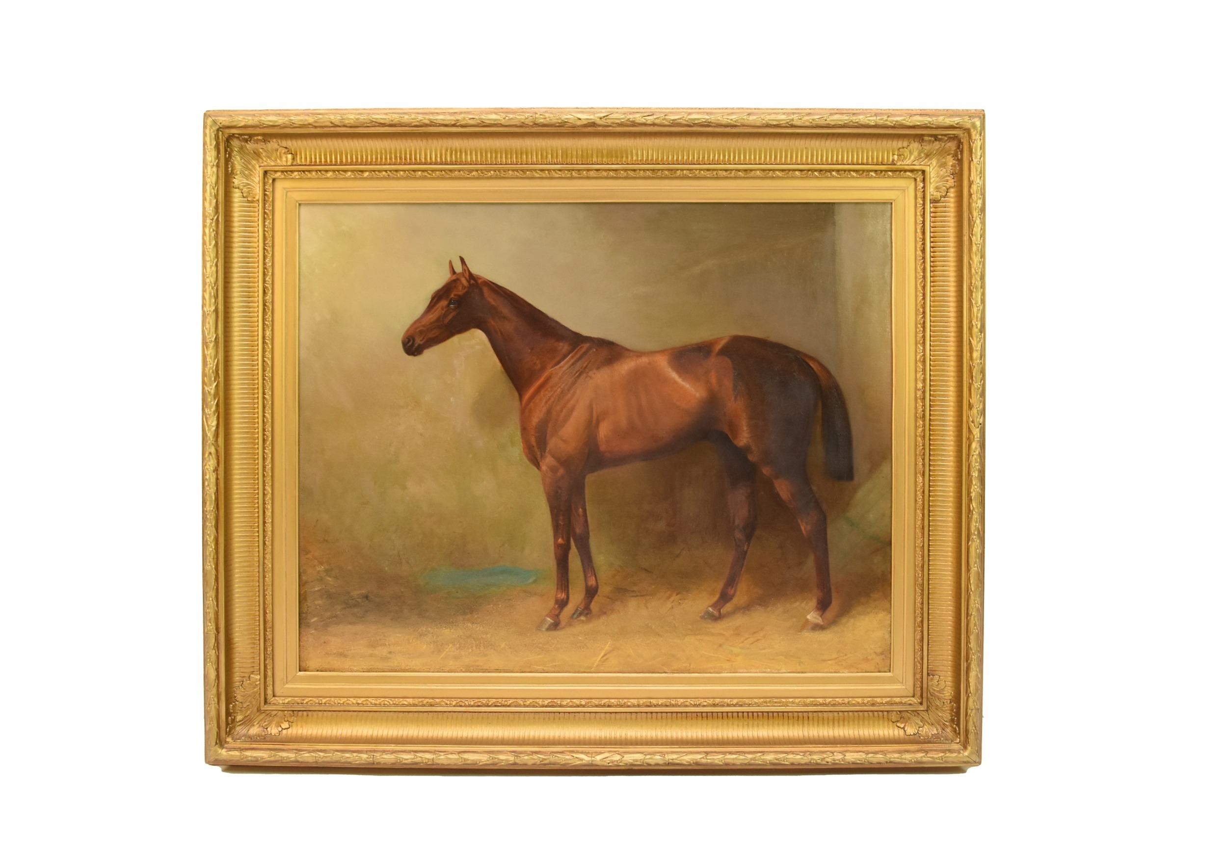 Arthur Louis Townshend (act. 1880-1912) Tristan, Racehorse Portrait in a loosebox, signed lower left, titled and dated 1887 on label to verso, oil on canvas, 65 x 83 cm, frame 89 x 106 cm Provenance: private Cheshire collection, old stencils and labels attached verso, handwritten note attached verso states the painting was sold at Christies 29th May '93 in the D. Cooper sale Notes: Tristan (1878-1897) was a thoroughbred racehorse who had a famously unpredictable temperment, he ran 51 and won 27 during his career between1880-1884. He was bred by Robert St Clair-Erskine, 4th Earl of Rosslyn, owned by C.J. Lefevre and trained by Tom Jennings at Newmarket. He was a flat racing horse who won at Epson, Royal Ascot, Hardwicke Stakes amongst numerous others, interestingly Tristan was also raced on the international circuit and achieved impressive wins at Grand Prix de Deauville. He was mostly ridden by jockey George Fordham. In 1884 Tristan was retired as a stud.