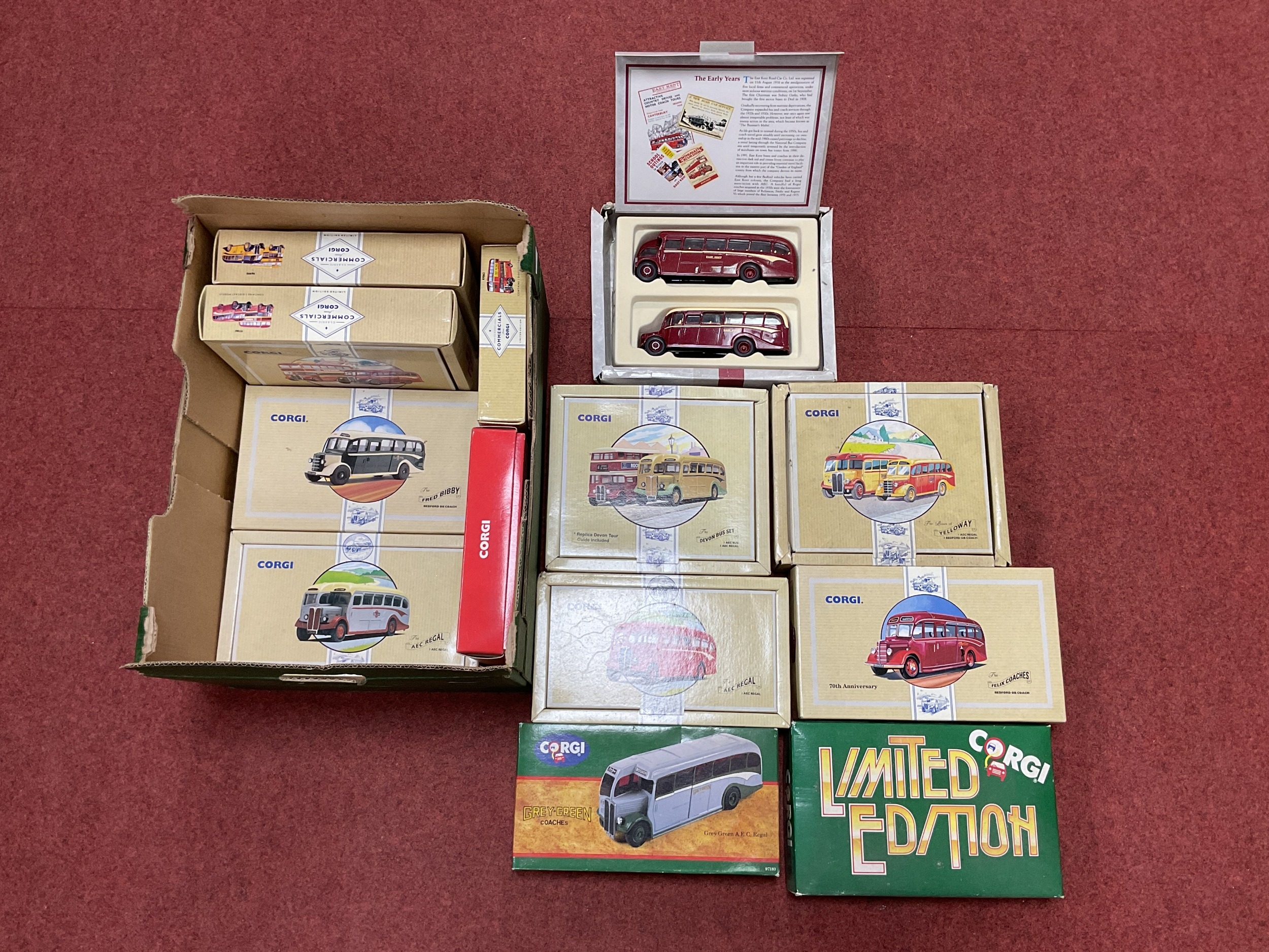 Eighteen Diecast model buses by Corgi, including Classic Commercials #97106 The Fred Bobby Bedford OB Coach and #96990 The AEC Bus Set 1 AEC Bus 1 AEC Regal, boxed. Faults to some boxes and a musty odour noted. All models have previously been displayed, with some faults noted. [382837] [217967]