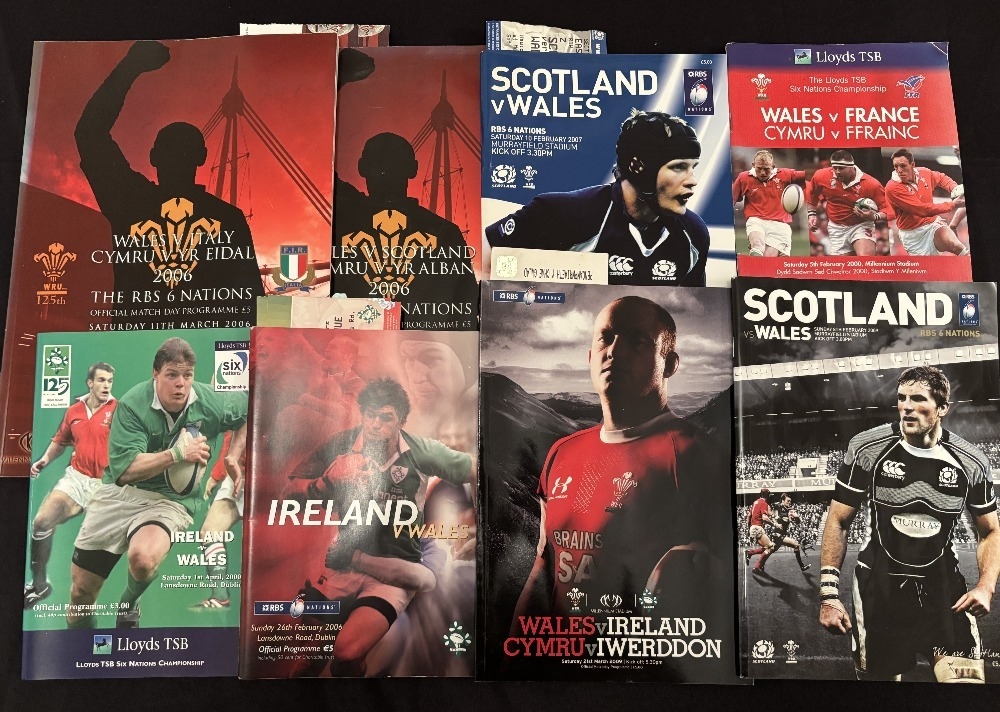 2000 onwards Six Nations Rugby Programmes, some with Tickets (8+): Ireland v Wales, 2000 and 2006 (w/two tickets); Scotland v Wales 2007 (w/ticket] and 2009; Wales v Ireland 2009 (w/ticket); Wales v France, 2000; Wales v Italy 2006; and Wales v Scotland 2006 (w/two tickets). Plus 2 tickets for Wales v England 2009. G/VG.