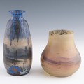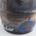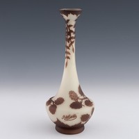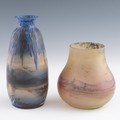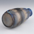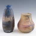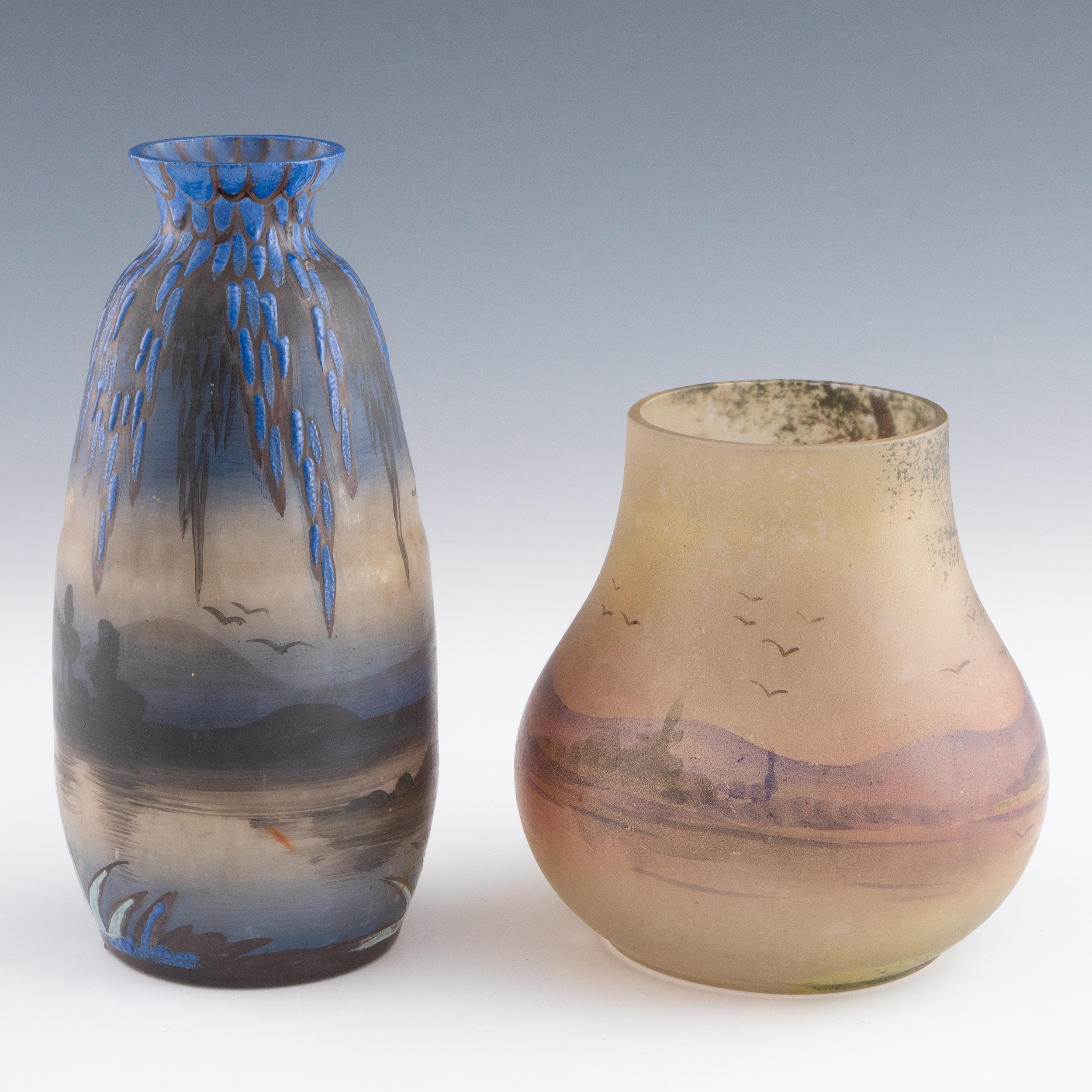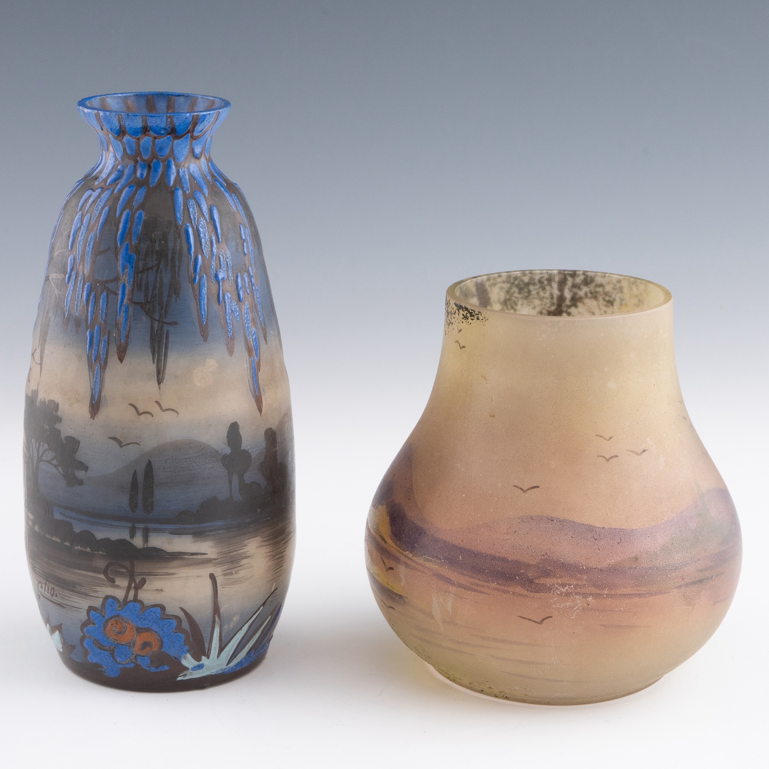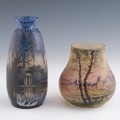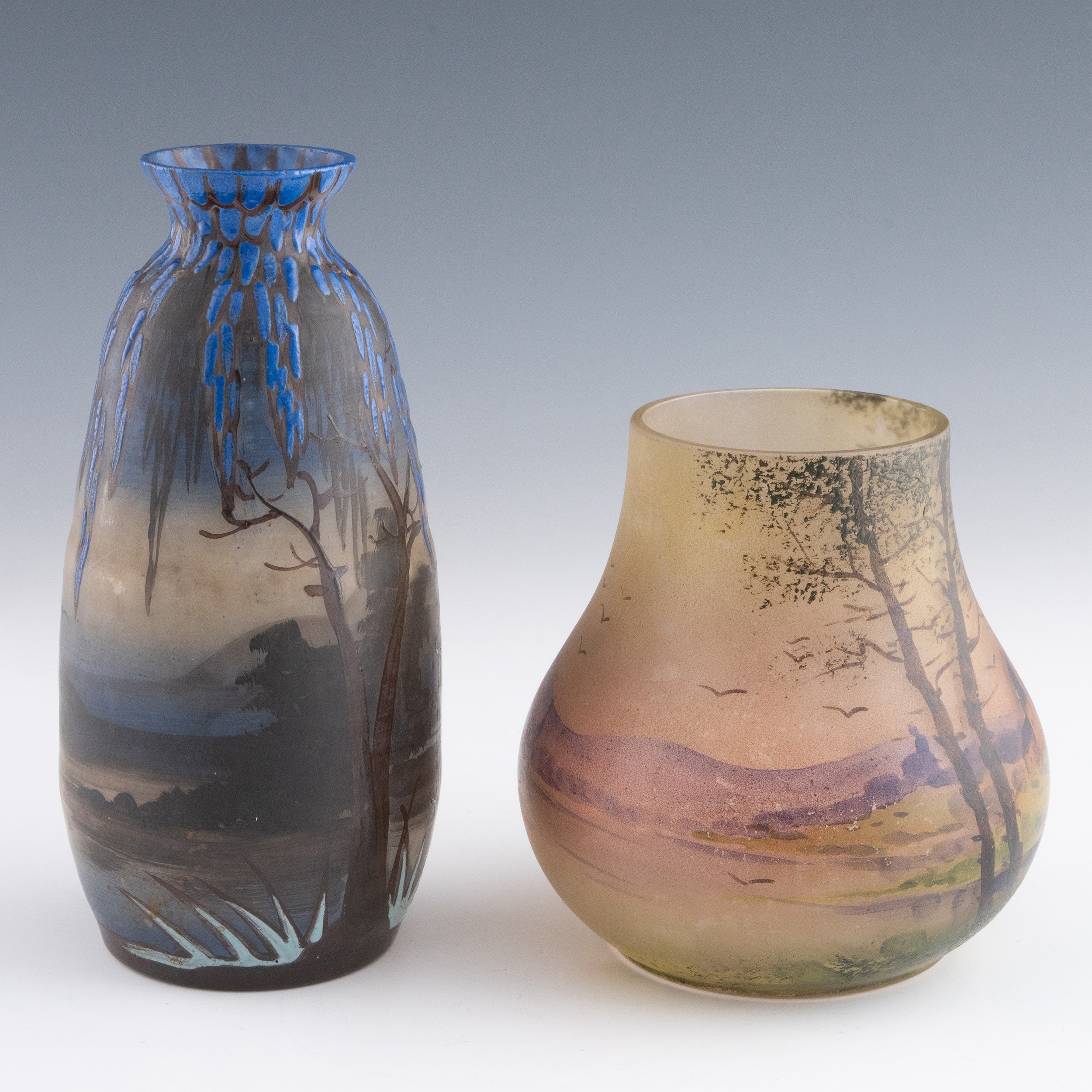 A 1920s French Art Nouveau cameo polychrome glass vase, decorated with thick deep blue enamels cascading from the rim and from branches of a willow tree, base with further turquoise and blue enamels outlining flowers and waterside plants, background depicts a neoclassical temple at the edge of a wooded lake and hills in the distance, signed 'CLEO', 16.5cm; together with a French Art Nouveau small cameo vase decorated with a similar lakeland scene with a castle, signed 'P. Jost', 11.5cm height. (2) (LDC12028) (LDC12025)