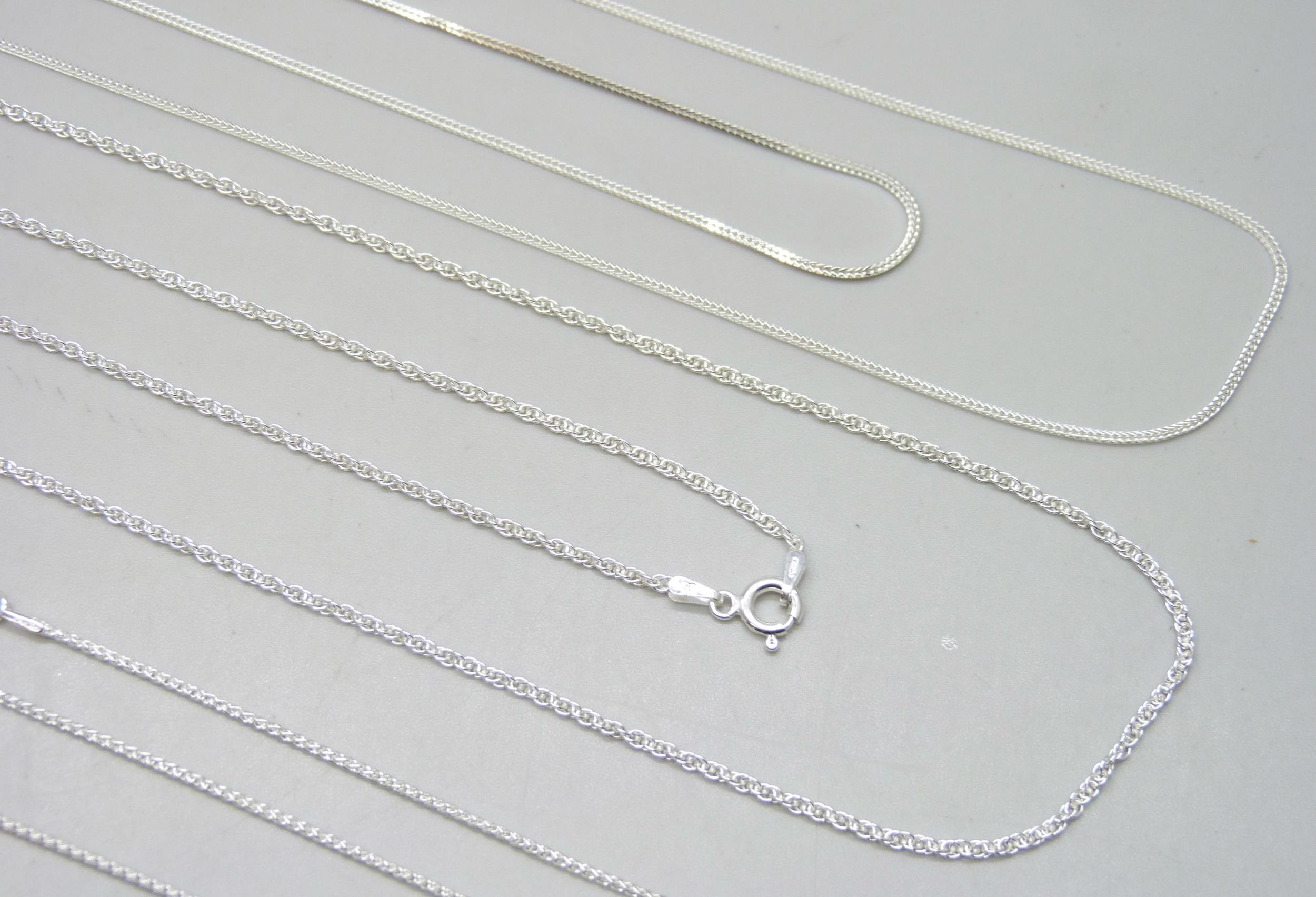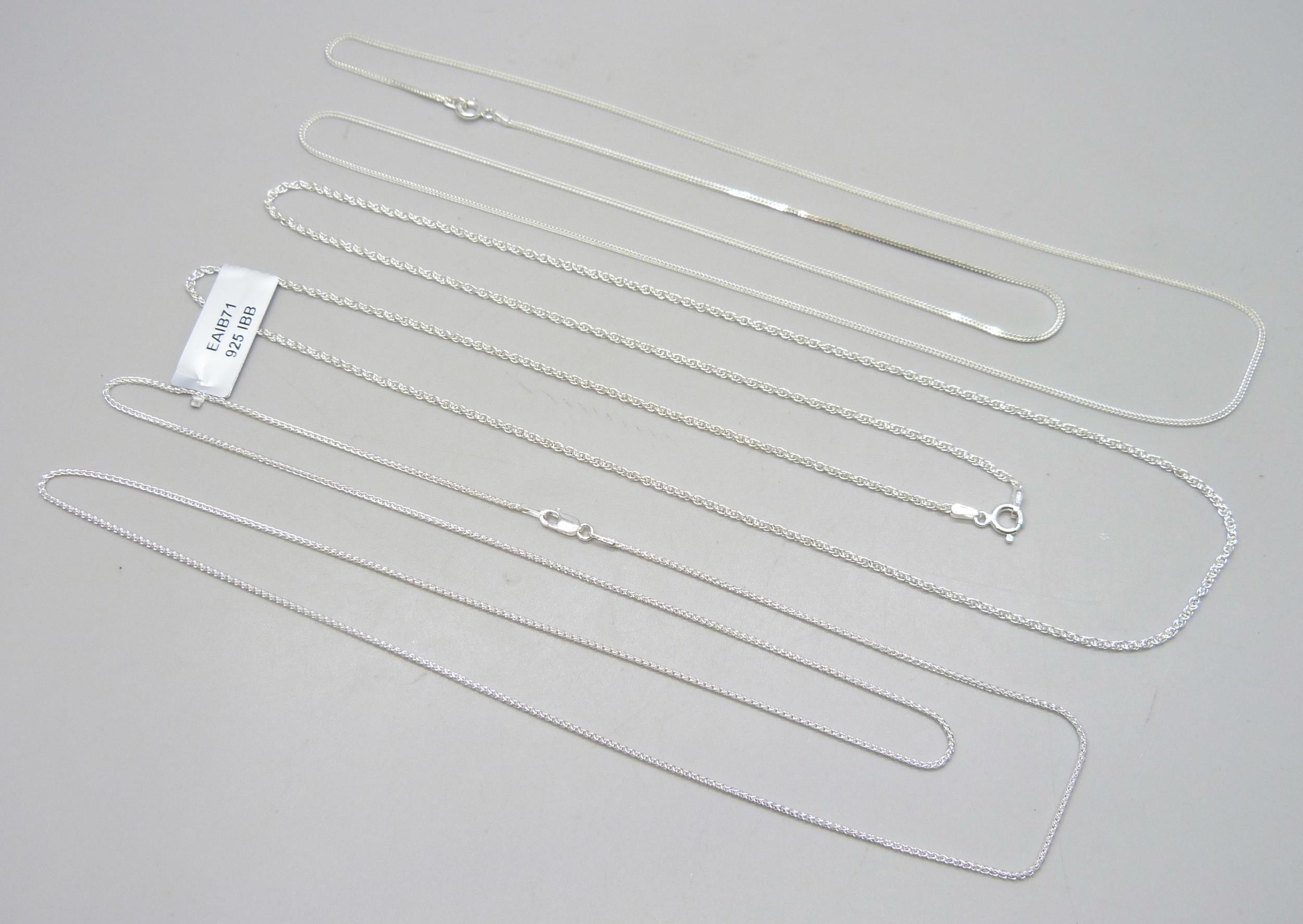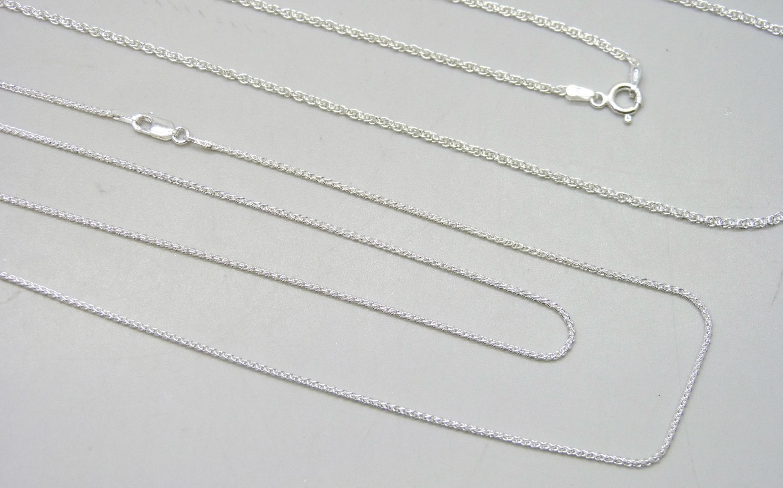 Three 30 inch sterling silver necklaces including curb chain, Prince of Wales and mini Spiga chain, 12g total