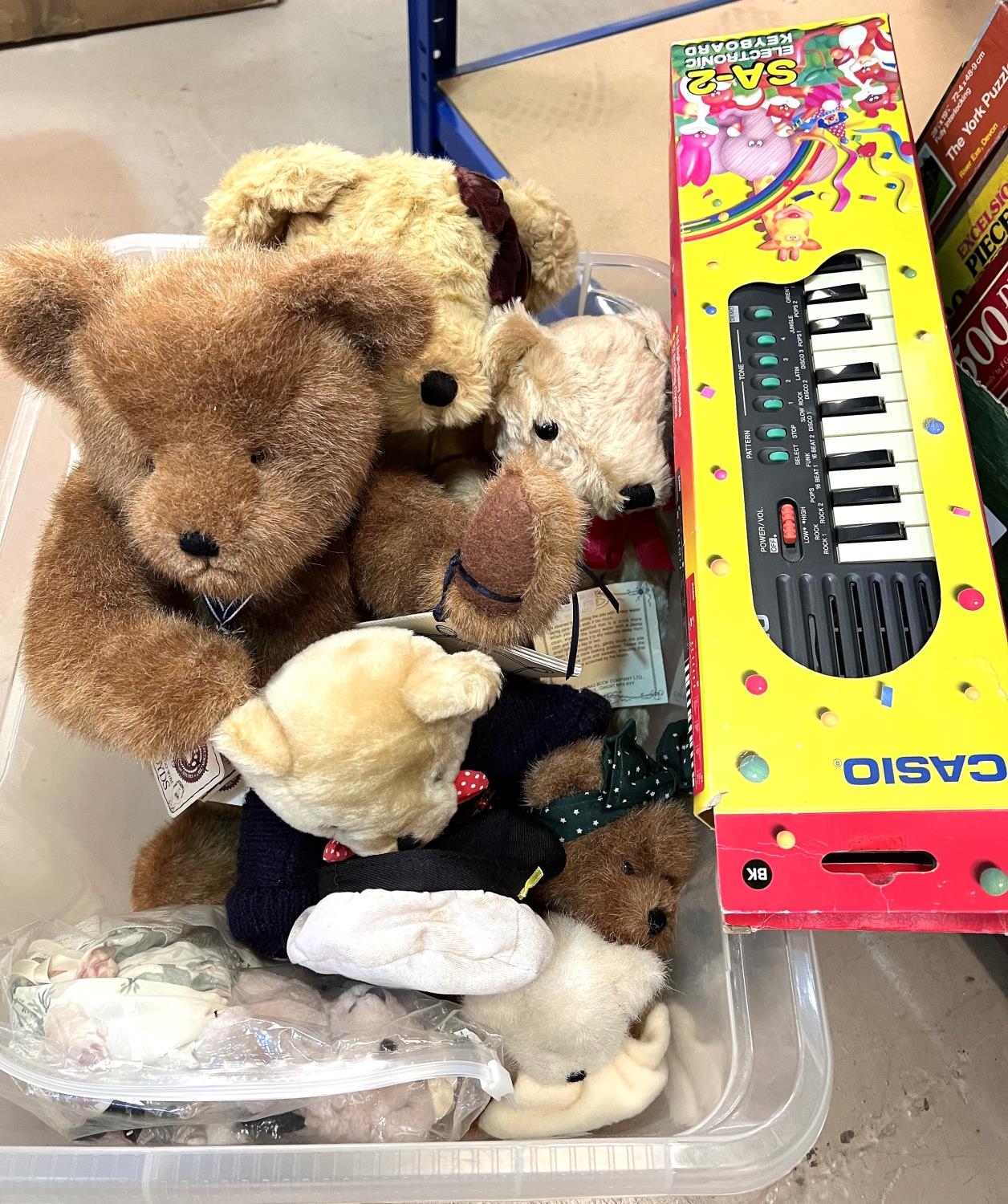 A Dean's Luxury Teddy Bear, two Boyds teddy bears, other various bears and a mini keyboard