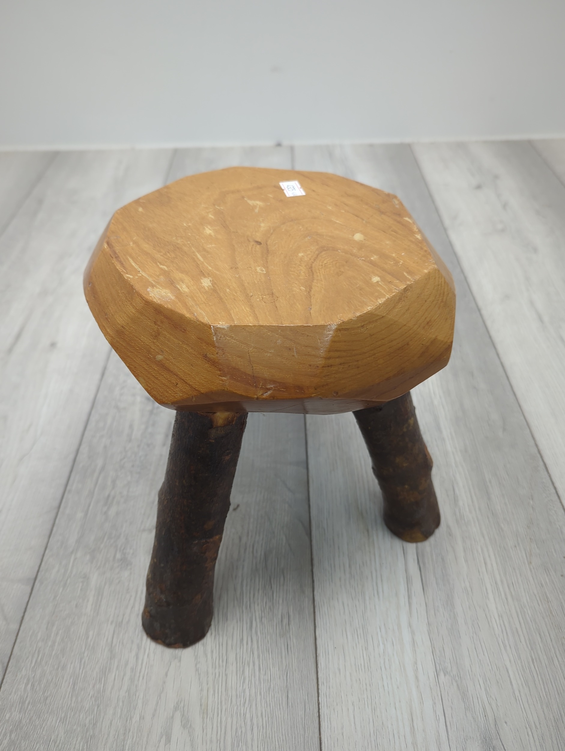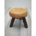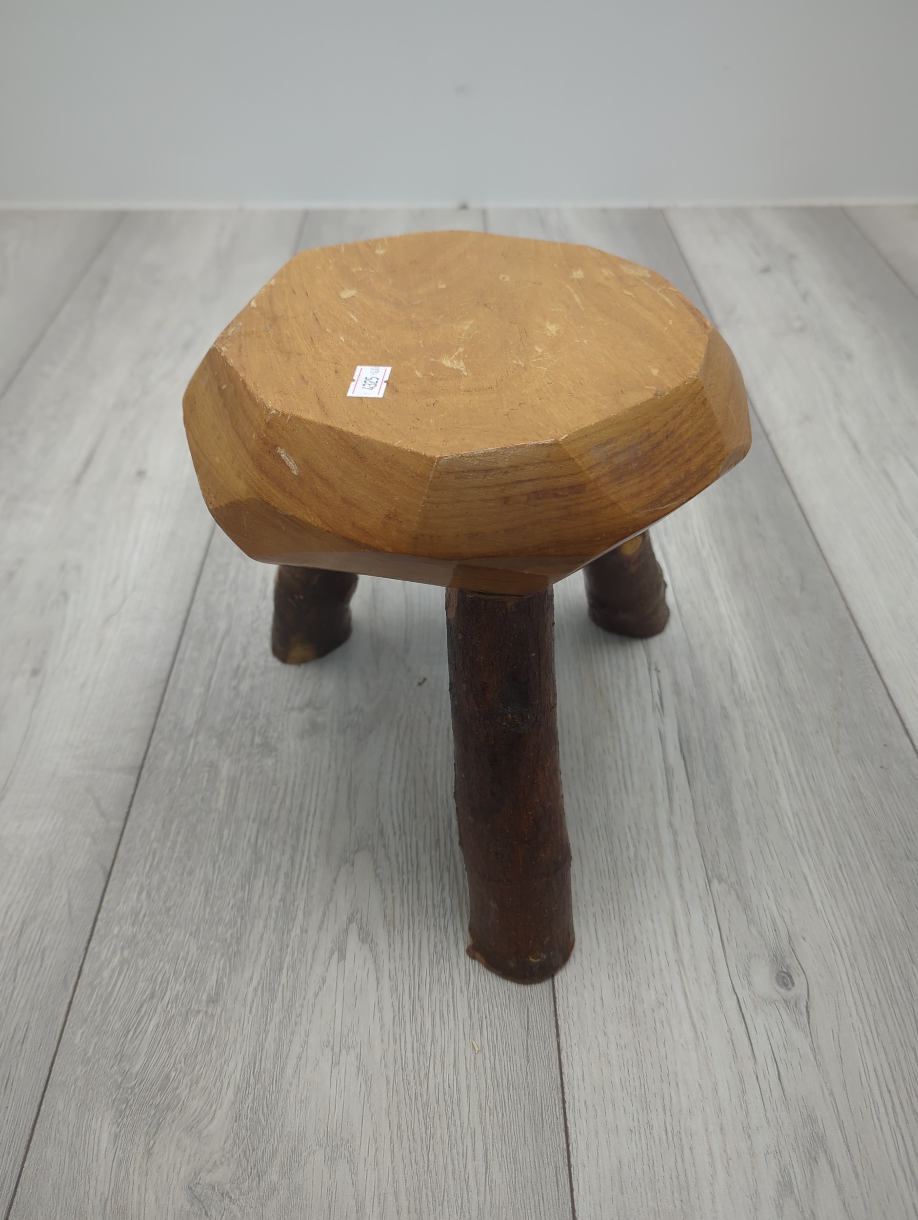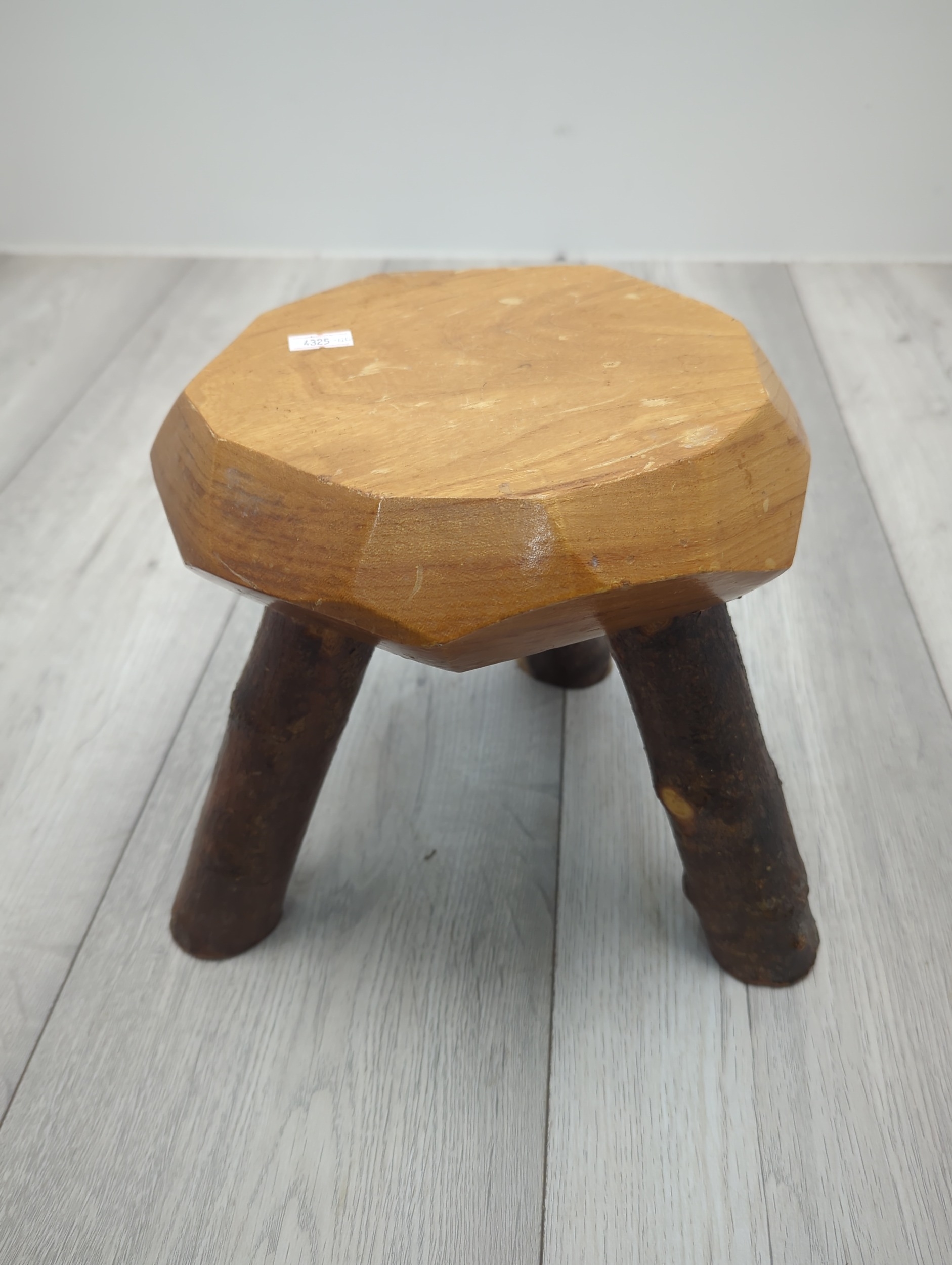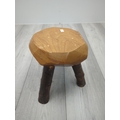 This item is a rustic wooden stool featuring a round seat with a natural wood finish. The stool is supported by three sturdy legs, each showcasing a natural texture and appearance. Its simple yet robust design makes it suitable for various indoor settings, ranging from casual to rustic decor themes.