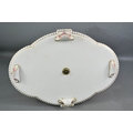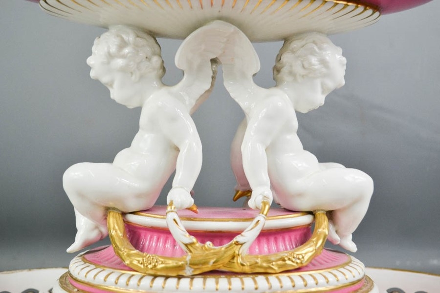A large Minton tazza centrepiece, with pink ground, modelled with cherubs, blue and white oval to the front, 30cm high, A/F.