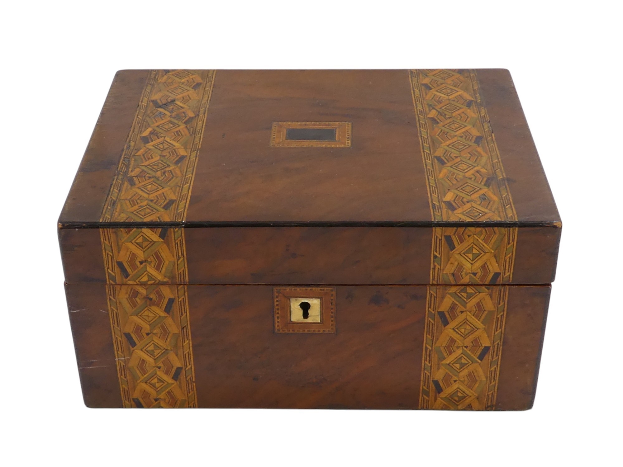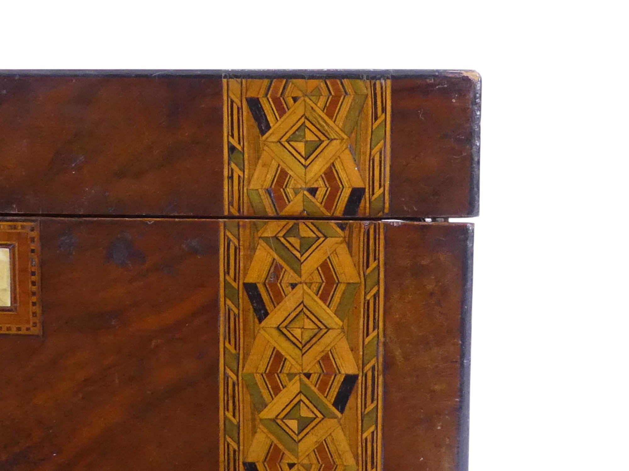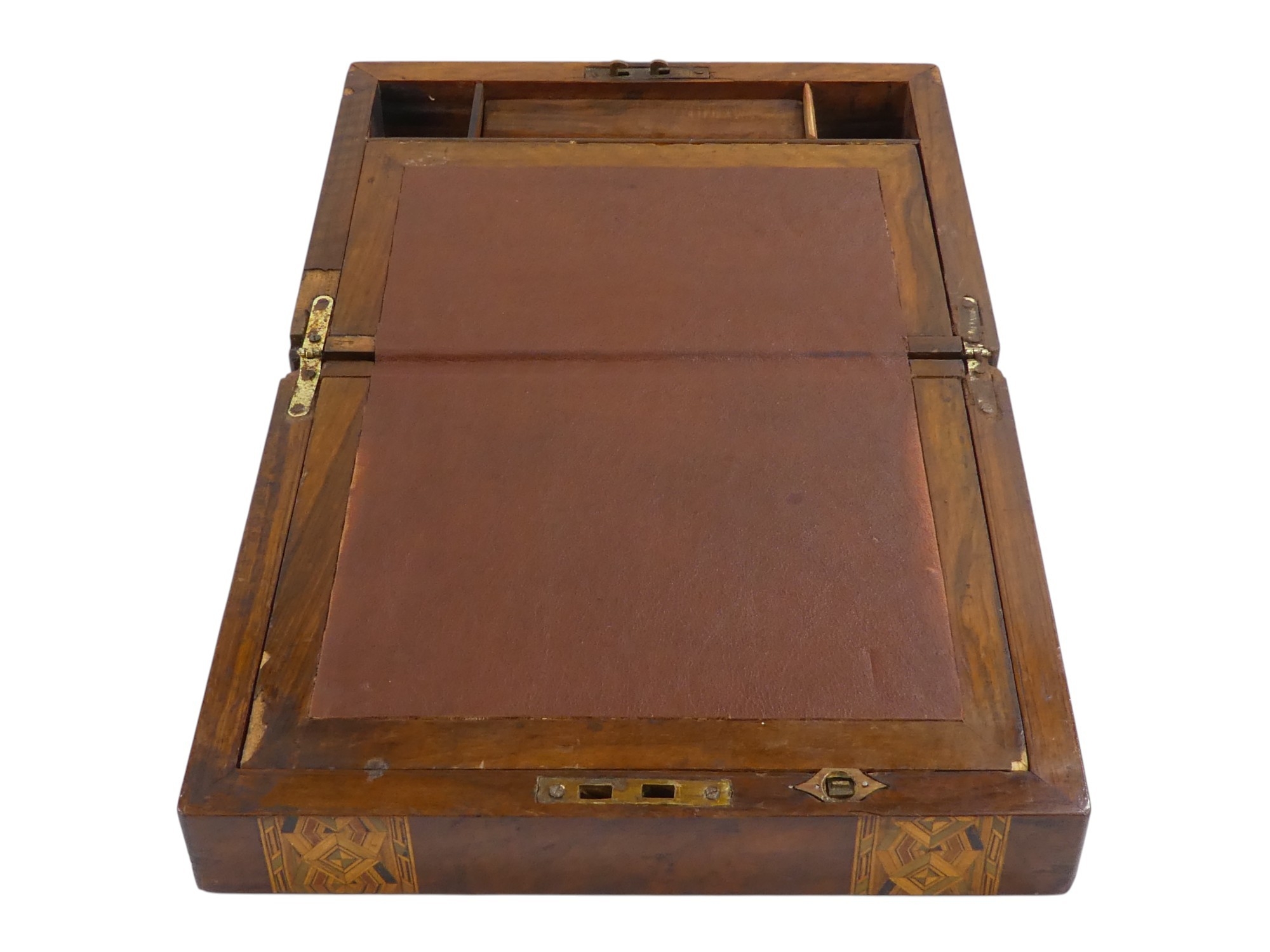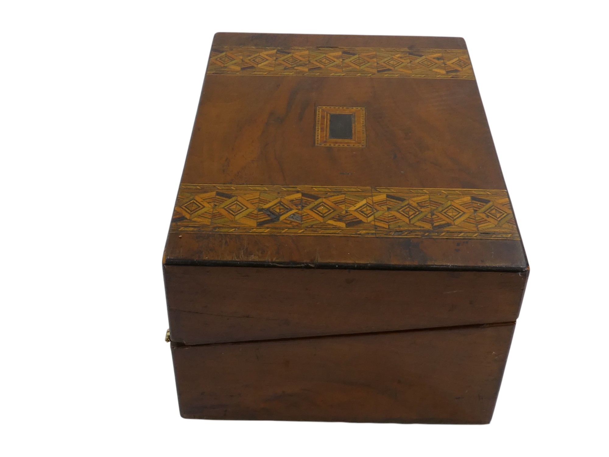A Victorian walnut writing slope - with Tunbridgeware bandin...