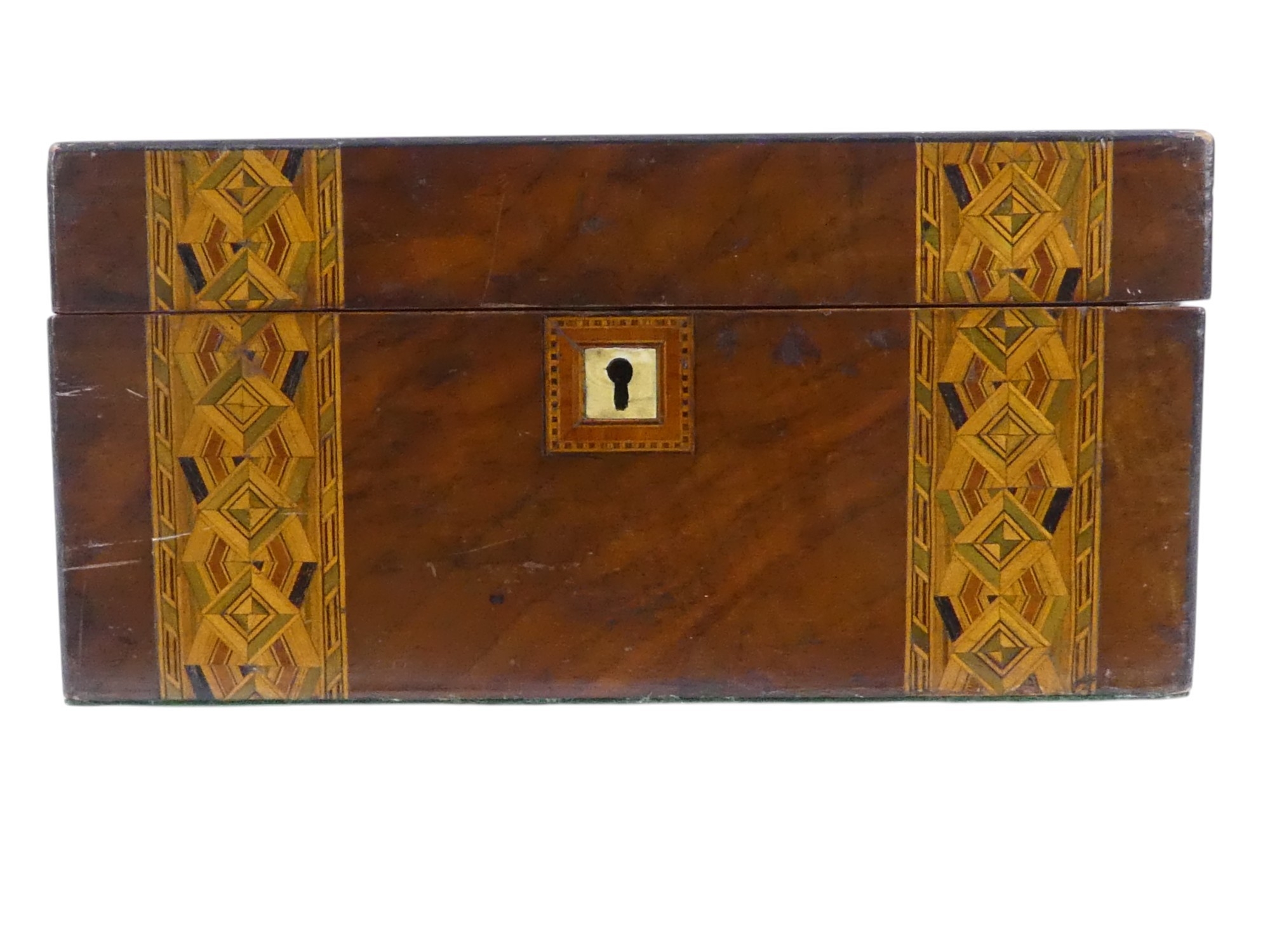 A Victorian walnut writing slope - with Tunbridgeware banding, with a brown leather writing surface, together with key, 30cm wide.