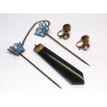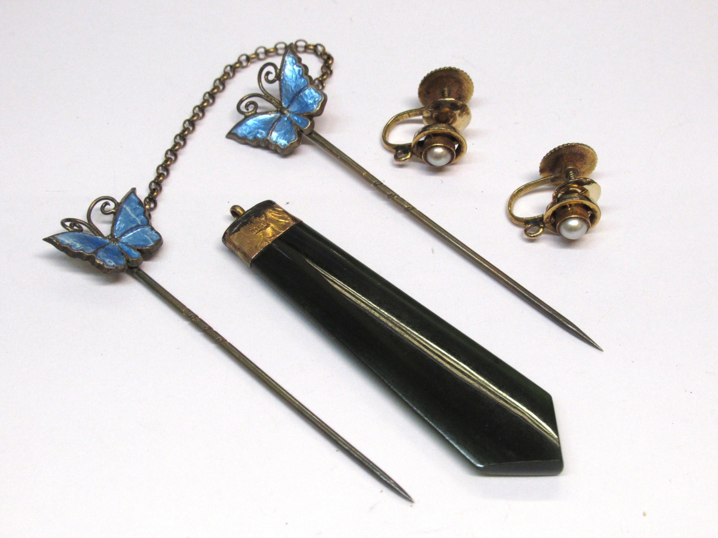 Pair of silver and enamel butterfly stick pins, 9ct gold mounted jade pendant and a pair of yellow metal cultures pearl inset earrings