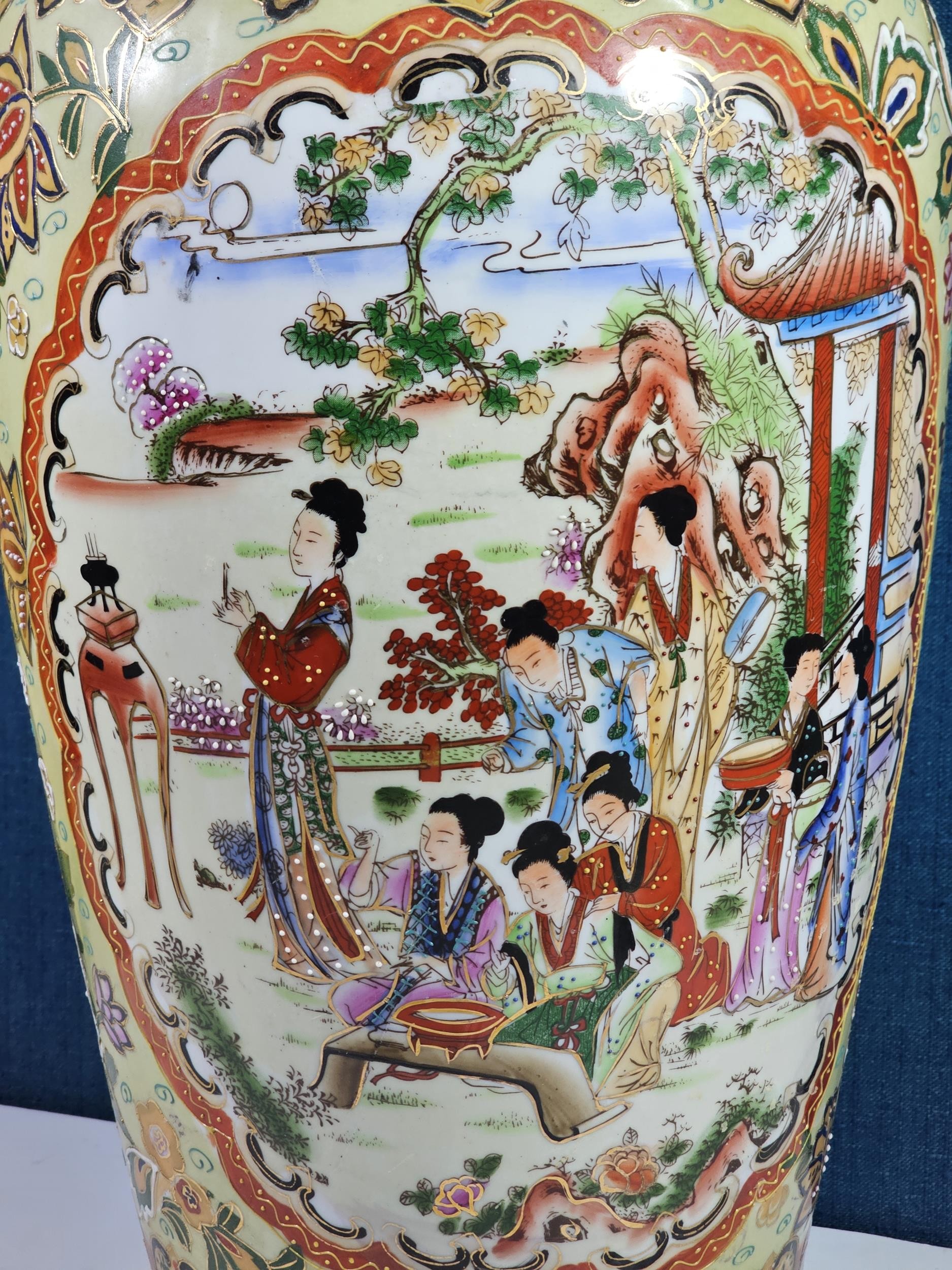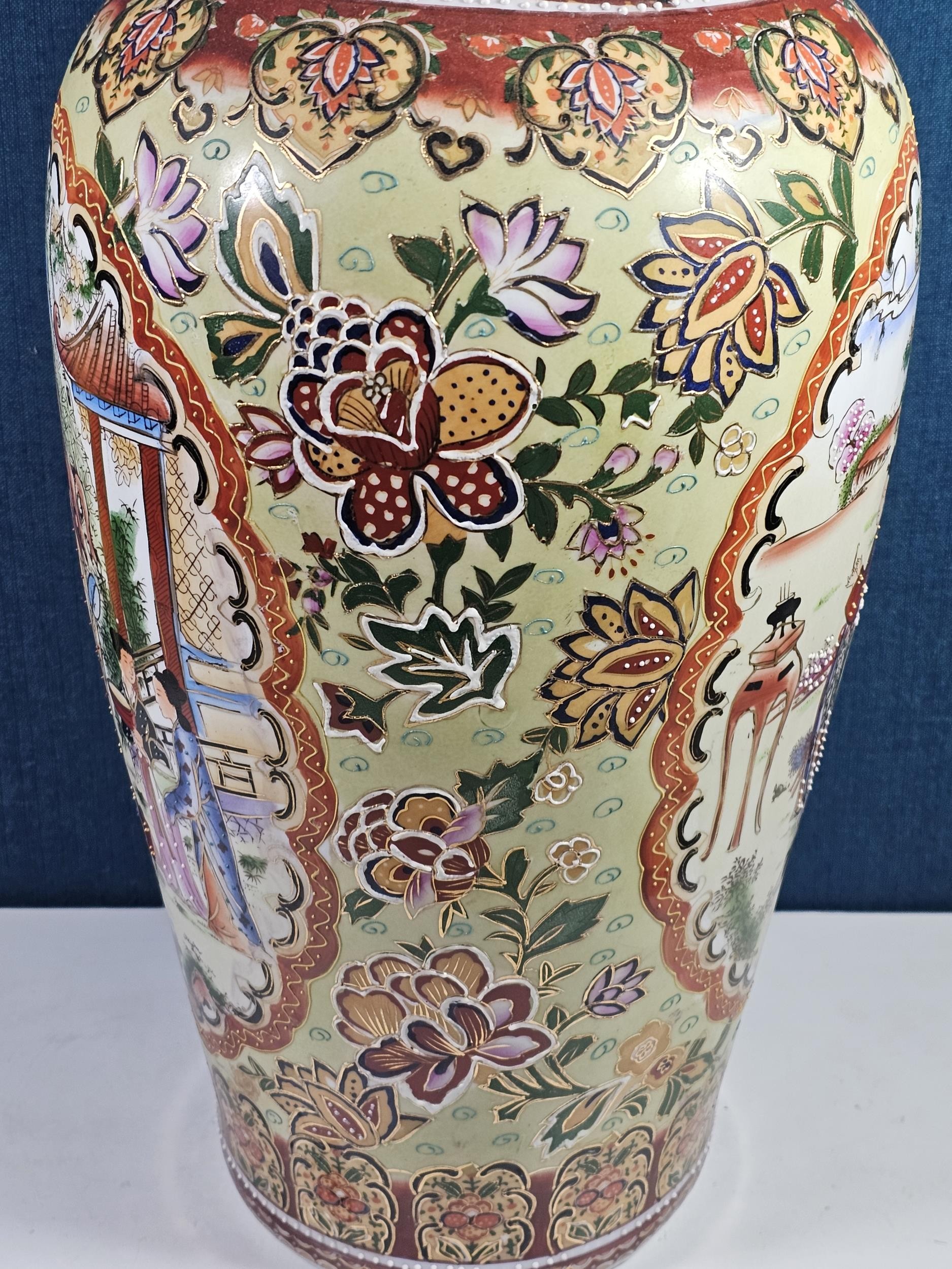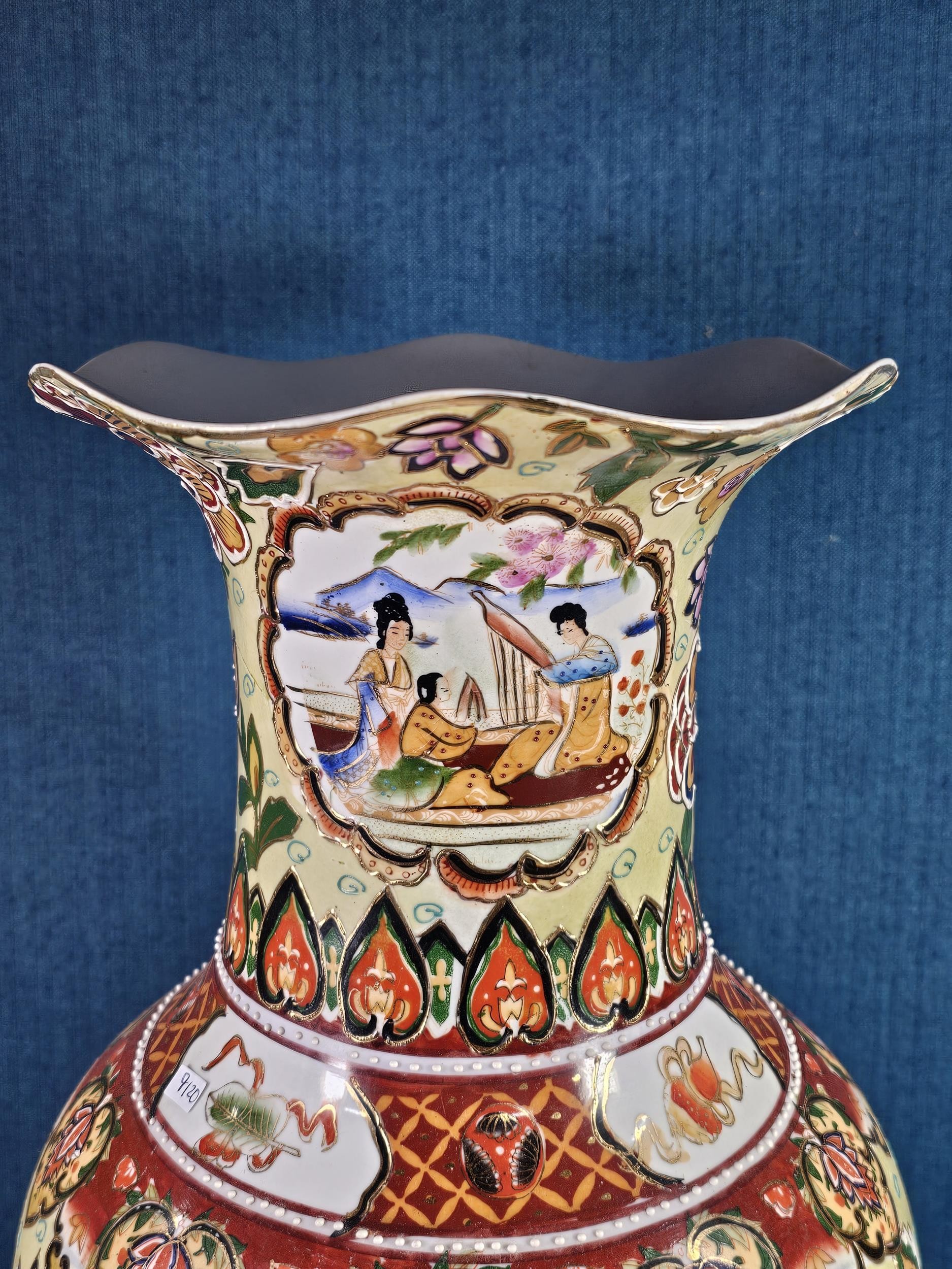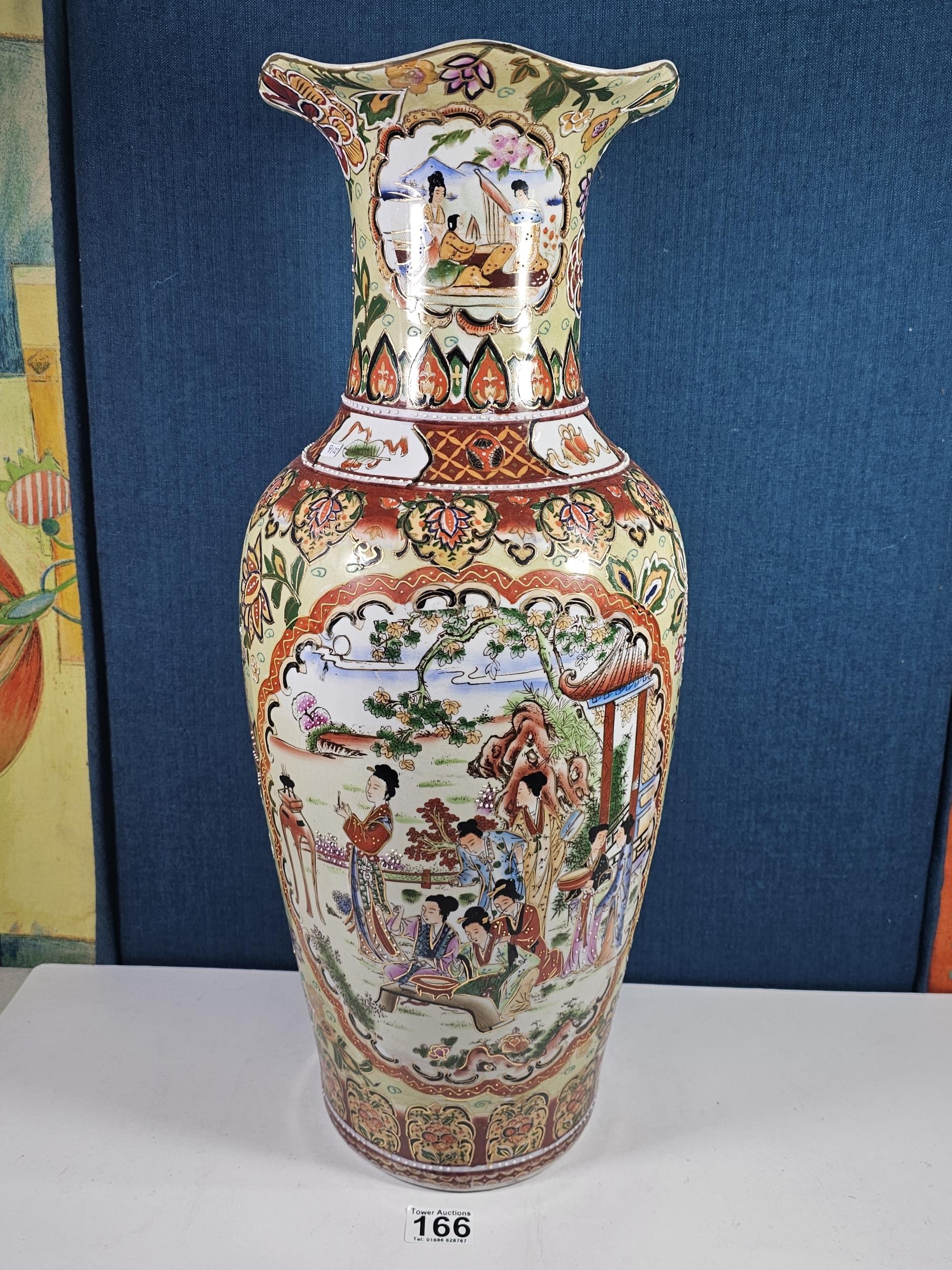 Large and impressive hand painted and decorated Satsuma style vase, the vase depicts an oriental ceremony to the centre and floral decoration around the vase, there is a red makers stamp to the base, the vase is of impressive proportions, has a height of 61cm and a diameter of 22cm