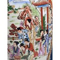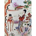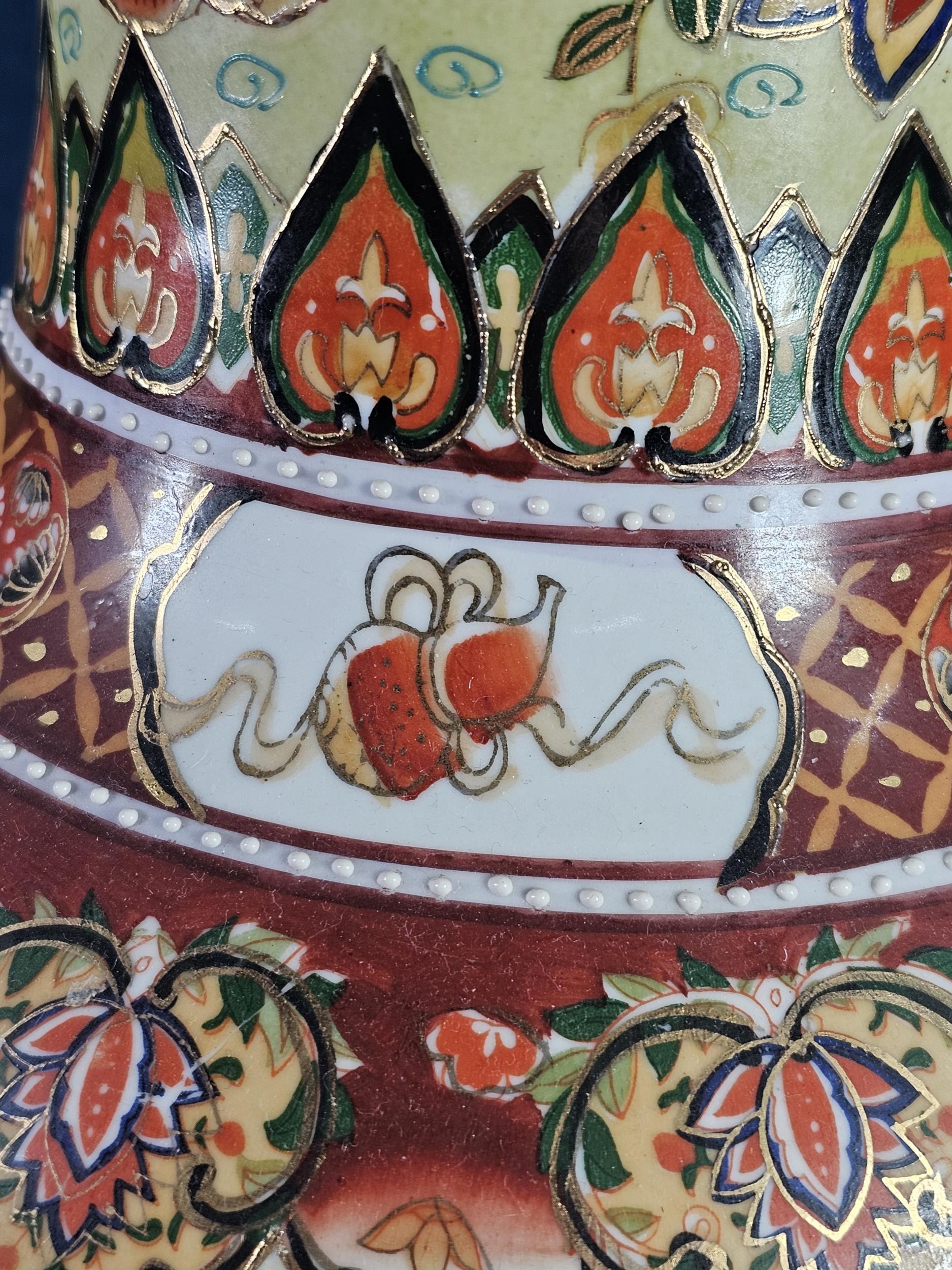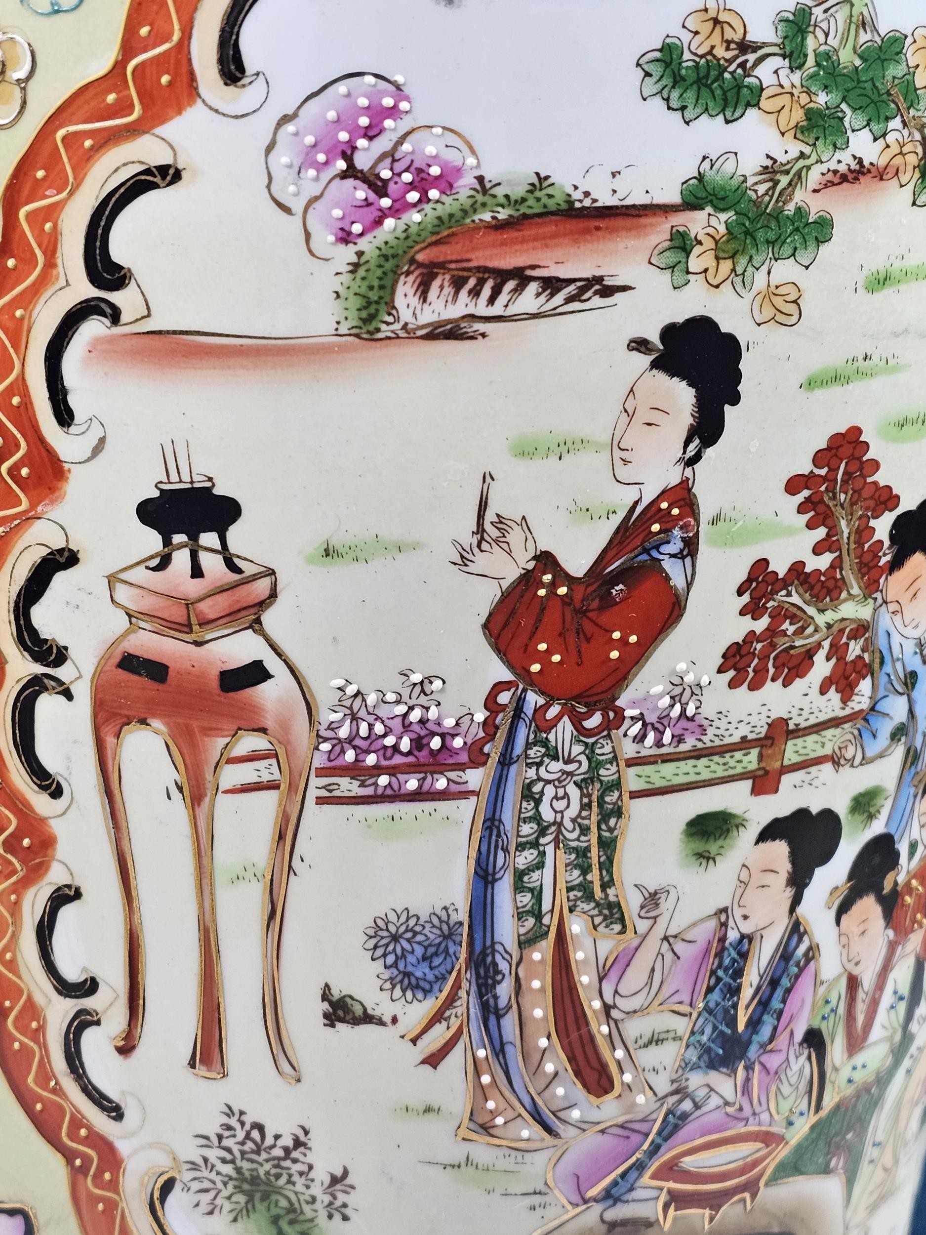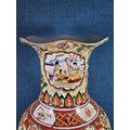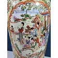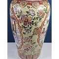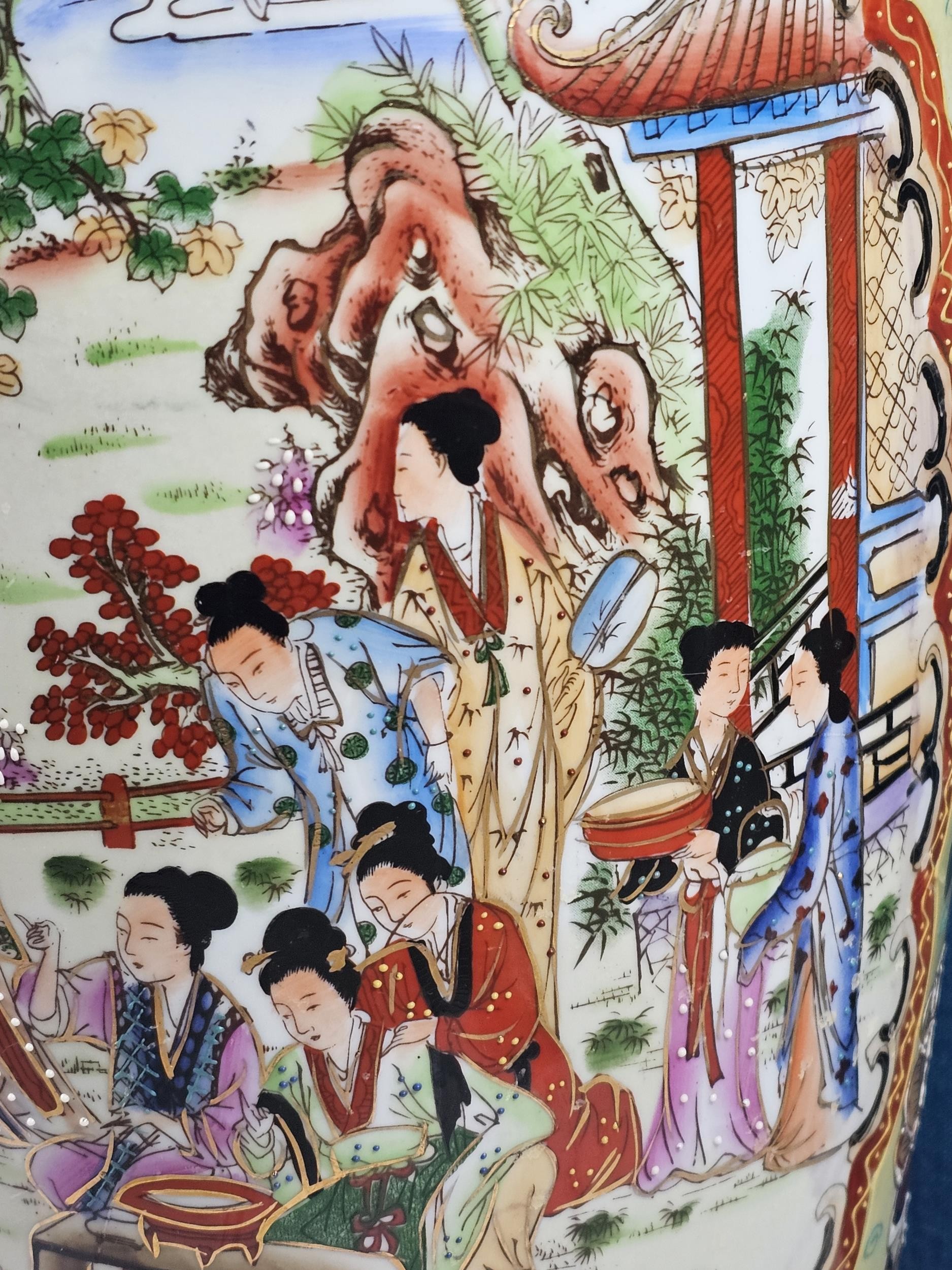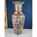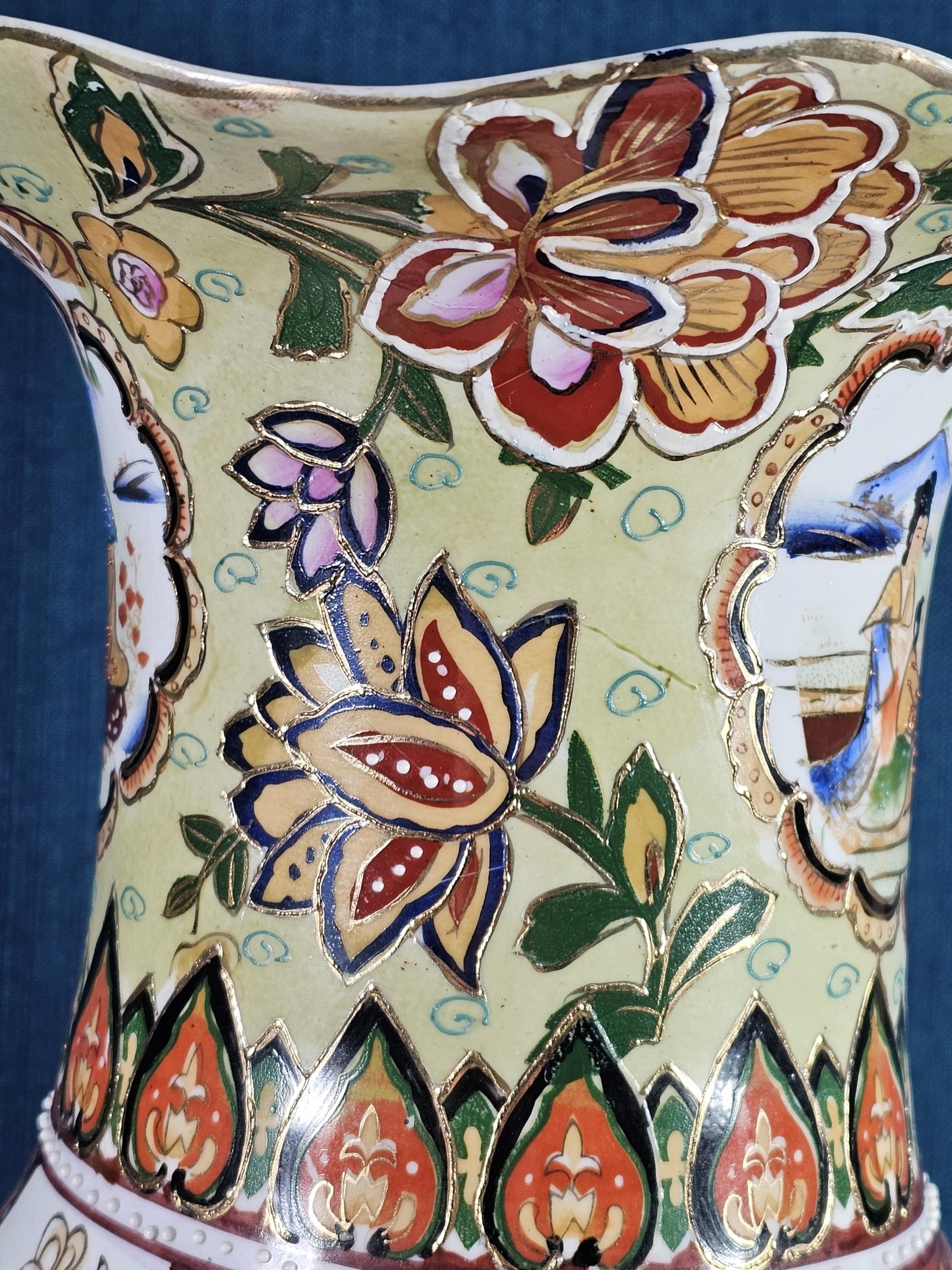 Large and impressive hand painted and decorated Satsuma style vase, the vase depicts an oriental ceremony to the centre and floral decoration around the vase, there is a red makers stamp to the base, the vase is of impressive proportions, has a height of 61cm and a diameter of 22cm