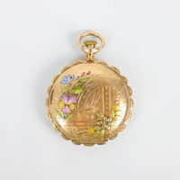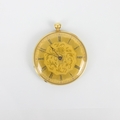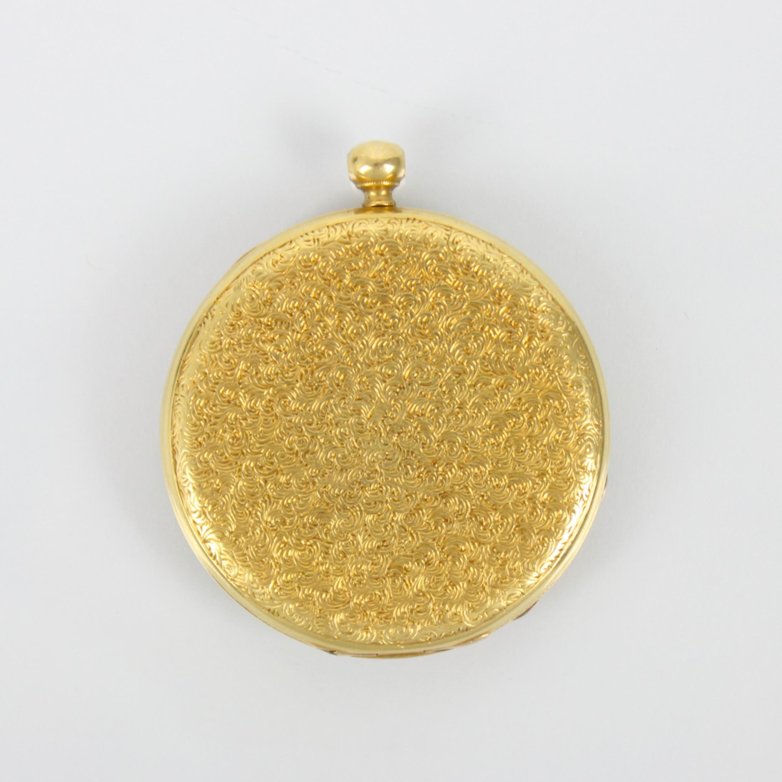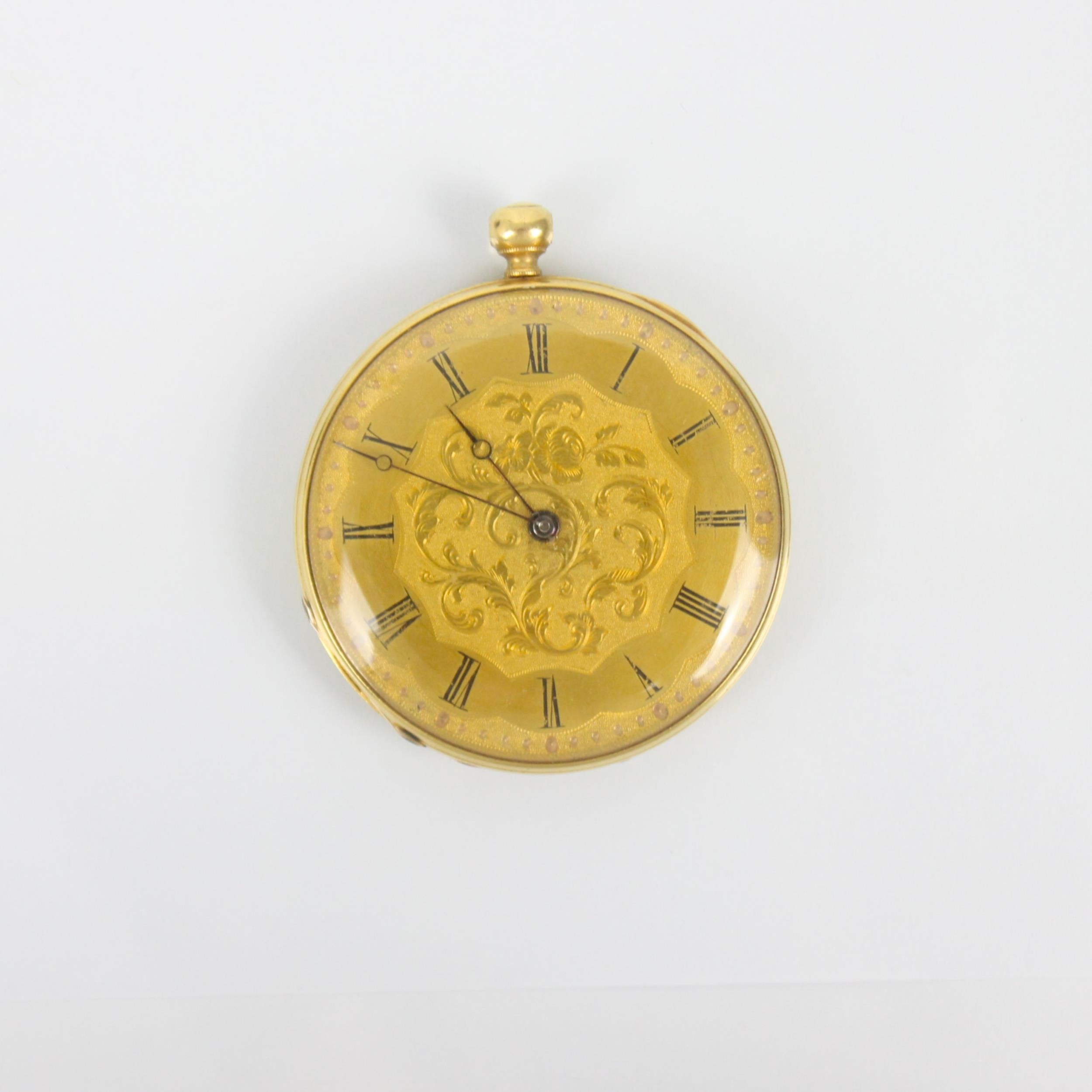 A 19th century continental yellow metal ladies pocket watch, the gold coloured dial with Roman numerals and florally engraved centre, set to engraved case, stamped to interior '15517 Enchappement a cylindre huit trous ru bis - aiguille' and 'No 157 Regent St, London' stamped ‘18k’ to interior of case, 3.9cm wide, gross weight 38gms (including movement) (at fault)