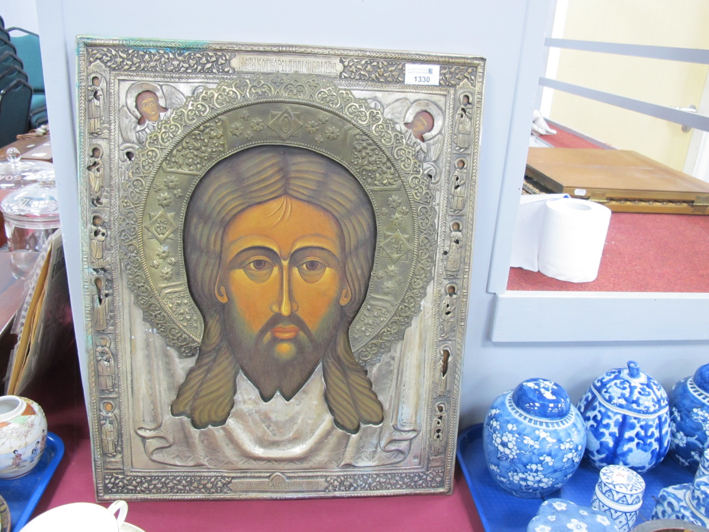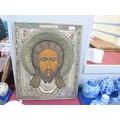 Icon - hand painted male bust, with many smaller images to surround set within silver plated pierced rectangular frame and brass halo, 53.5 x 44cm