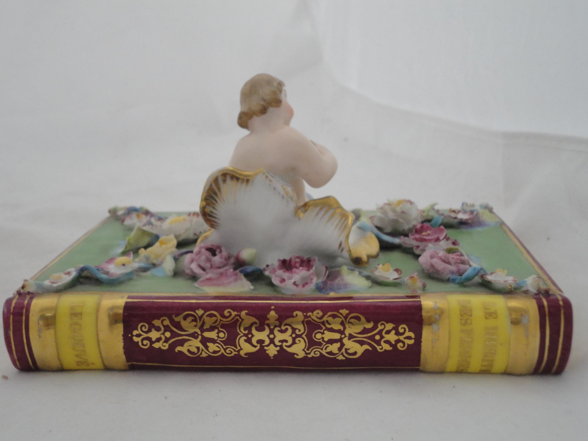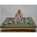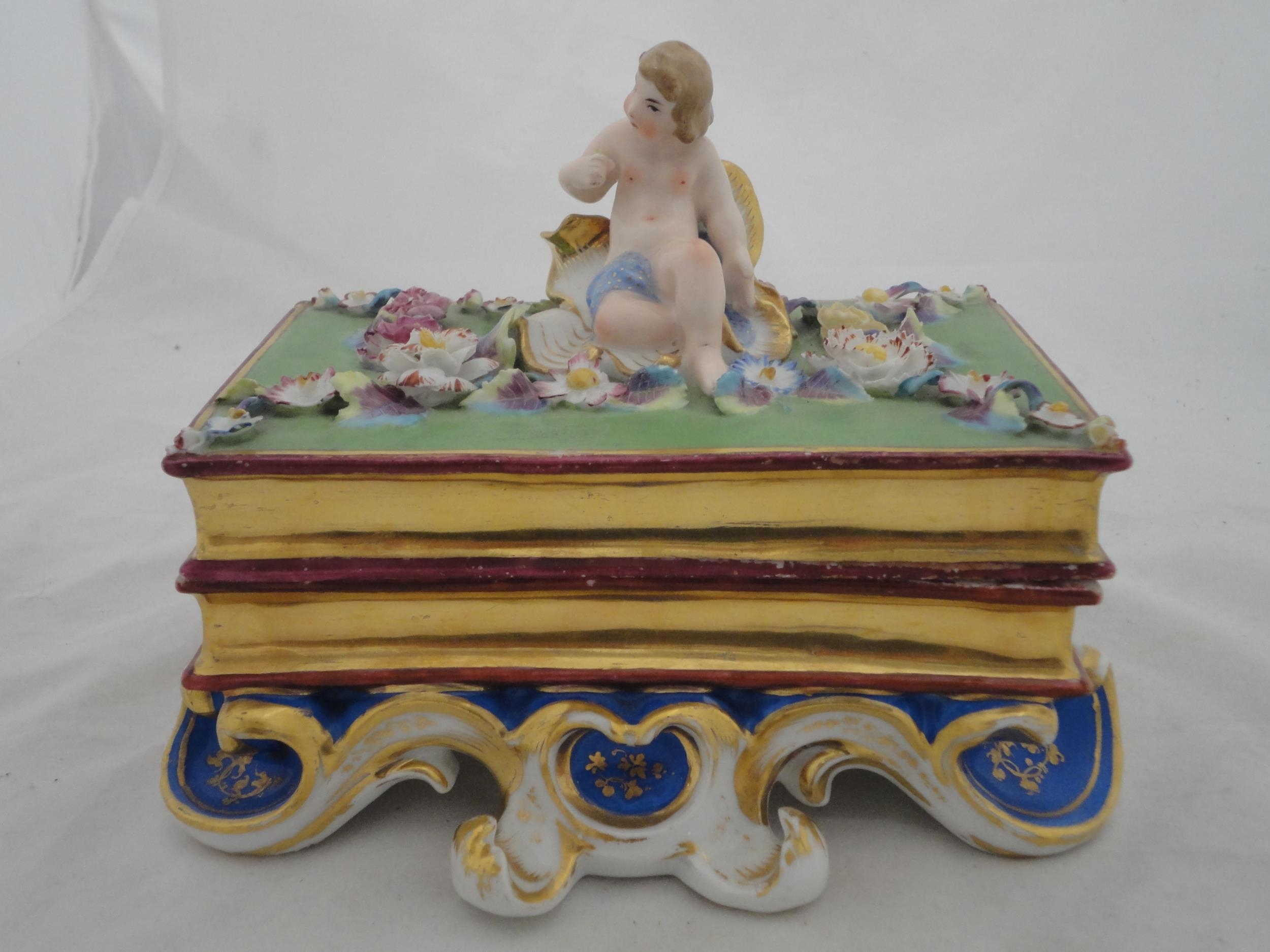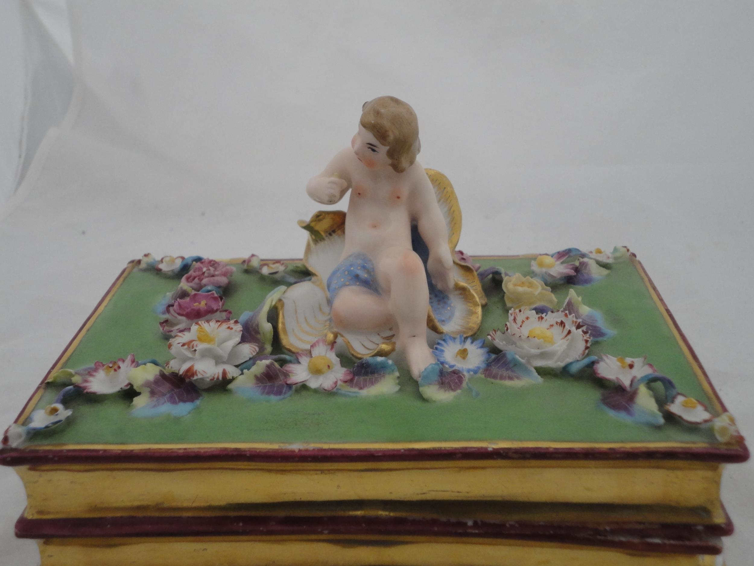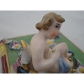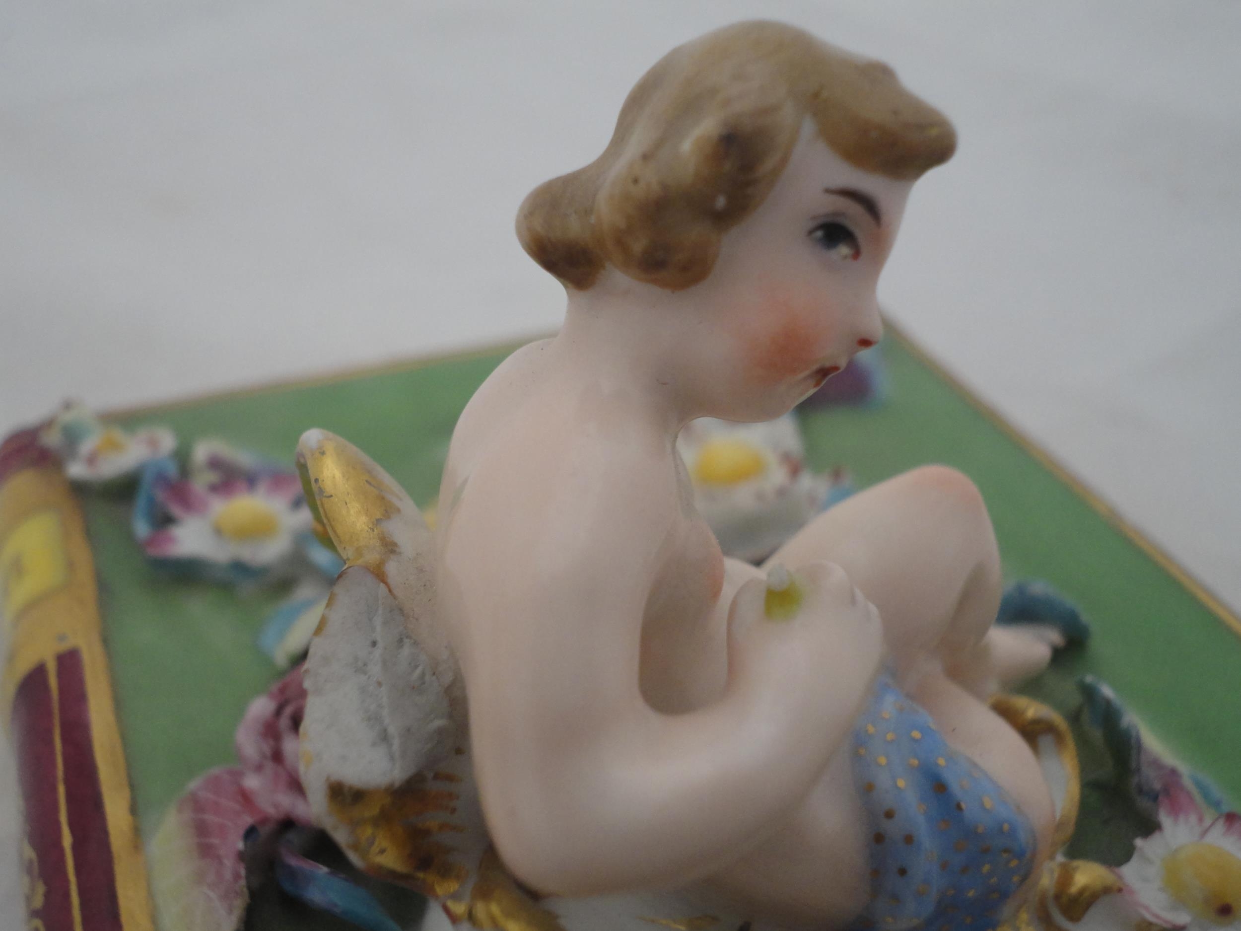 Continental ceramic desk stand with winged putti surmount and integral inkwells, decorated with encrusted flowers.