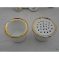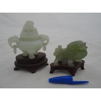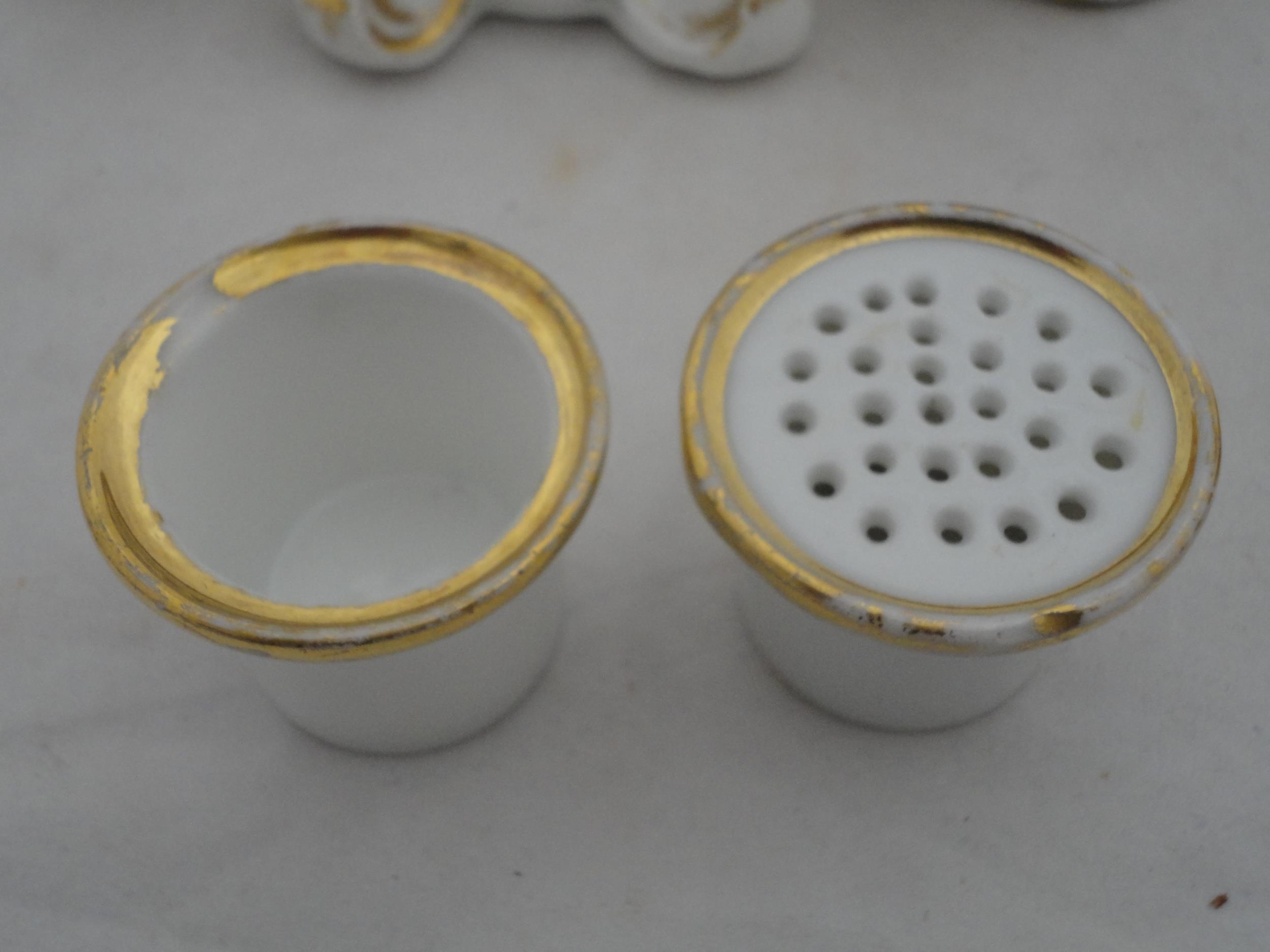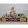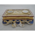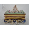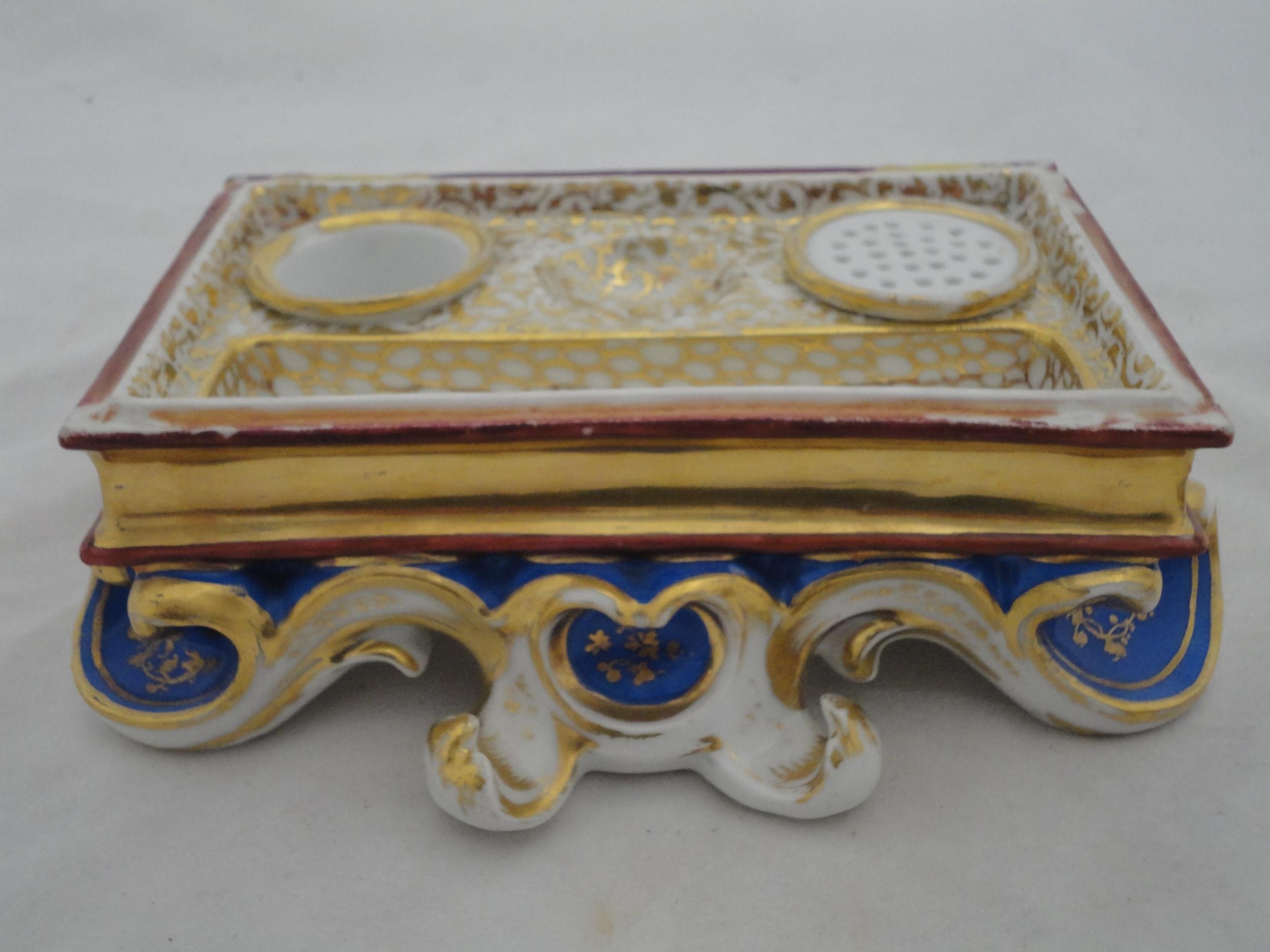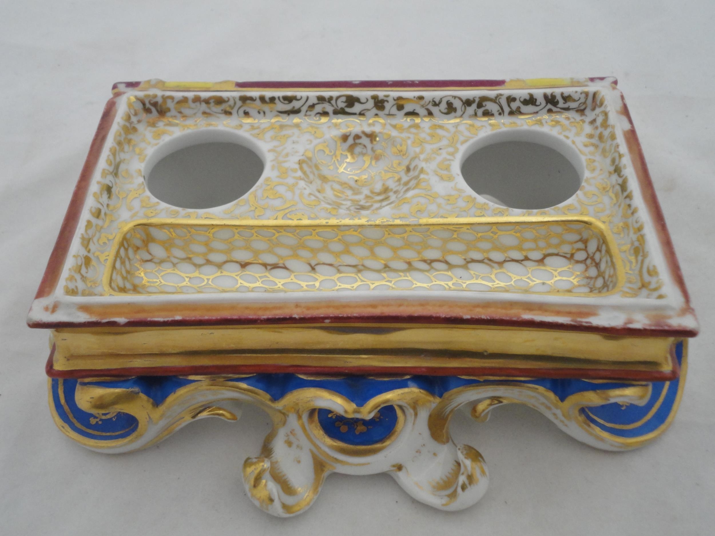 Continental ceramic desk stand with winged putti surmount and integral inkwells, decorated with encrusted flowers.