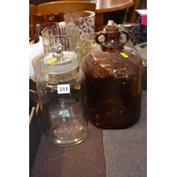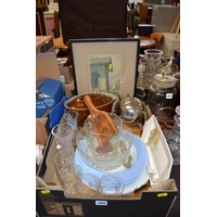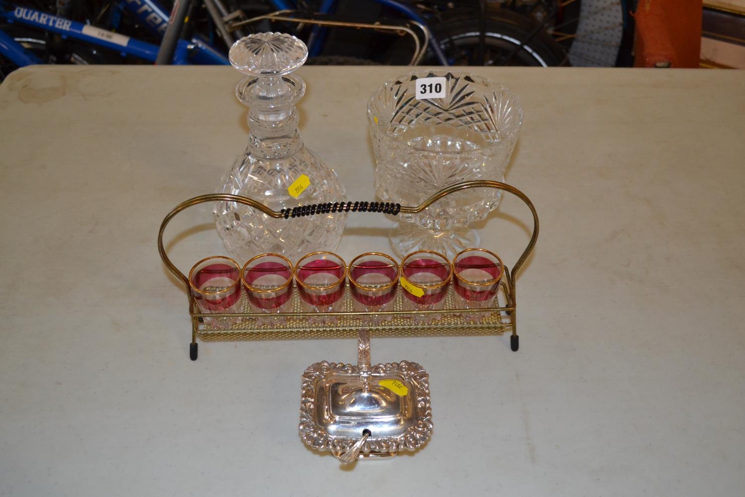 CUT GLASS SPIRIT DECANTER, CUT GLASS BON BON DISH AND SILVER PLATED LIDDED SALT