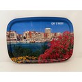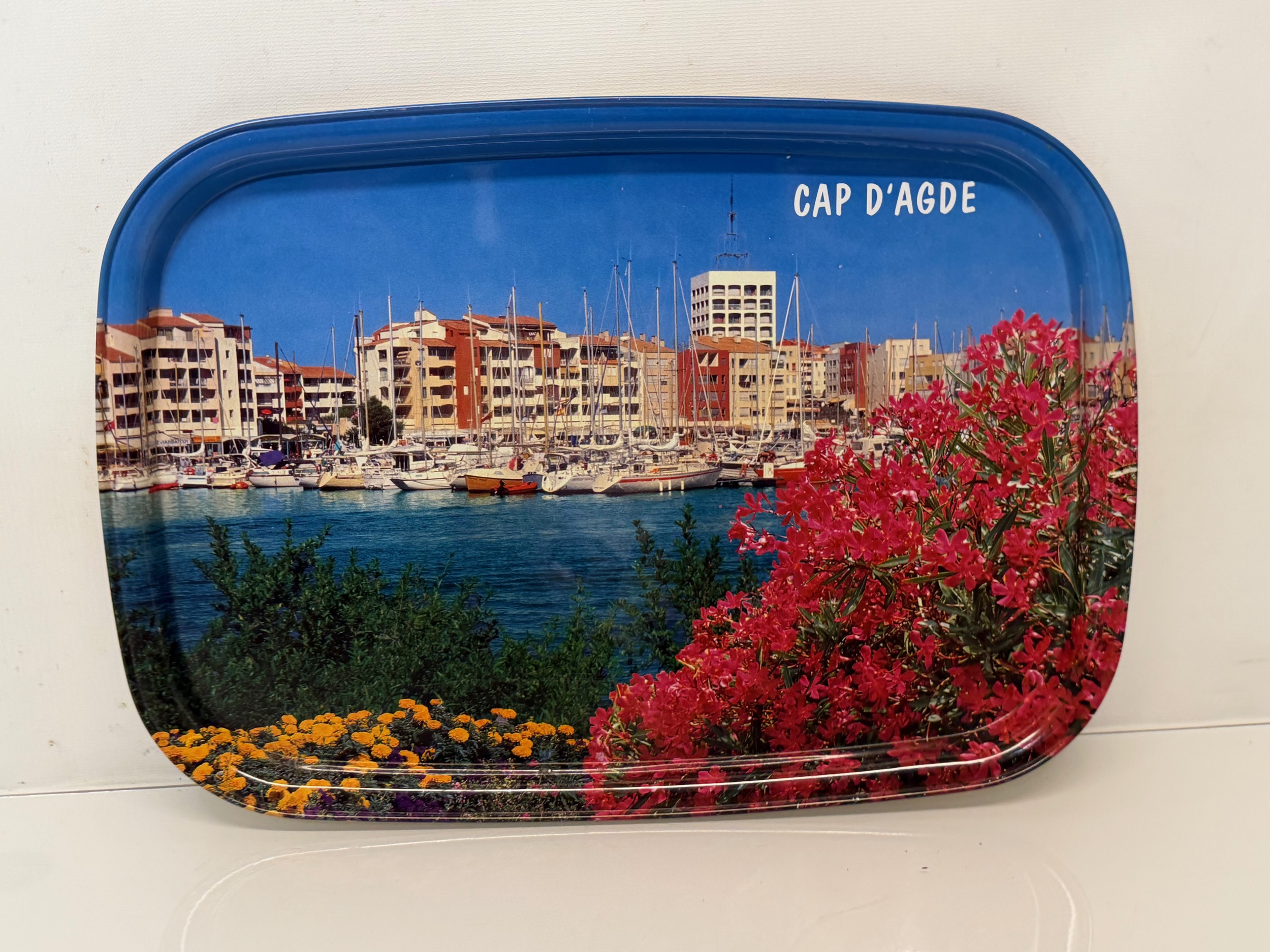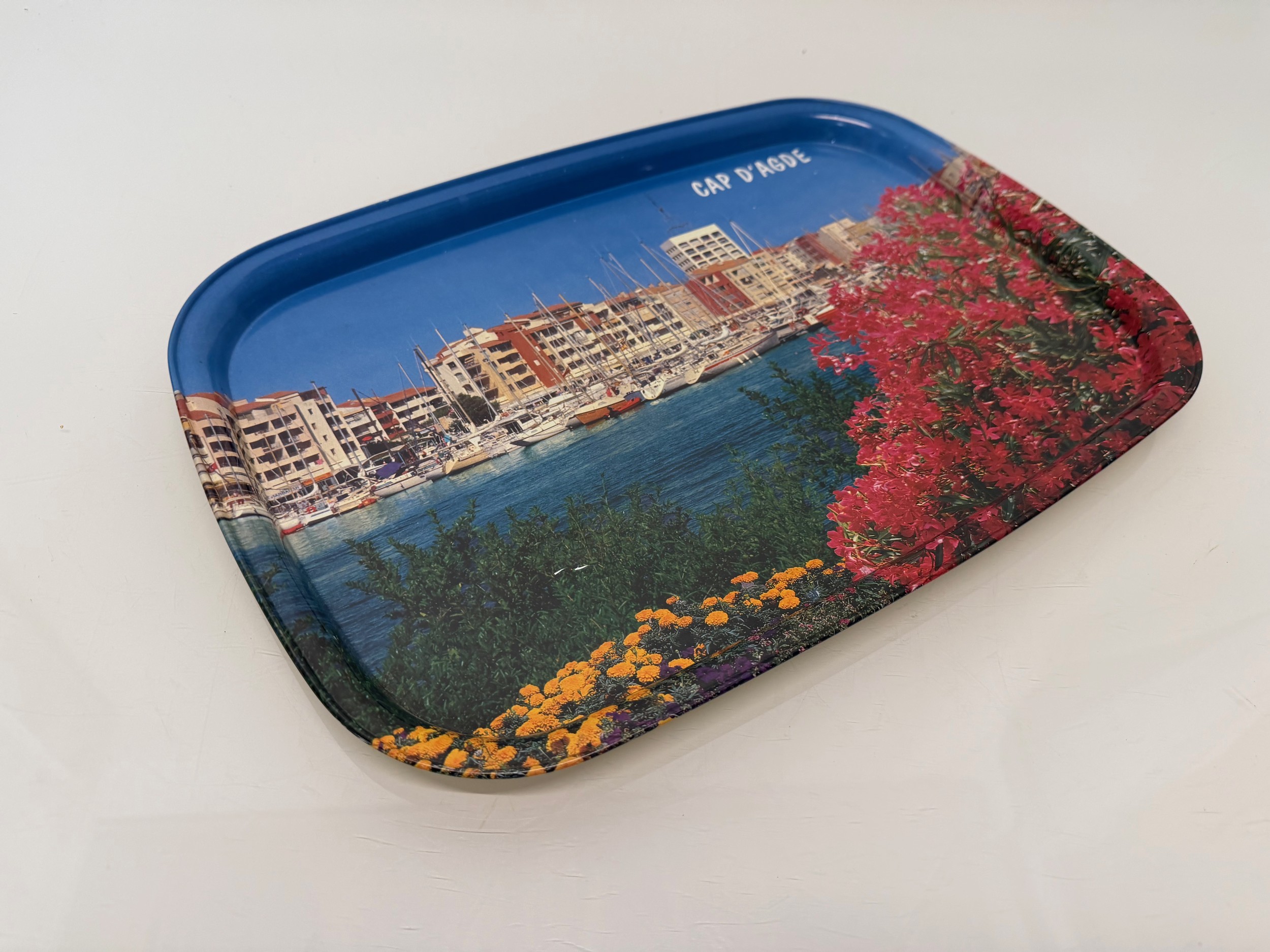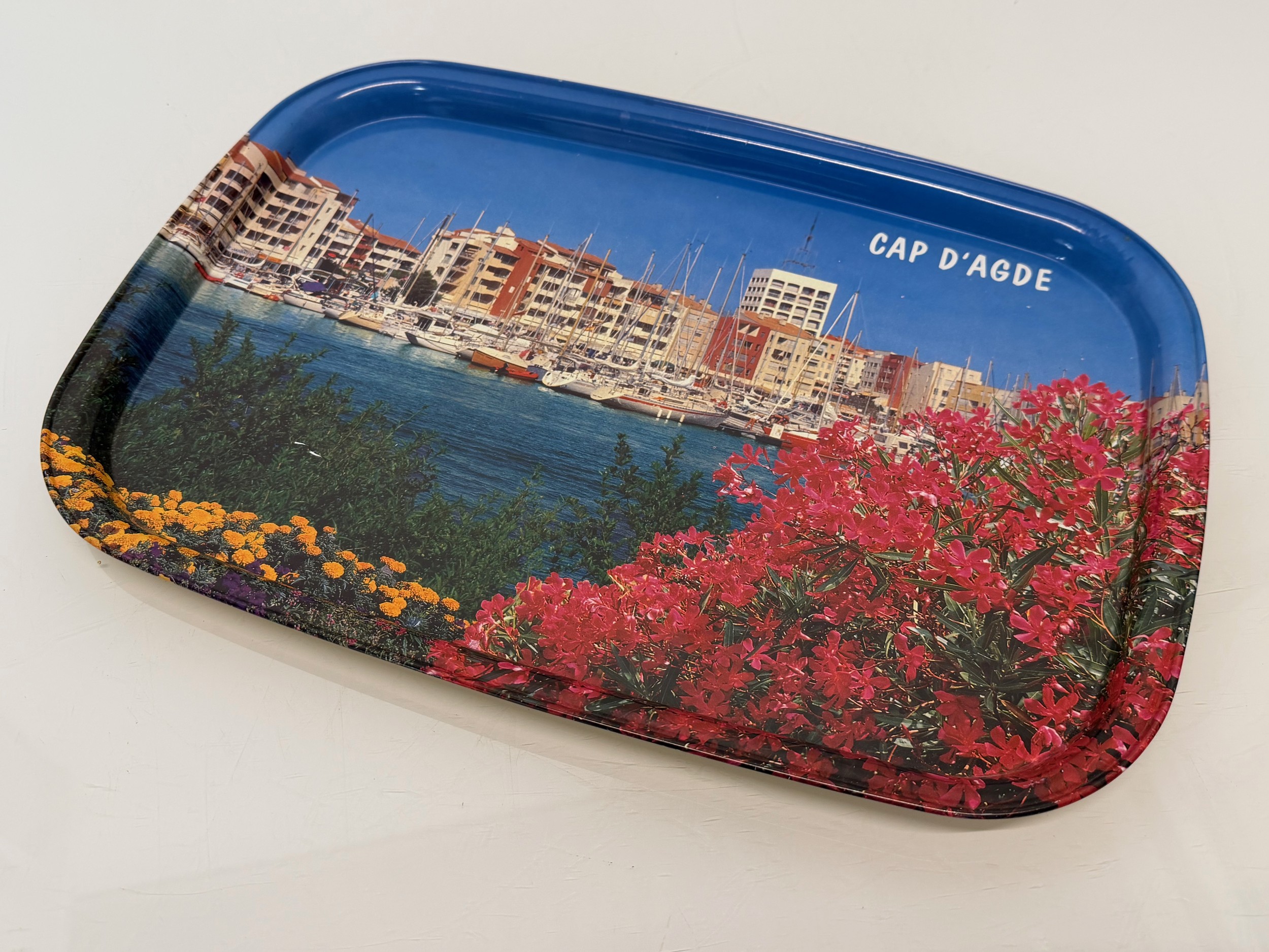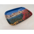 Mid century Kitsch, a steel serving tray with a lithographed mediterainian scene to the front.