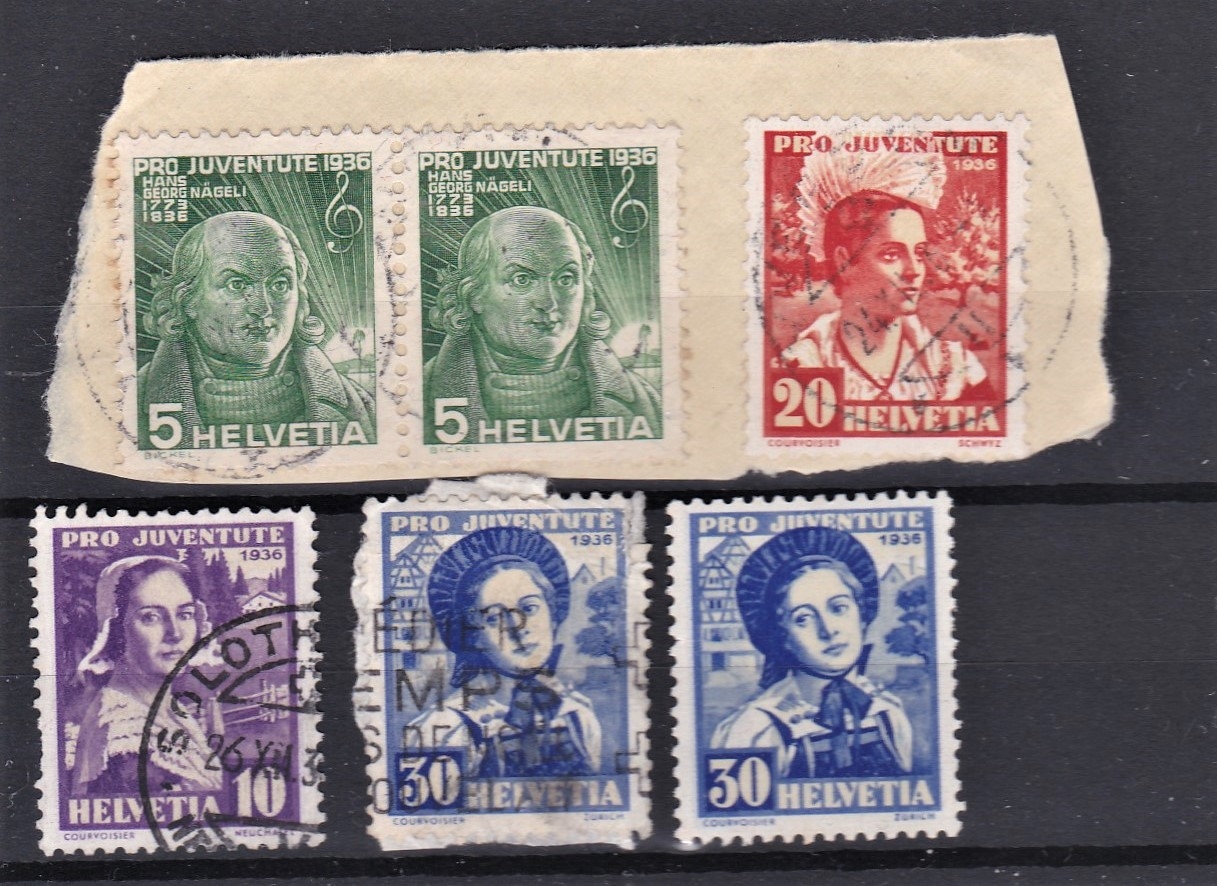 Switzerland 1936 Children's Fund SG J76-J79 used set, J79 damaged 30c damaged r/t side SG J79 u/m. Cat 60+