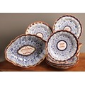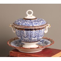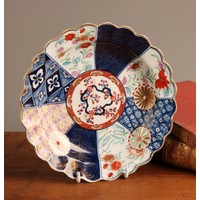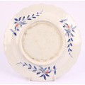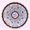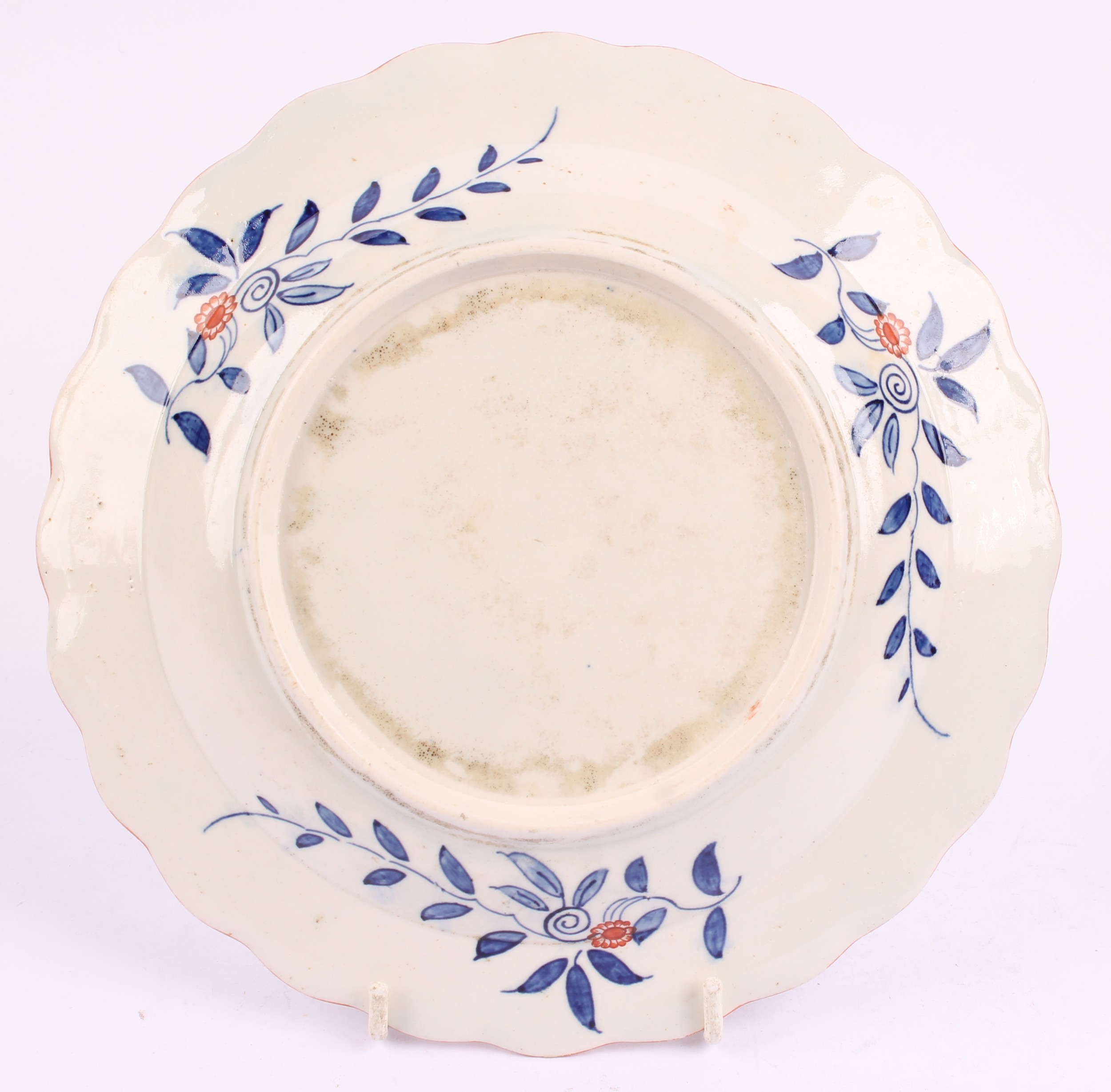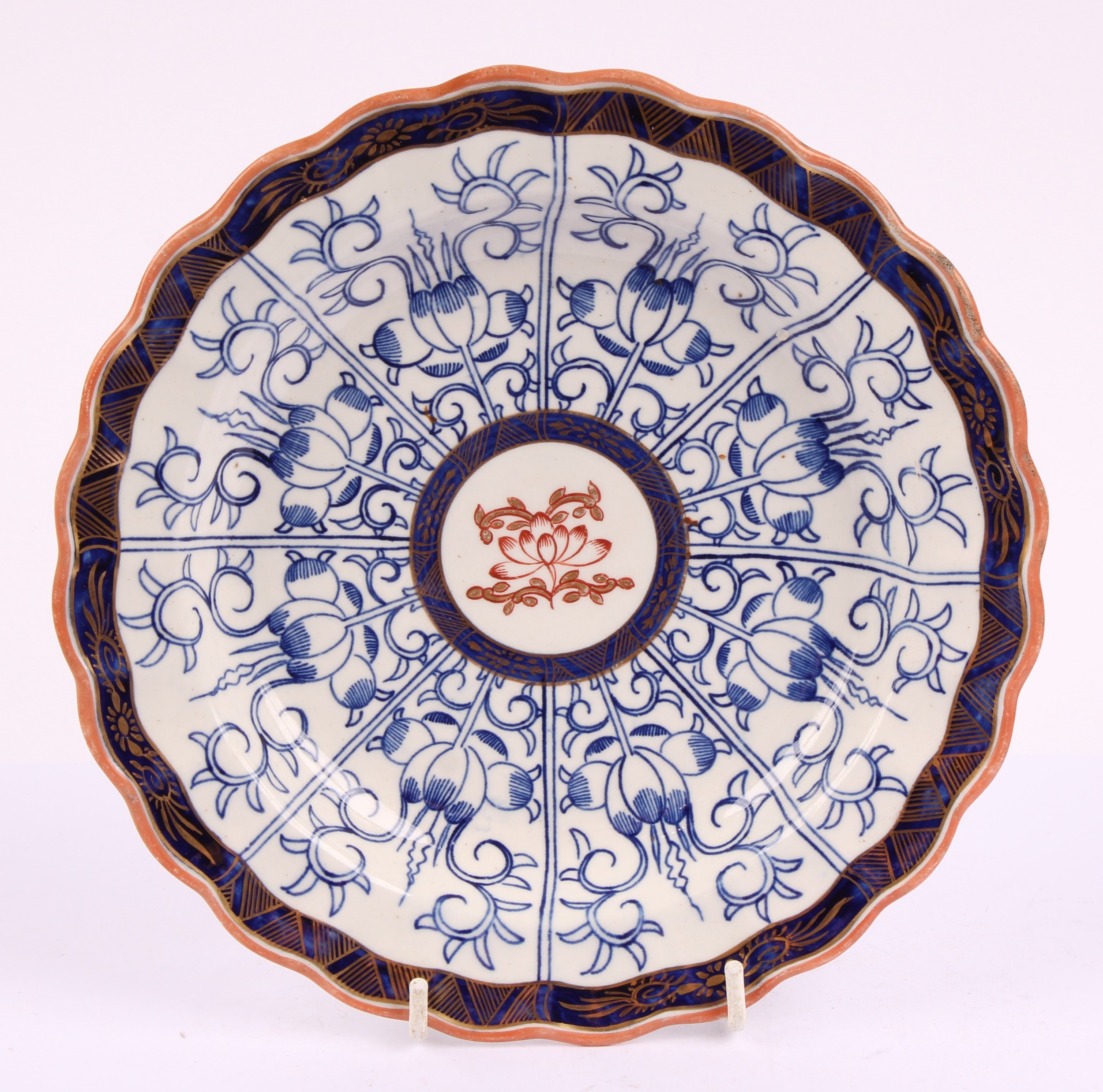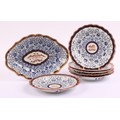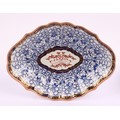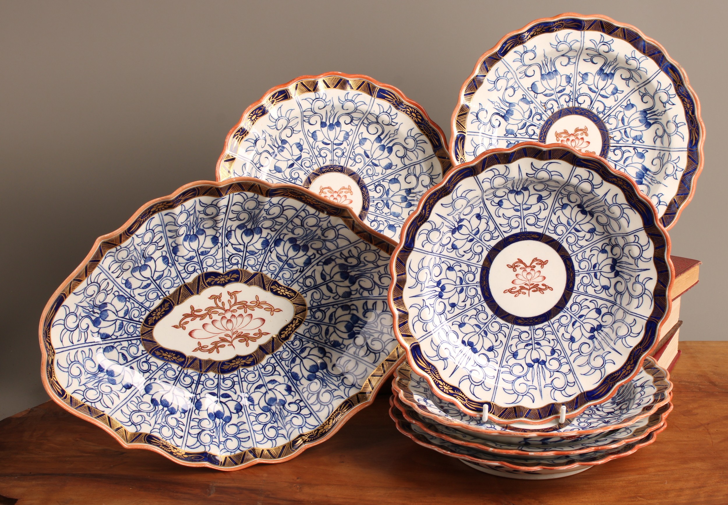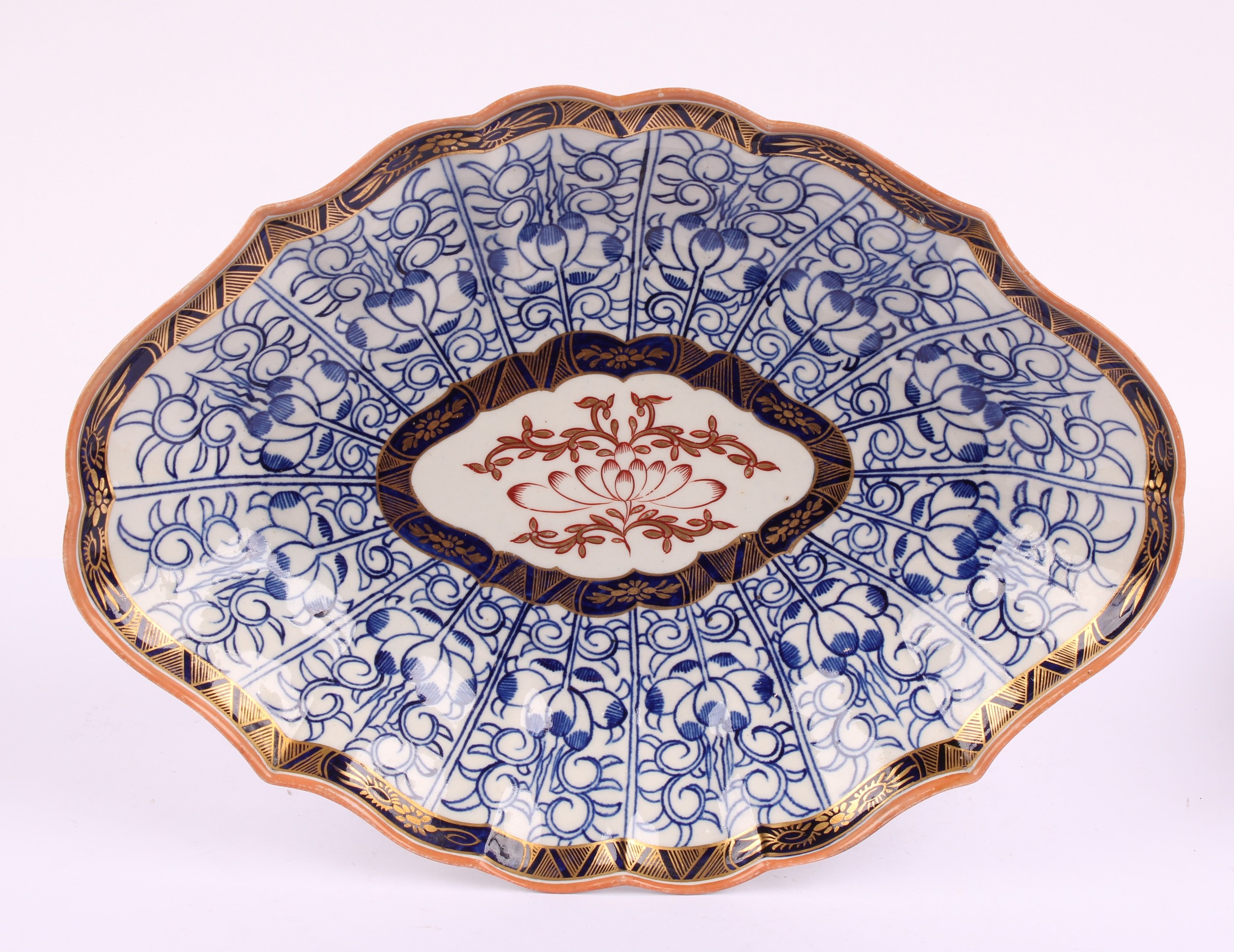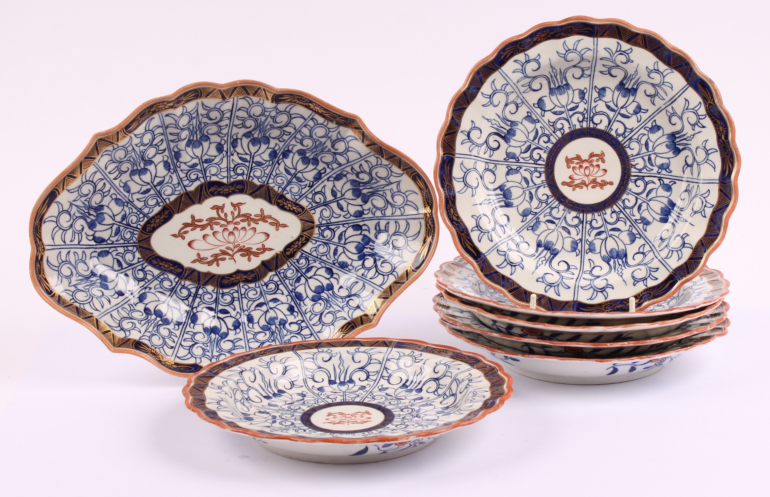 A Worcester Royal Lily pattern blue and white part dessert service comprising shaped oval serving dish, 29cm and six shaped circular dessert plates, the borders in iron red, picked out in gilt, 21cm diameter, painted crescent mark in blue, c.1790 (7)