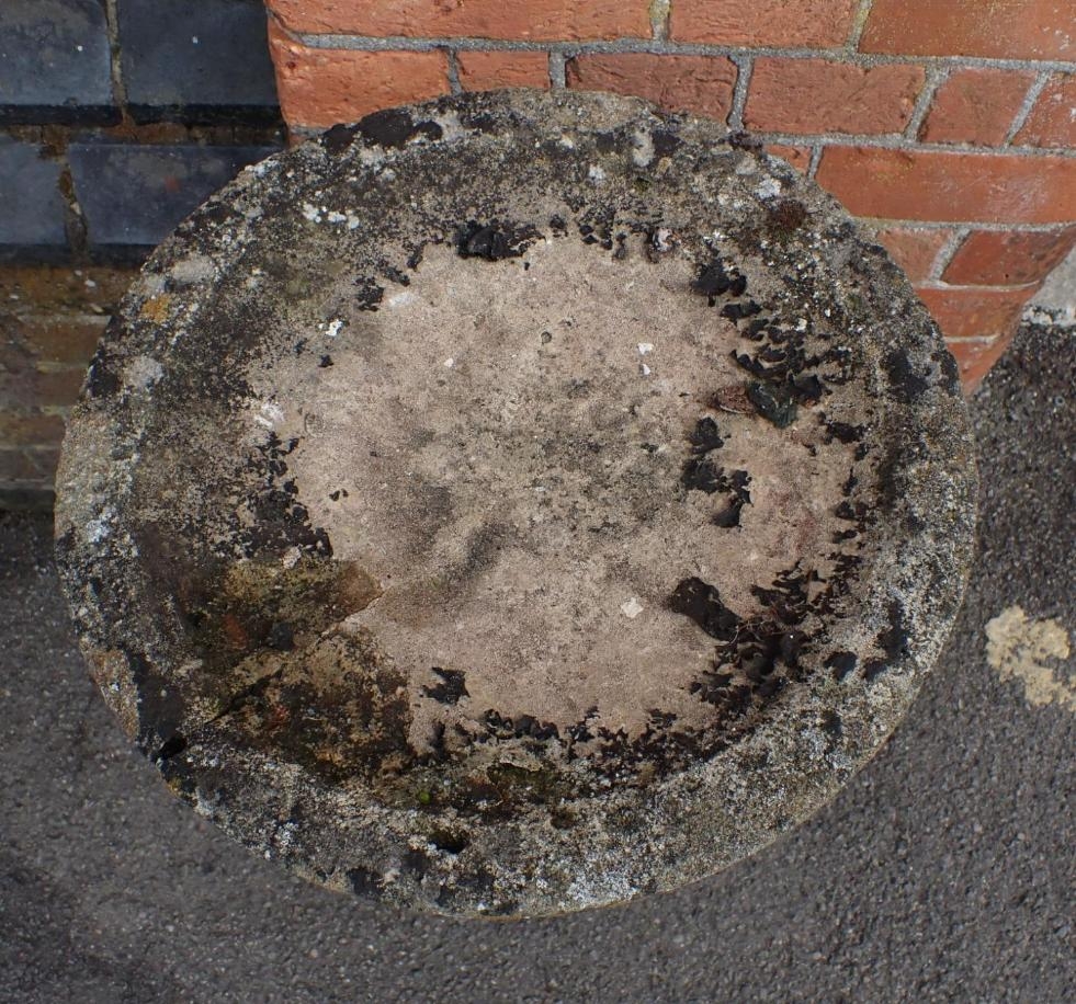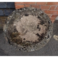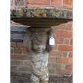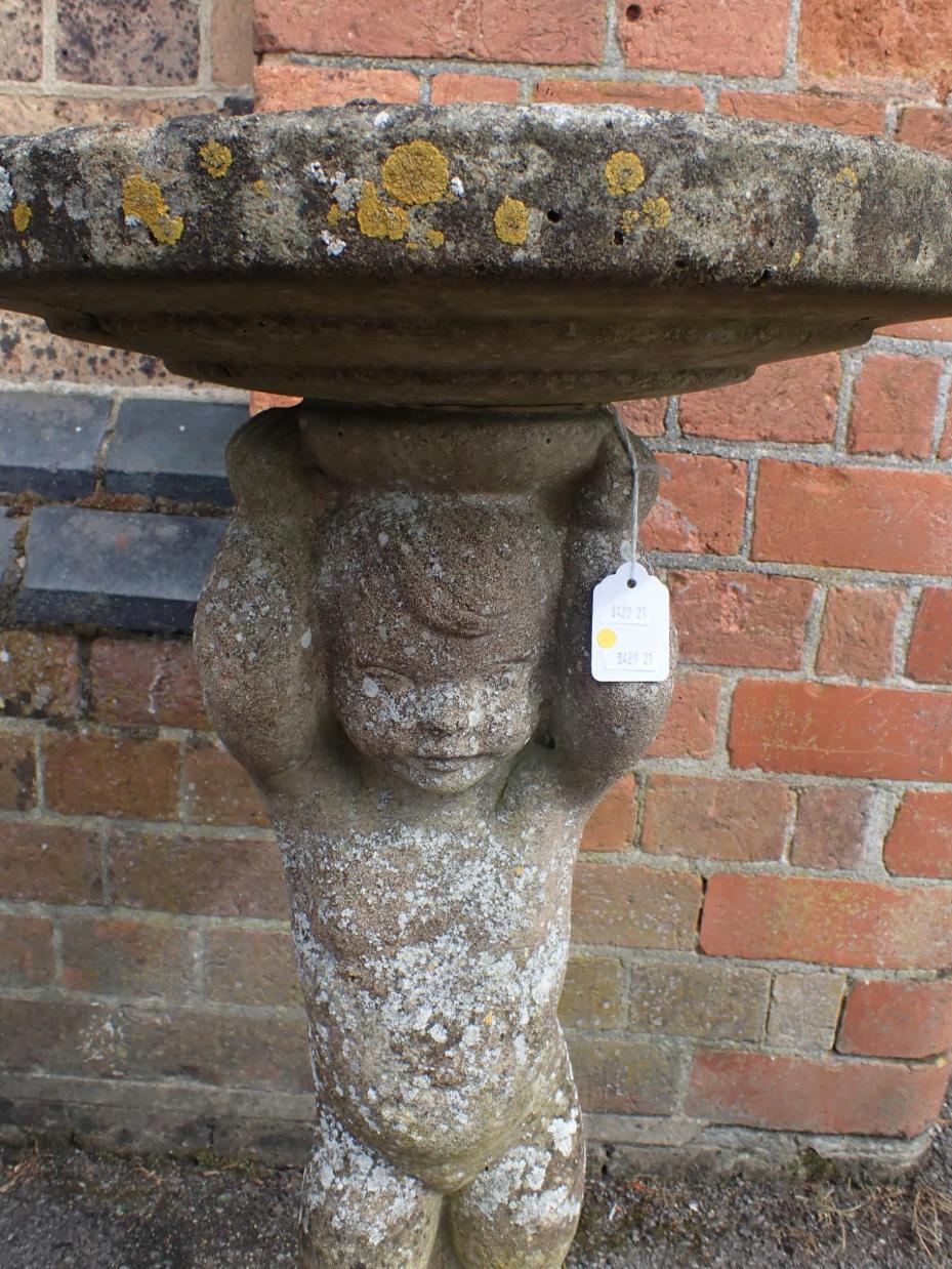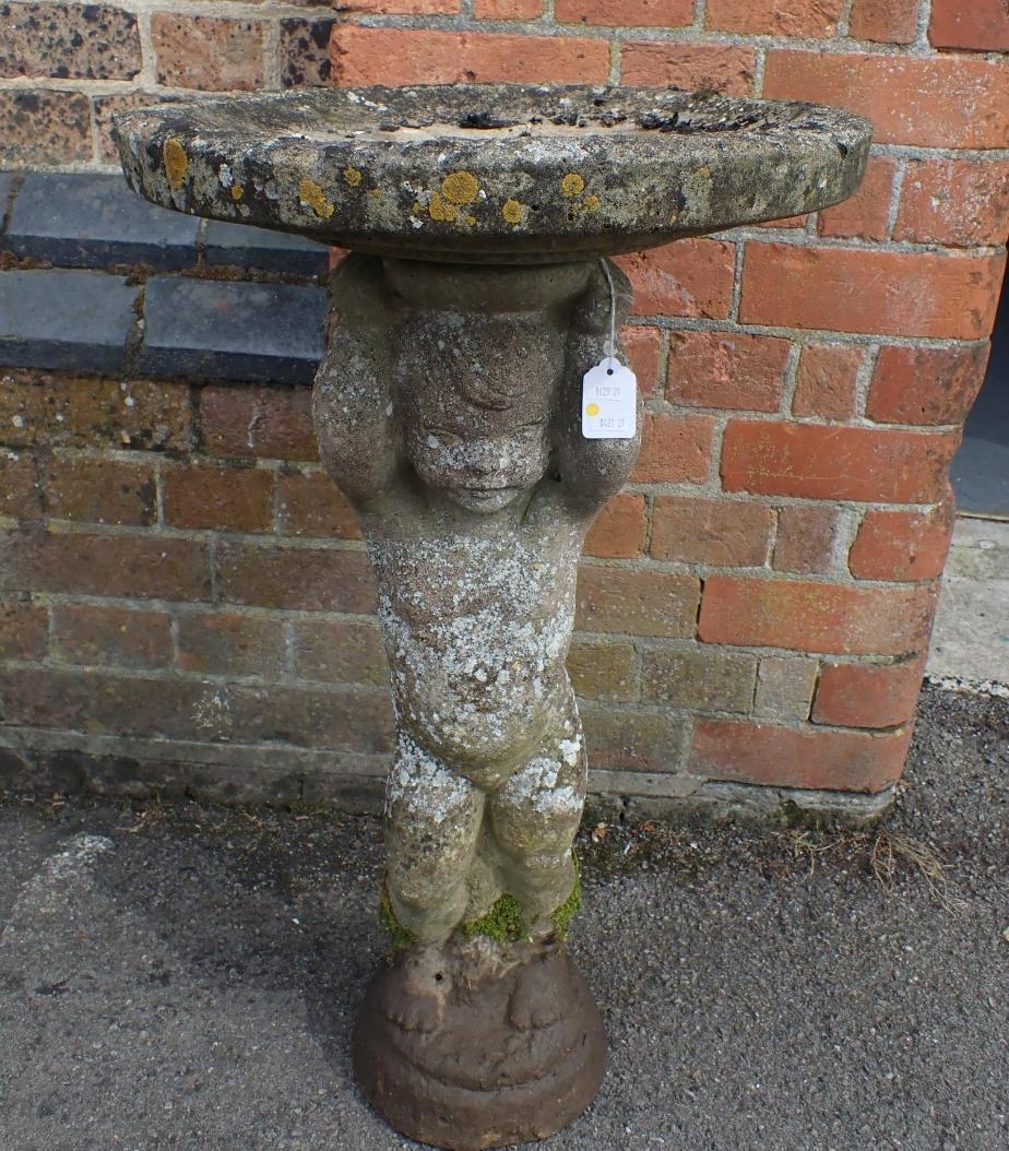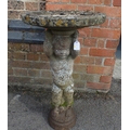 A WEATHERED RECONSTITUTED STONE FIGURAL BIRDBATH with putto supporting 73cm high