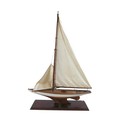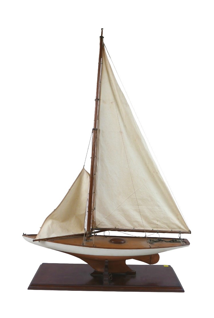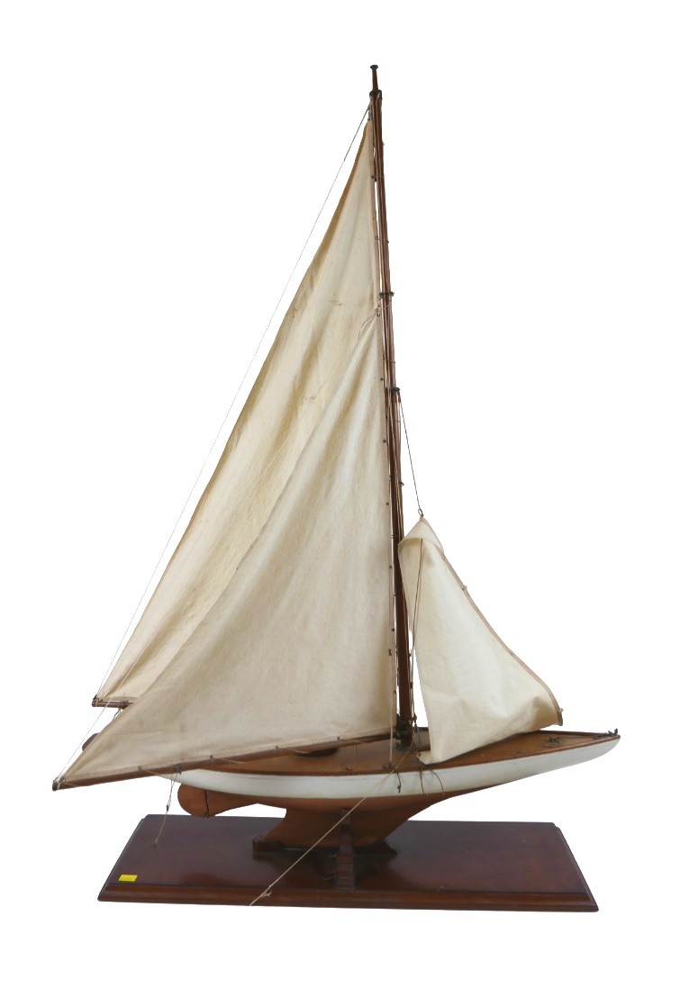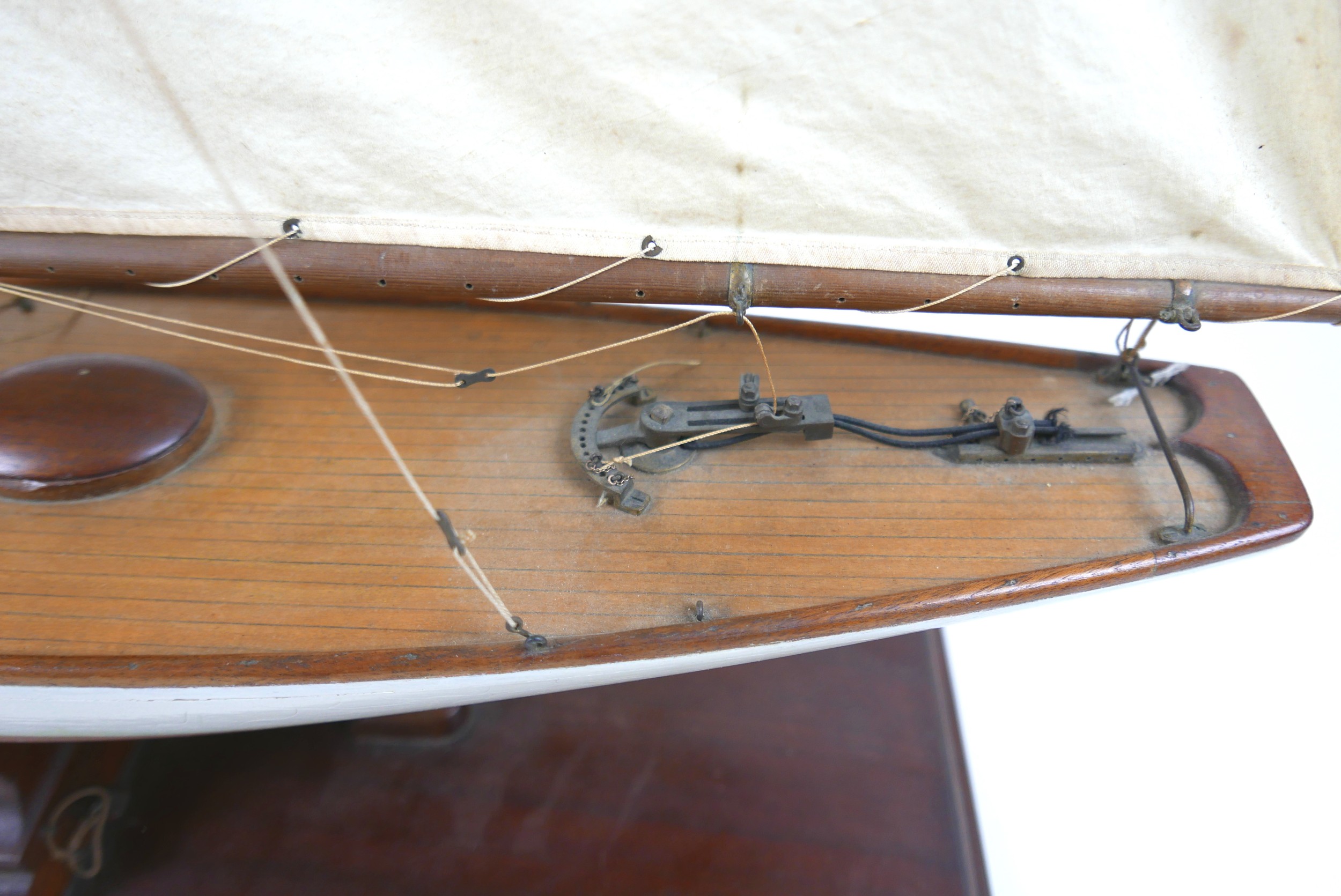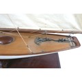 A 19th/20th century scratch built sailing boat, with white painted hull, raised upon a rectangular plinth, 60 by 19.5 by 103cm high, together with wall attachments.