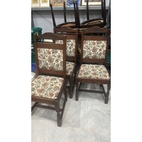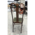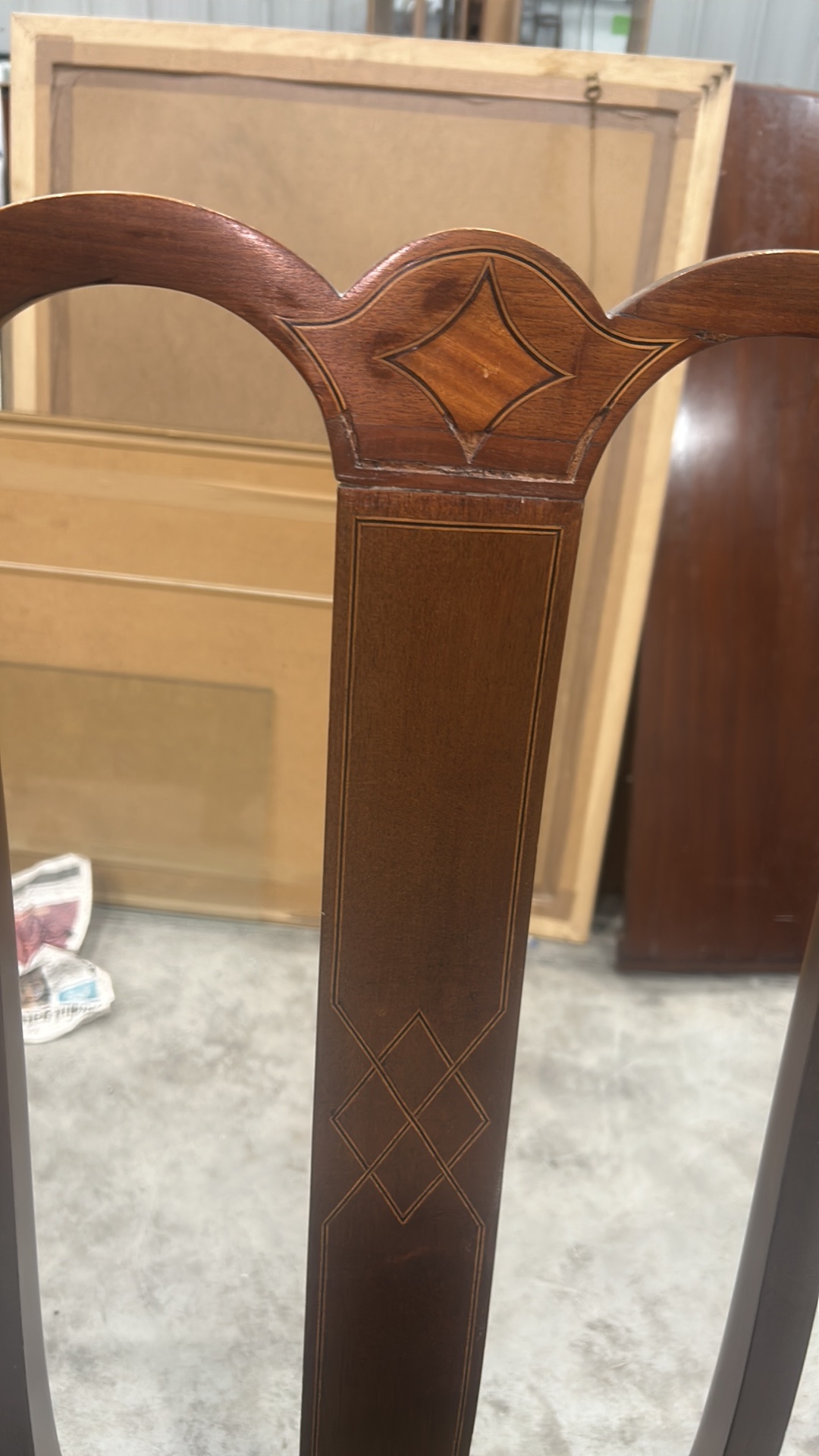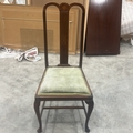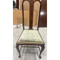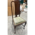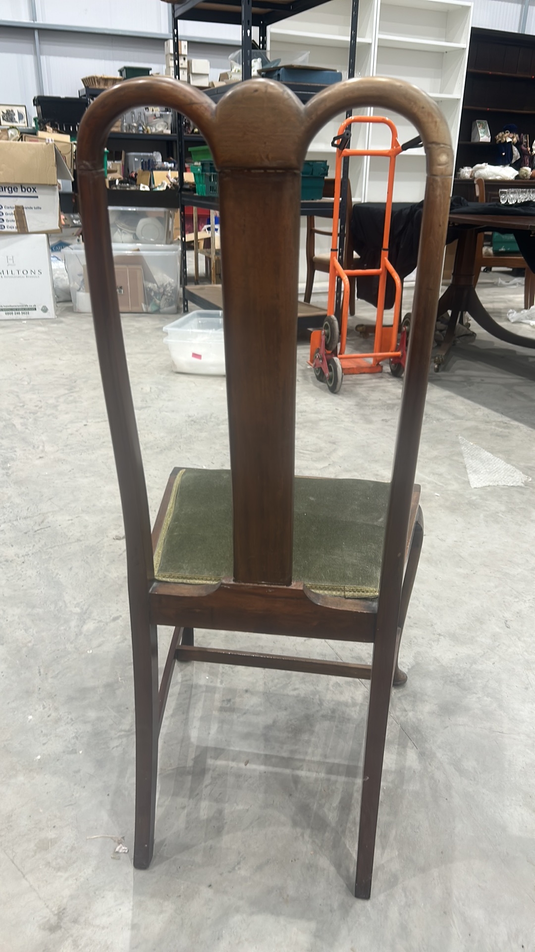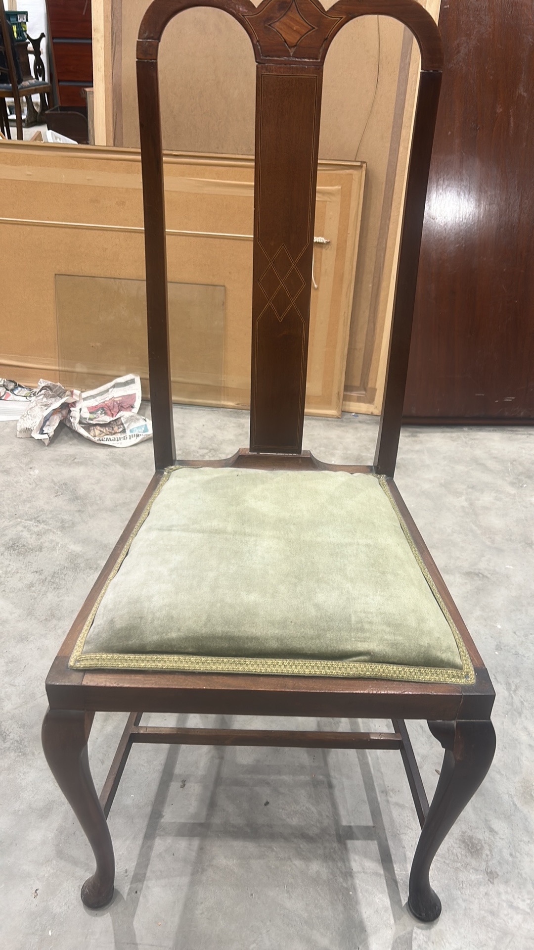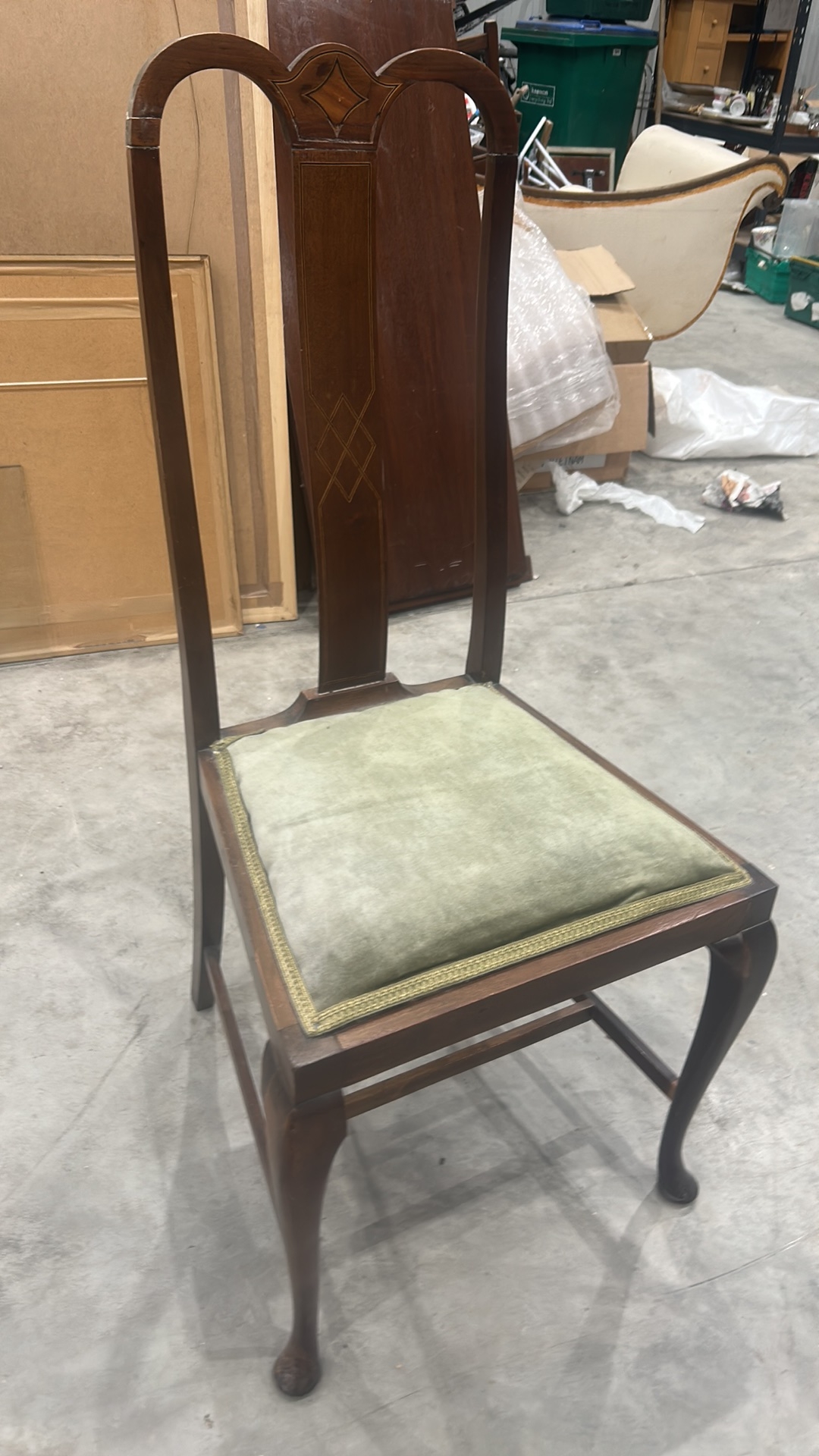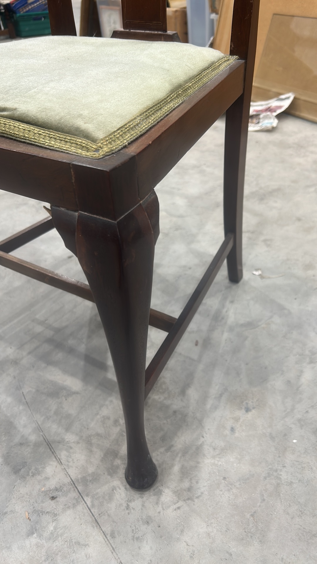 Edwardian mahogany dining chair, the arched top rail and splat with satinwood string and diamond inlay, drop-in green velvet seat, cabriole front legs and pad feet, circa 1910.