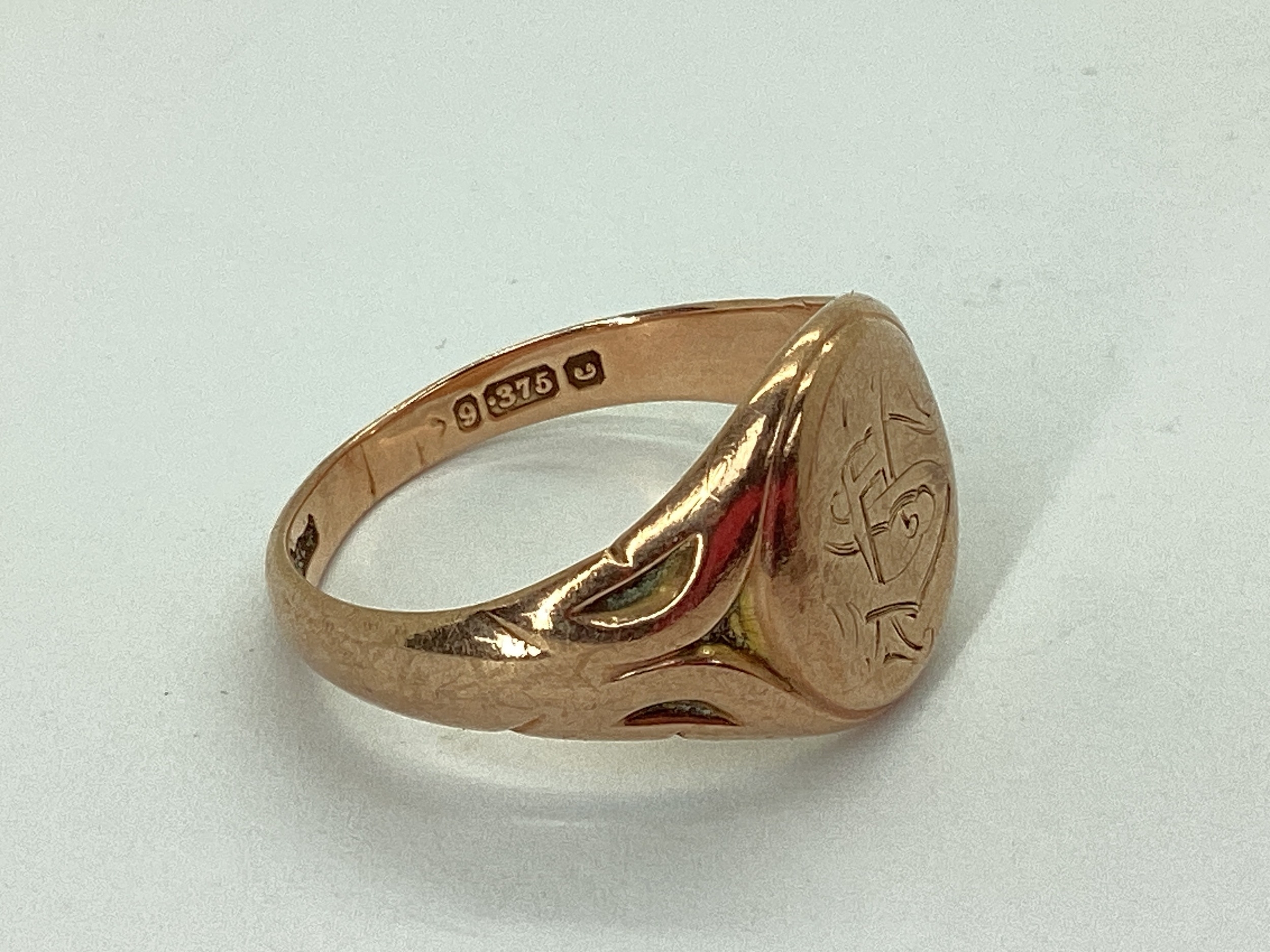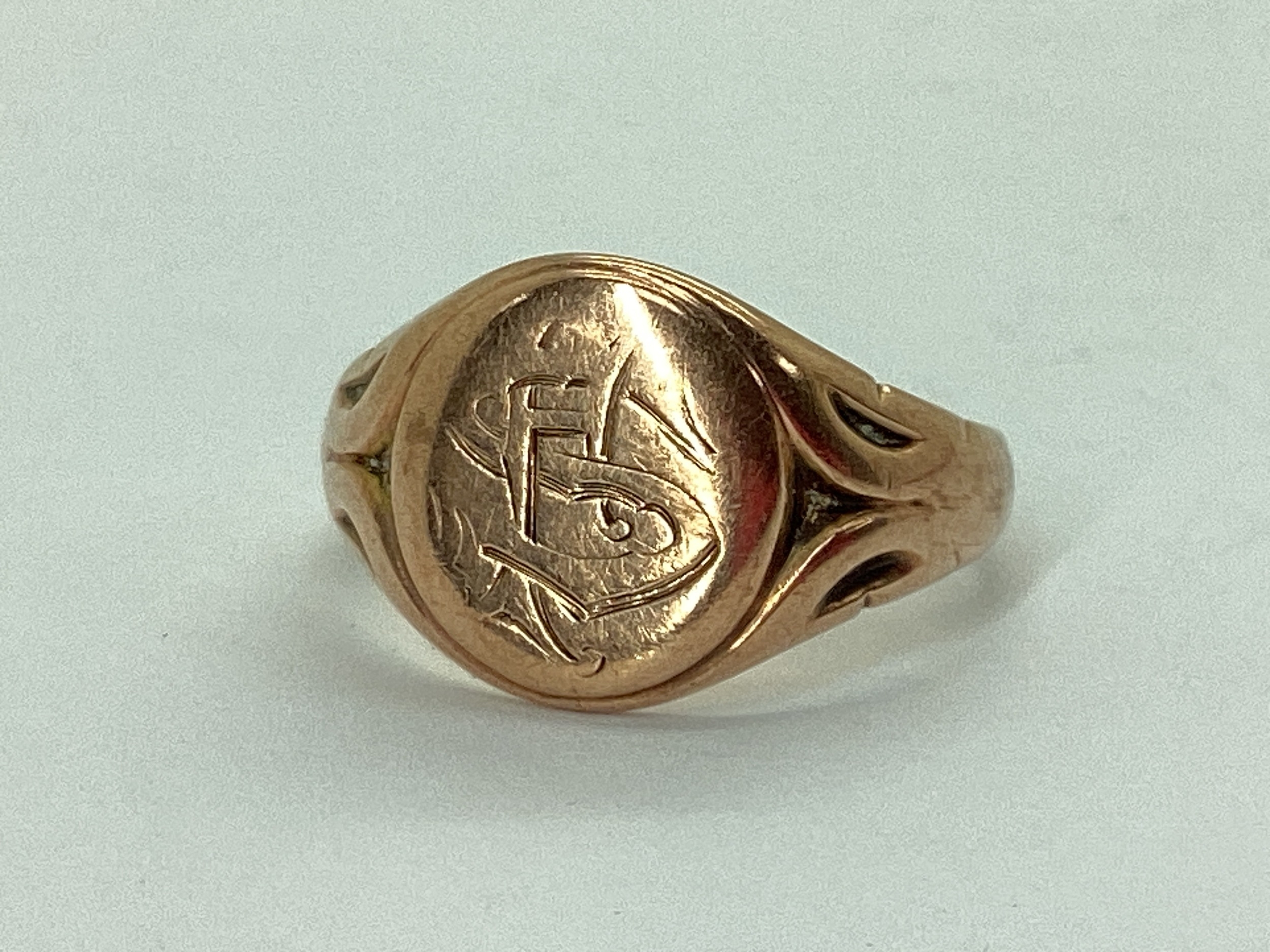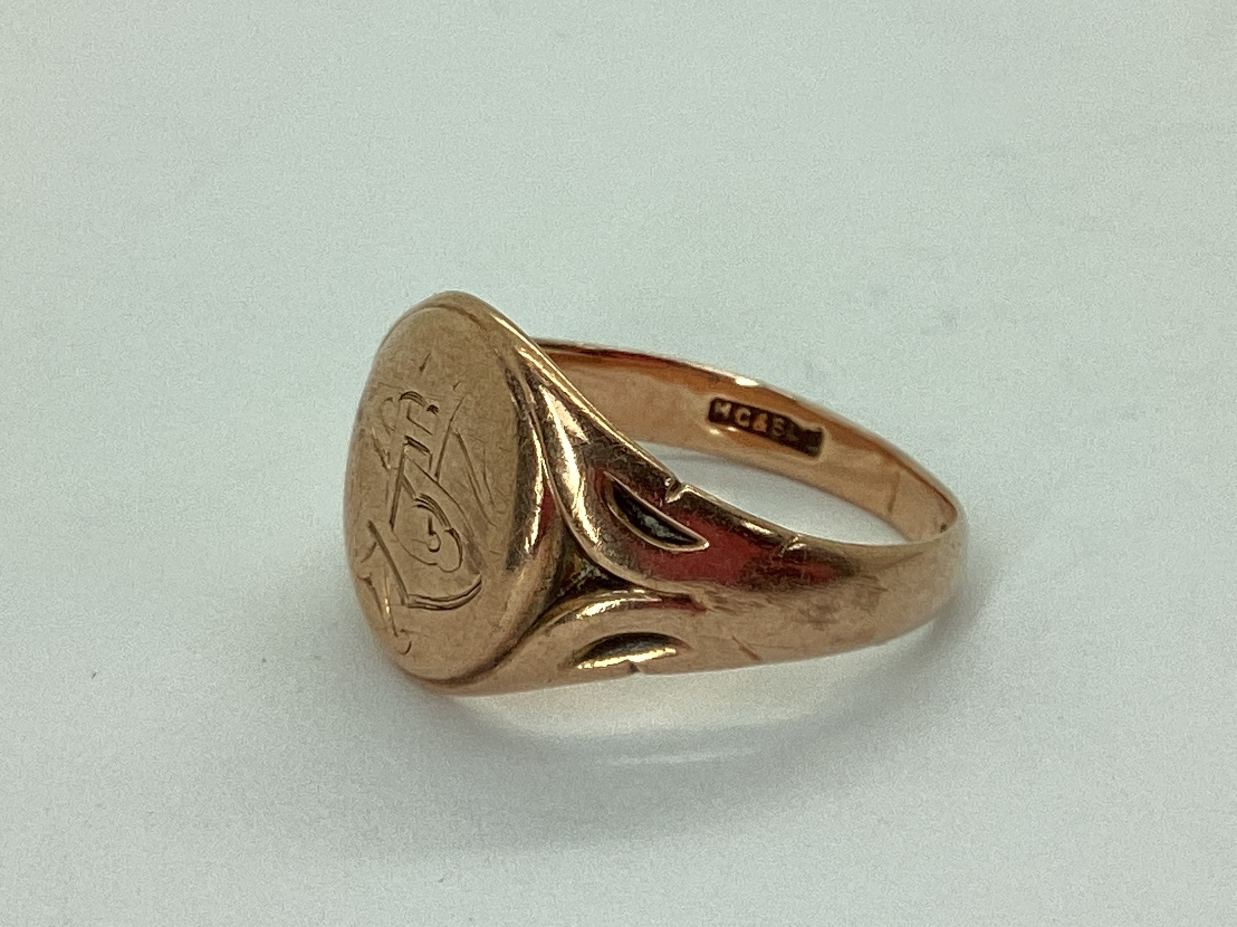 A 9ct Rose Gold Signet Ring, the oval panel monogrammed, between textured shoulders (finger size P) (4.7grams).