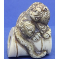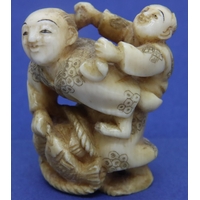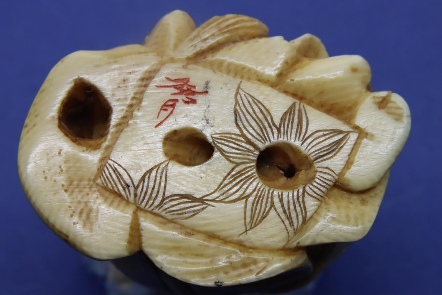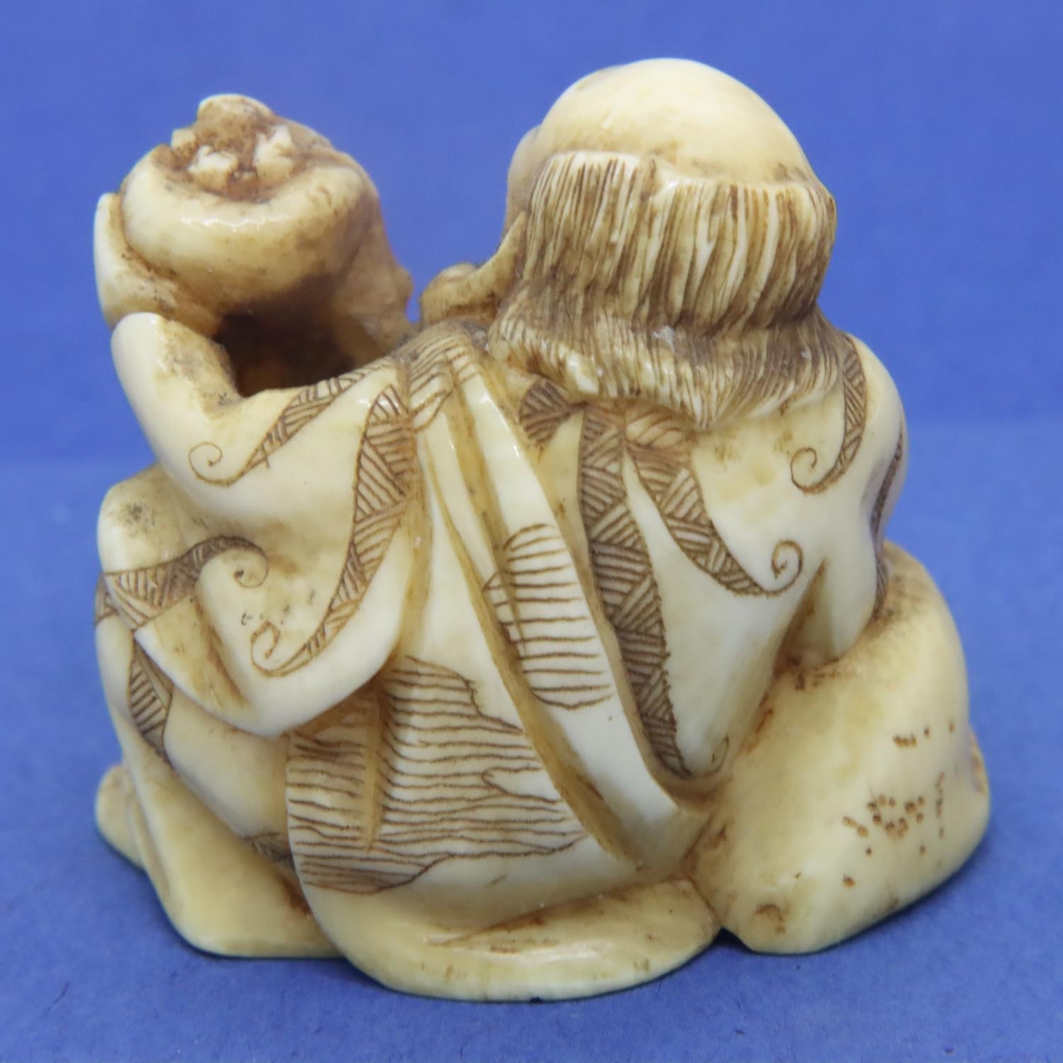 Ivory carved netsuke in the form of a seated street vendor holding a fly whisk, H: 36 mm, signed to base. P&P Group 1 (£14+VAT for the first lot and £1+VAT for subsequent lots)
