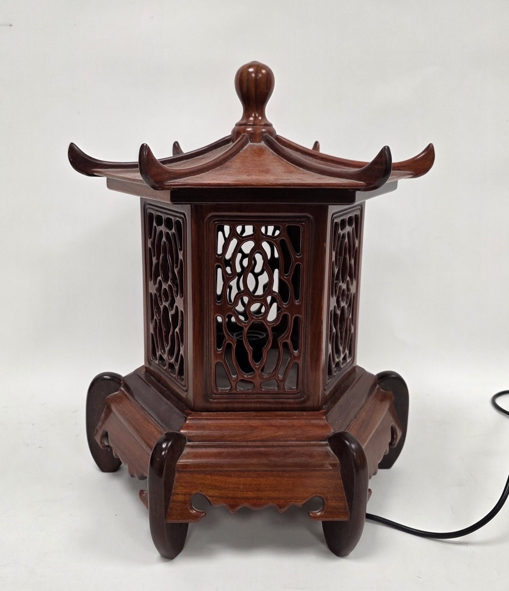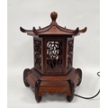 Hardwood table lamp in the form of a Chinese pagoda lidded lantern, with pierced side panels, 52cm high