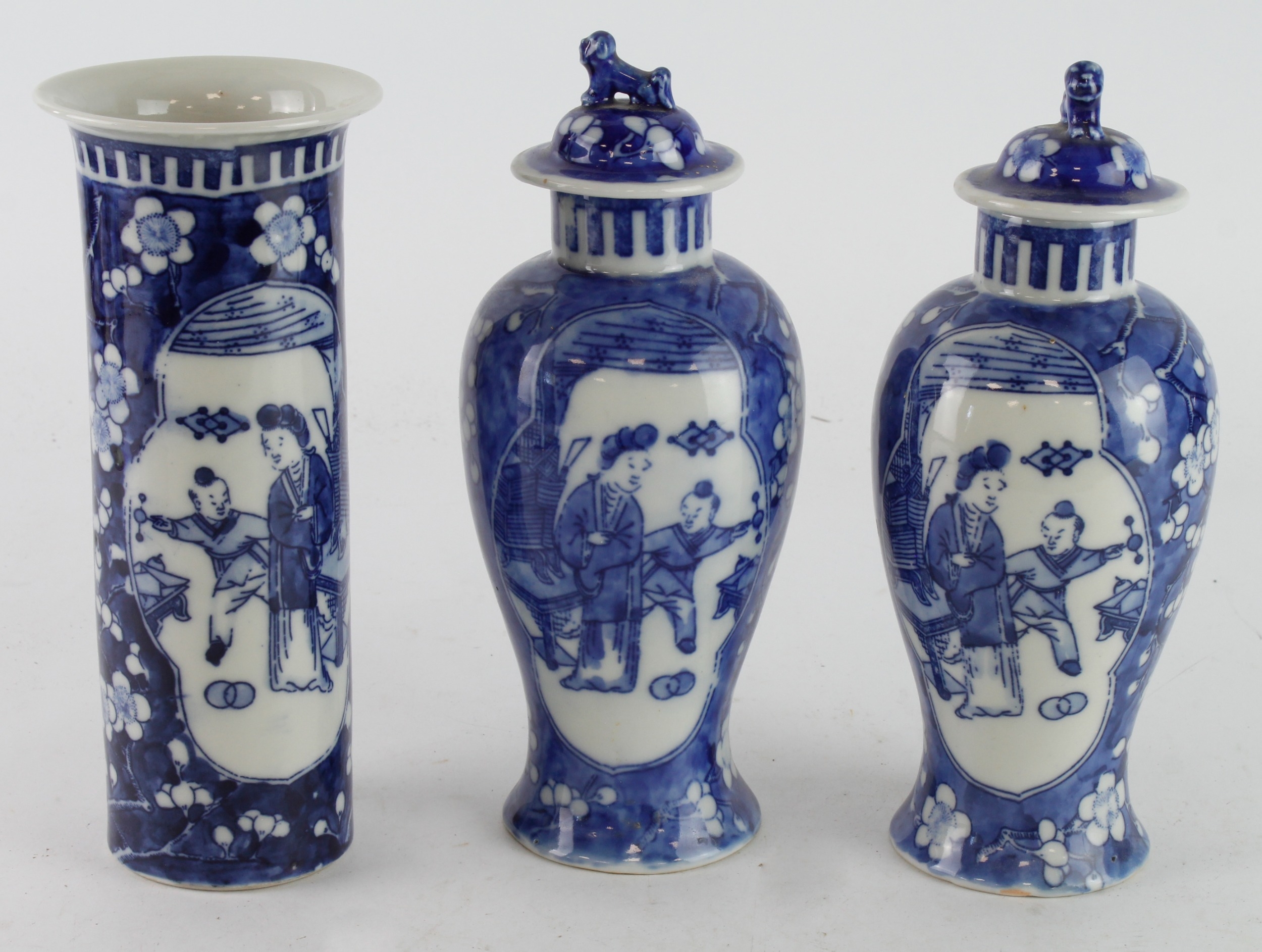 Chinese interest. A pair of chinese vases with lids & another vase, each with Chinese characters to base, tallest 22cm approx.
