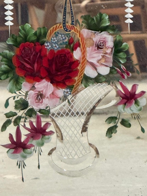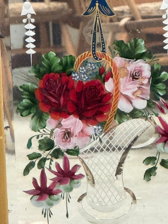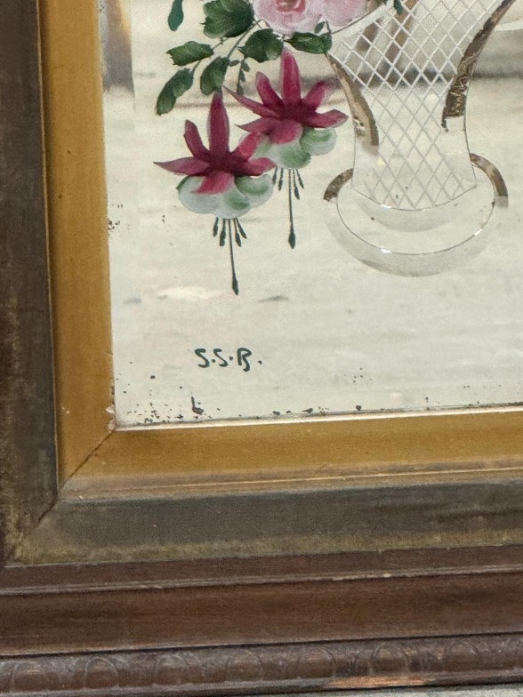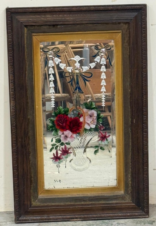 An Edwardian etched and florally painted wall mirror signed lower right S.S.B 55cm x 86cm