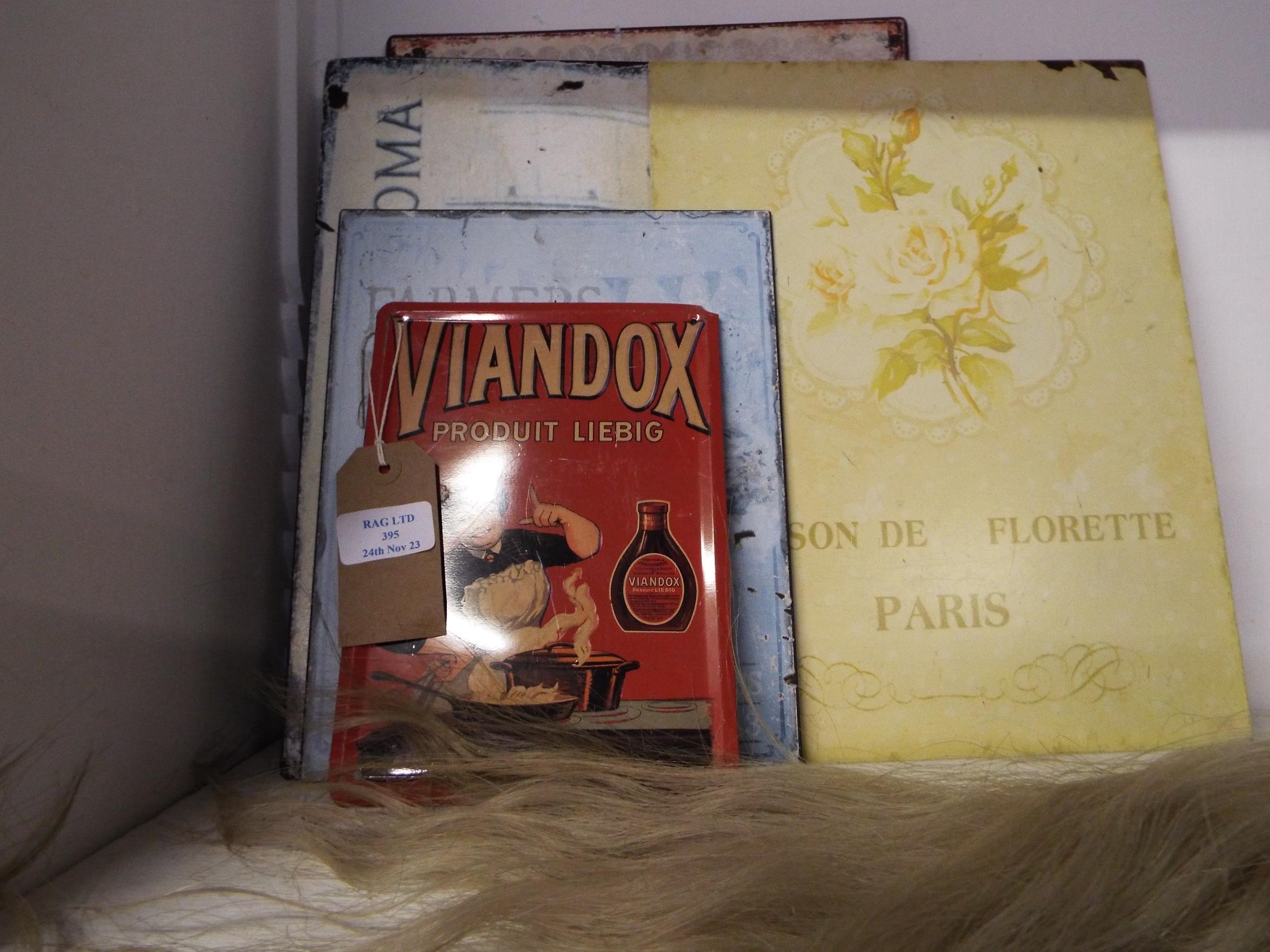 A selection of tin plate signs to include Viandox Product Liebig, Farmers Market etc