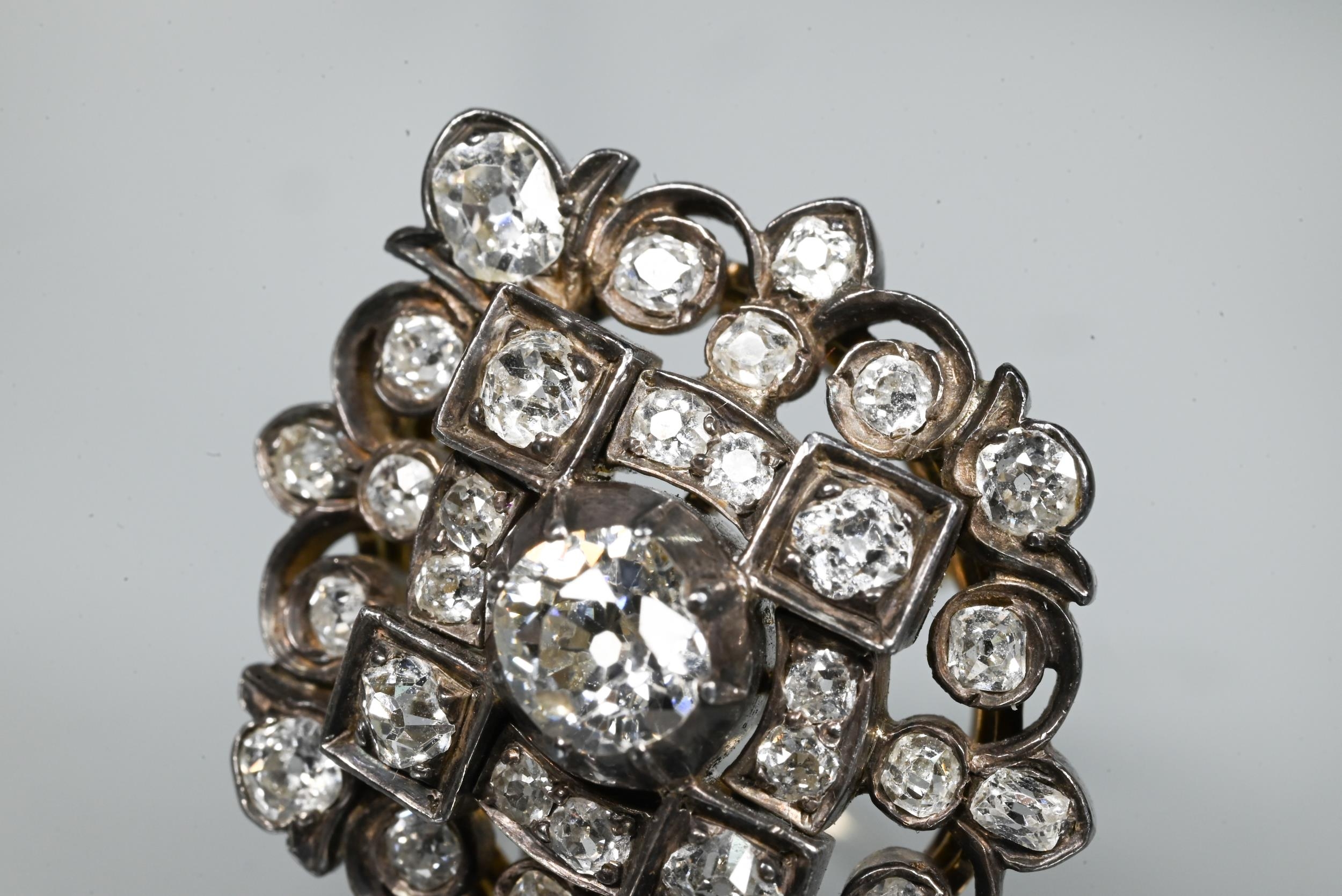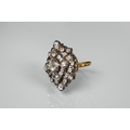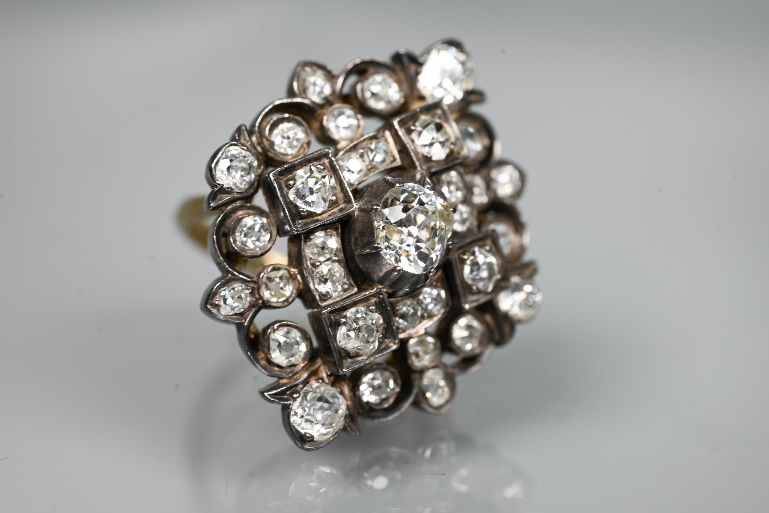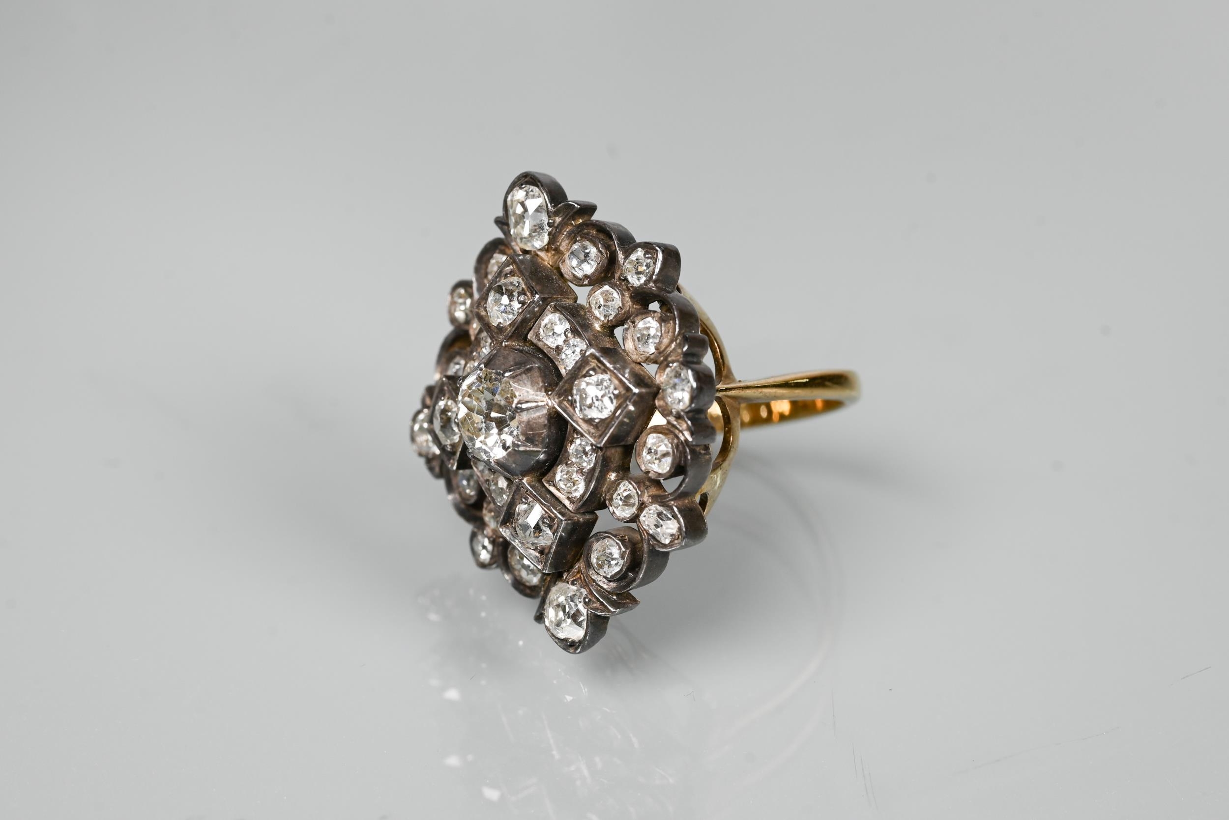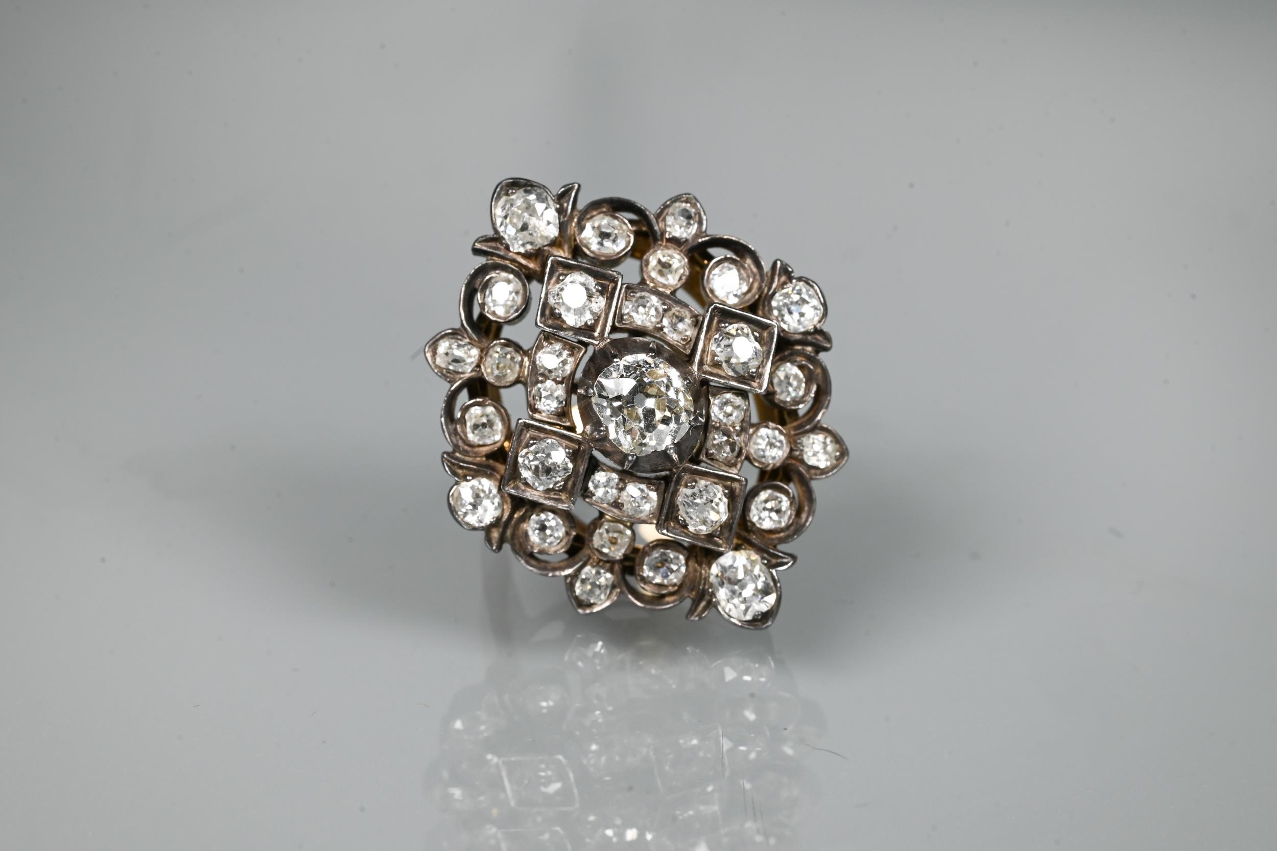 An antique diamond cluster ring, the central old cut diamond sourrounded by a cluster of thirty-two old cut diamonds of various sizes, milgrain set within a silver lozenge design, mounted on a scalloped 9ct yellow gold gallery and tapered shank, approx total carat weight 3.20ct, 2.5 x 2.8 cm overall, approx 12.7g all in, converted from an antique brooch