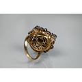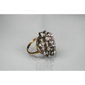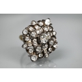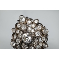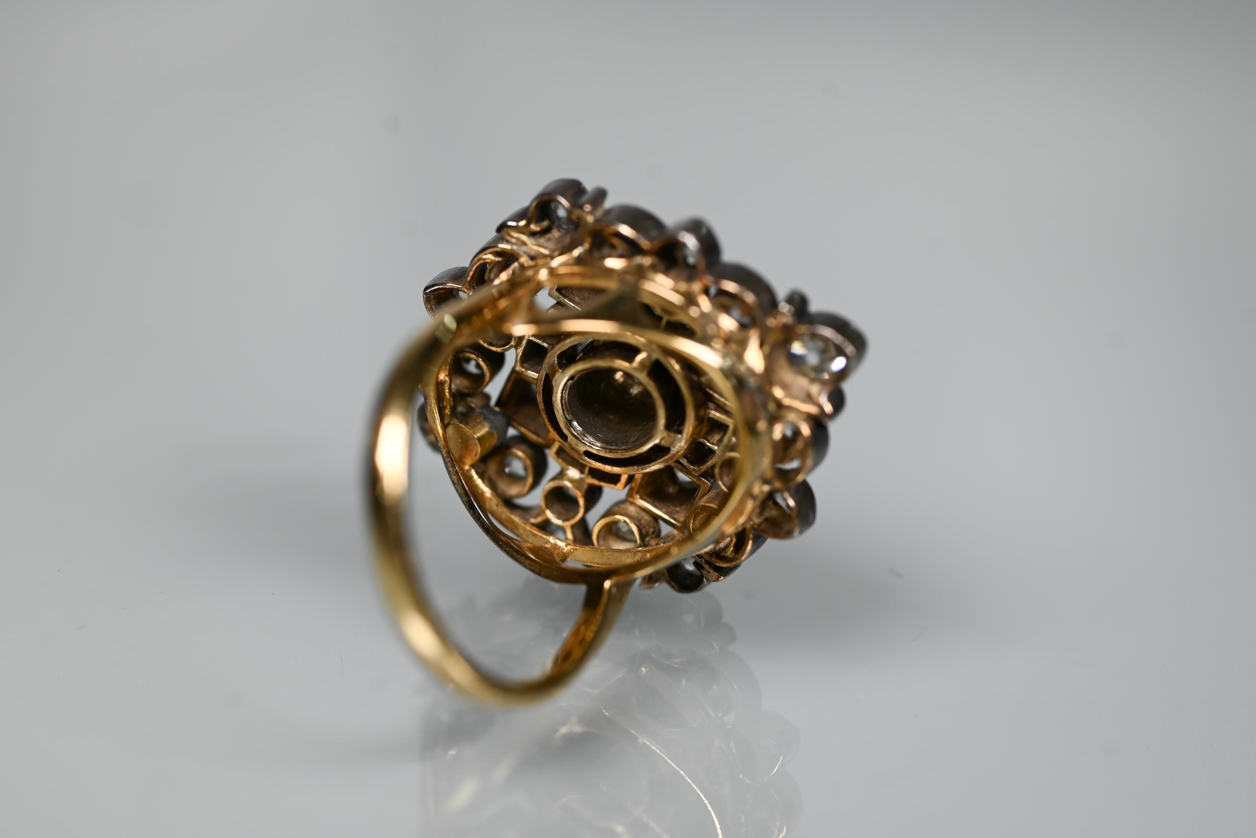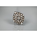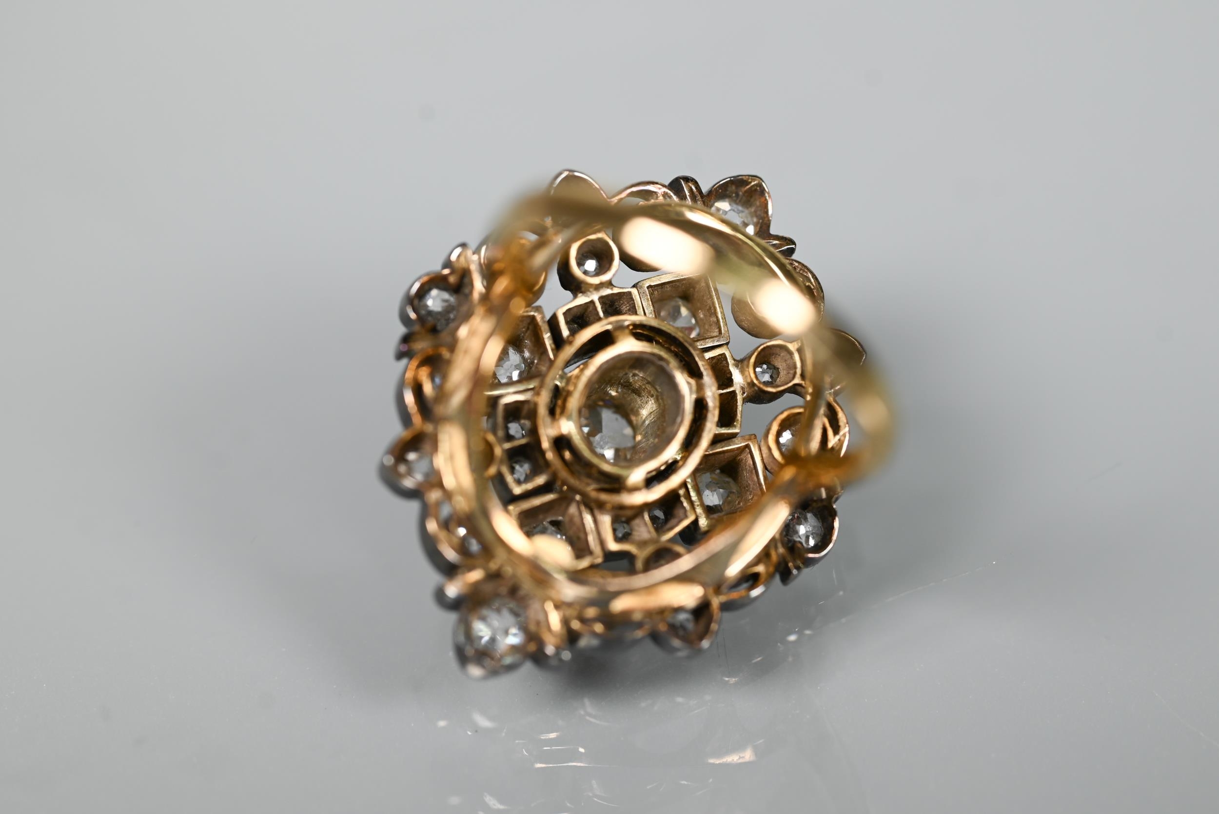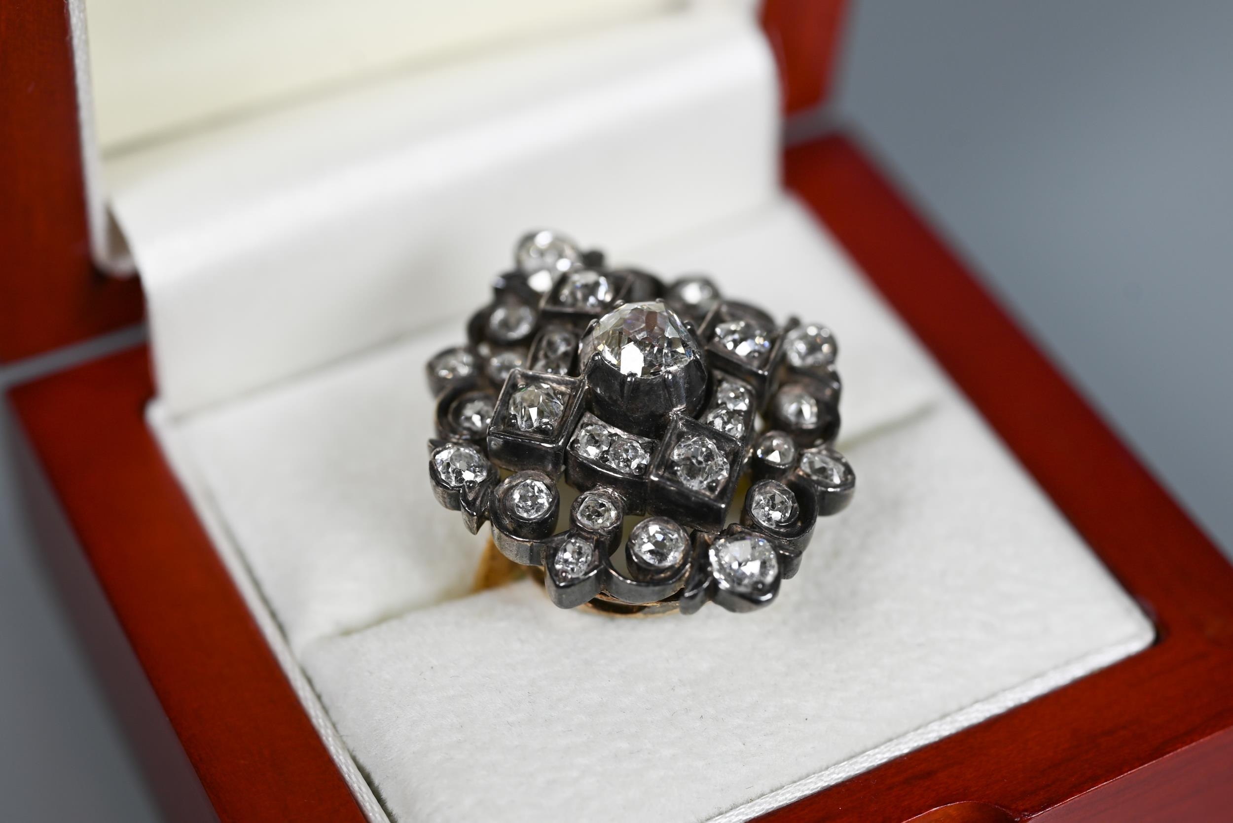 An antique diamond cluster ring, the central old cut diamond sourrounded by a cluster of thirty-two old cut diamonds of various sizes, milgrain set within a silver lozenge design, mounted on a scalloped 9ct yellow gold gallery and tapered shank, approx total carat weight 3.20ct, 2.5 x 2.8 cm overall, approx 12.7g all in, converted from an antique brooch
