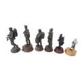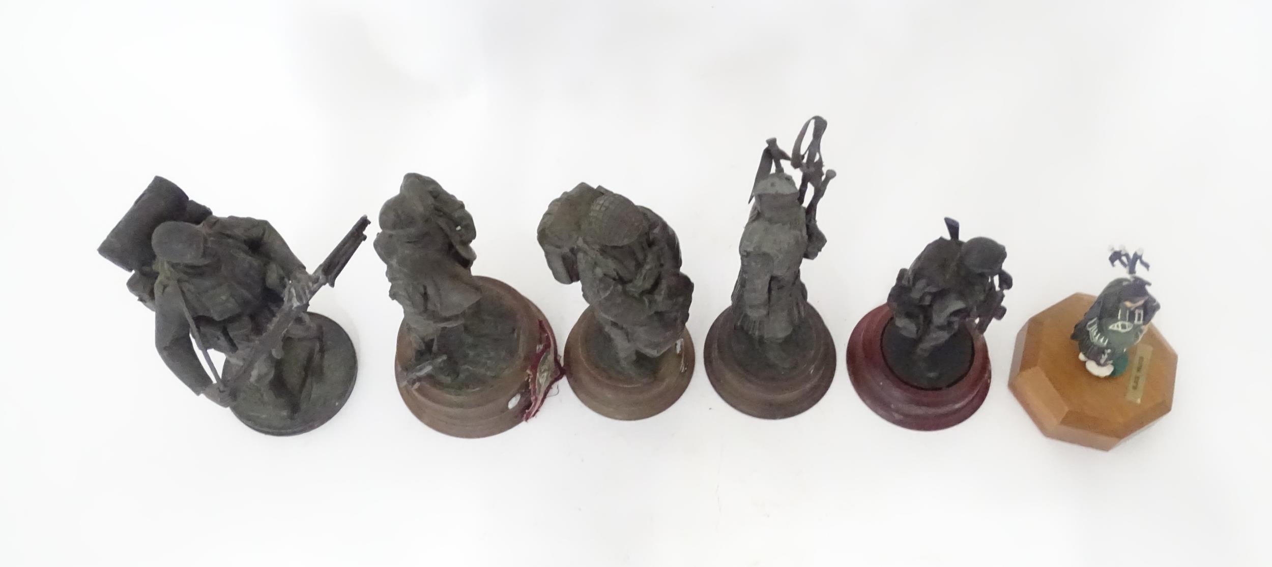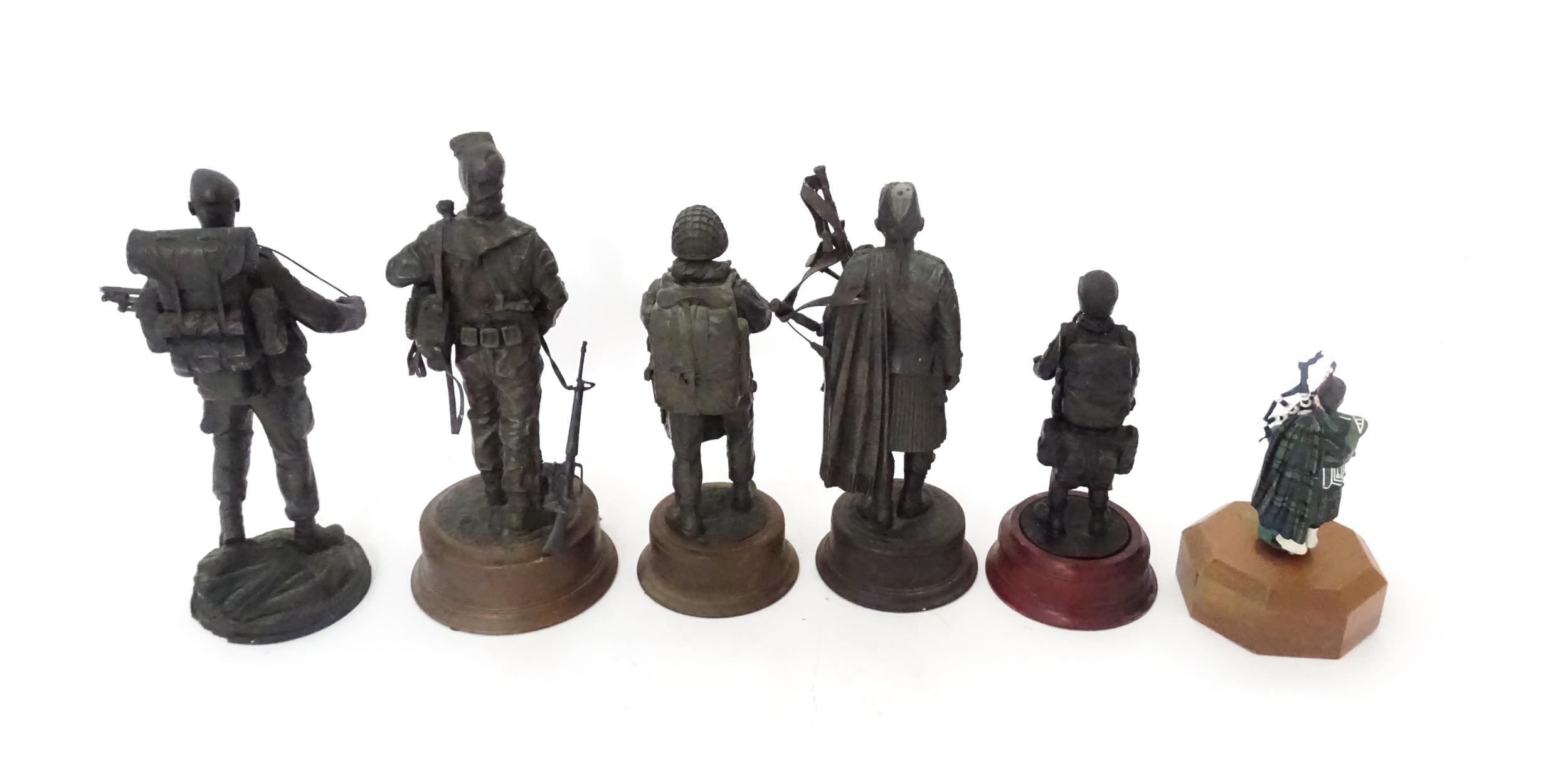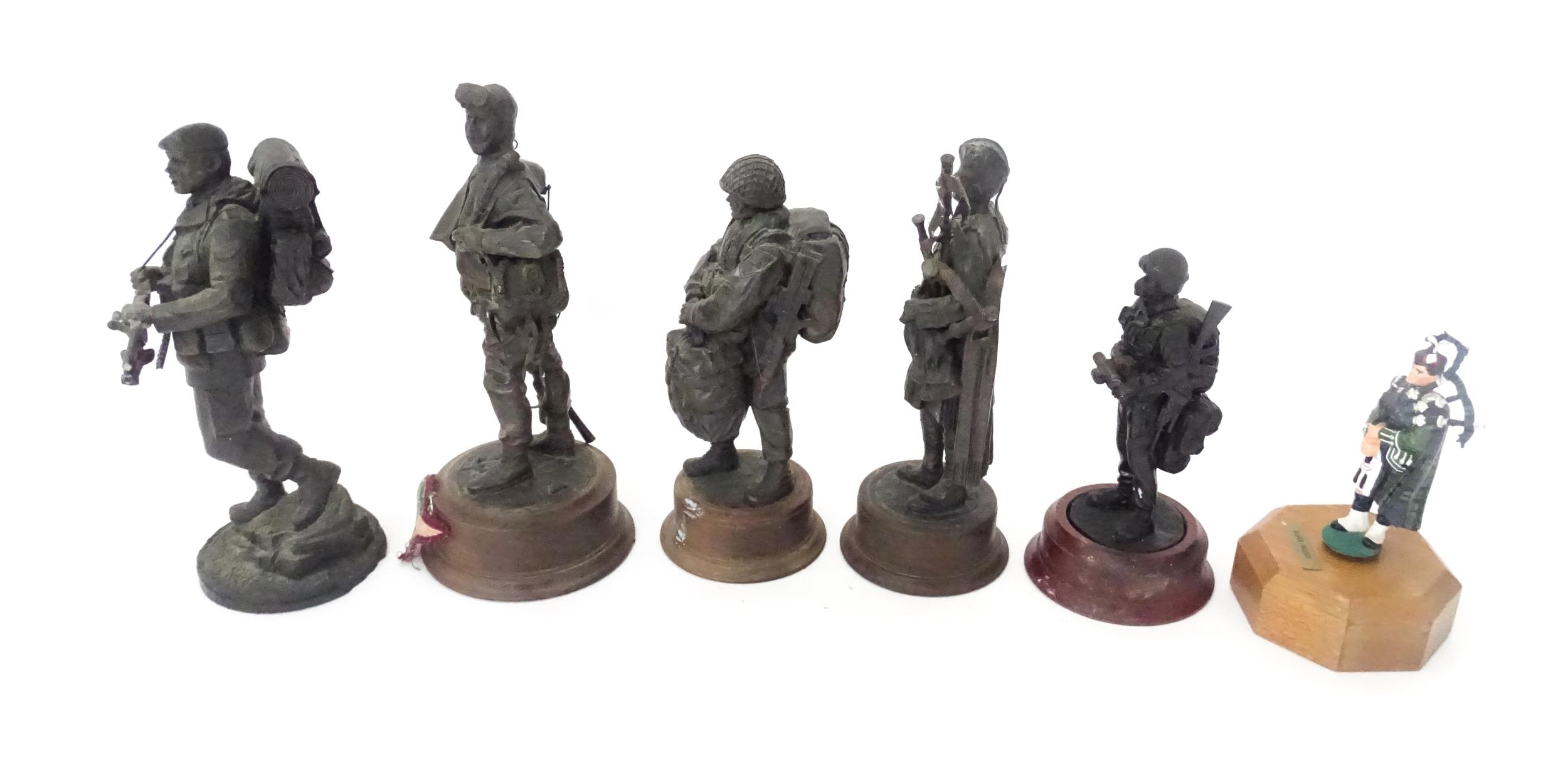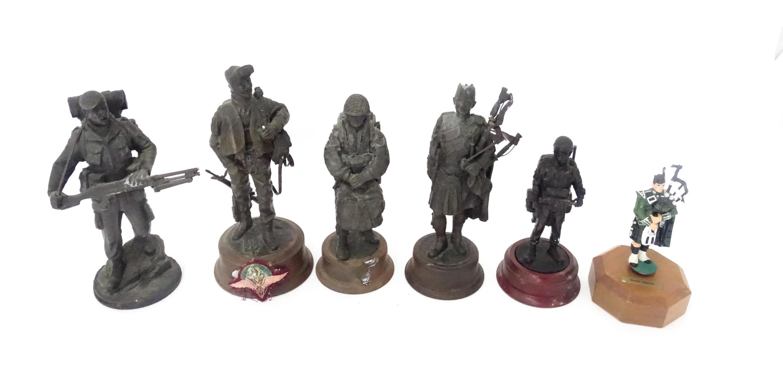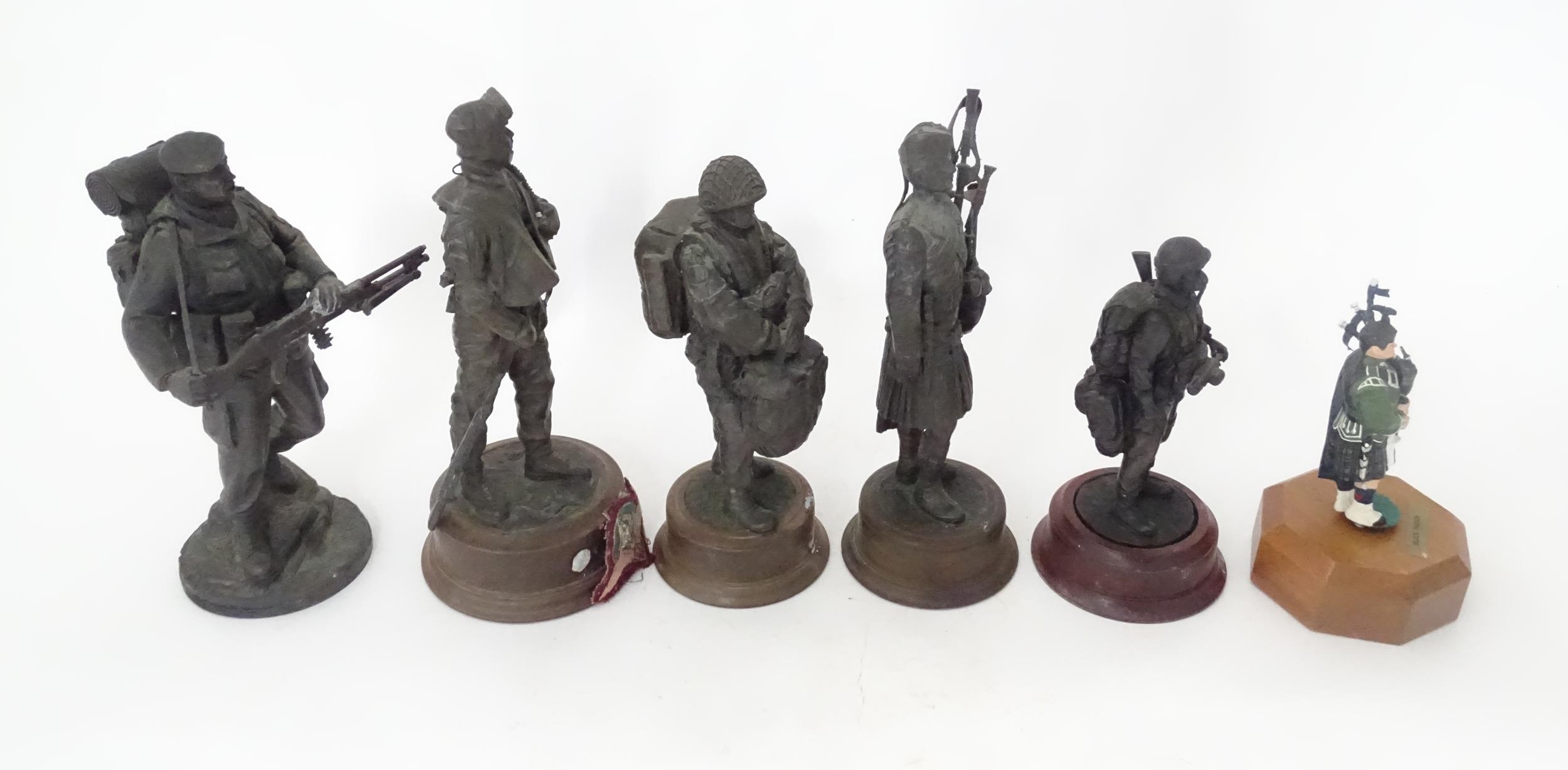 A quantity of 20thC military figures to include a Reuge musical box modelled as a Piper of the Black Watch, four Paratroopers and another Piper, the largest approx 10 1/4" tall (6)