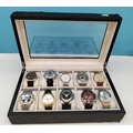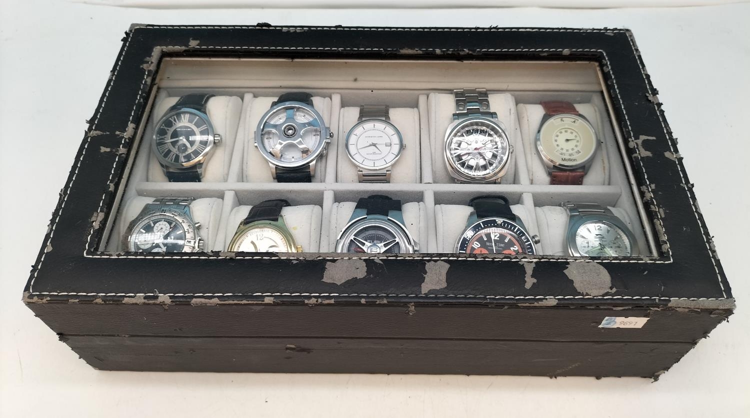 Watch Box with 10 Watches W/O to include Motion, Fubu, Neon Time, etc. Some Wear to Box.