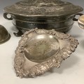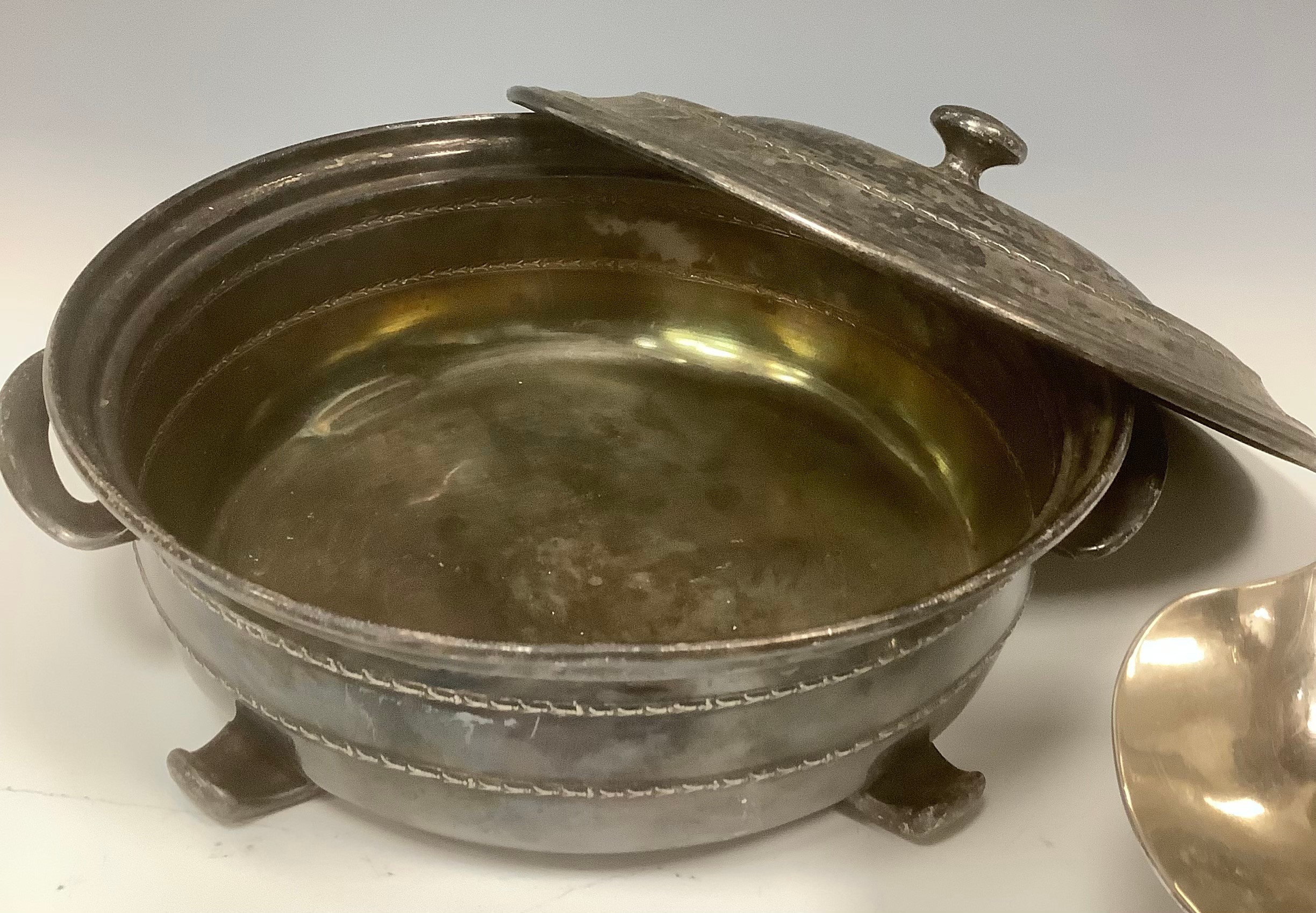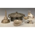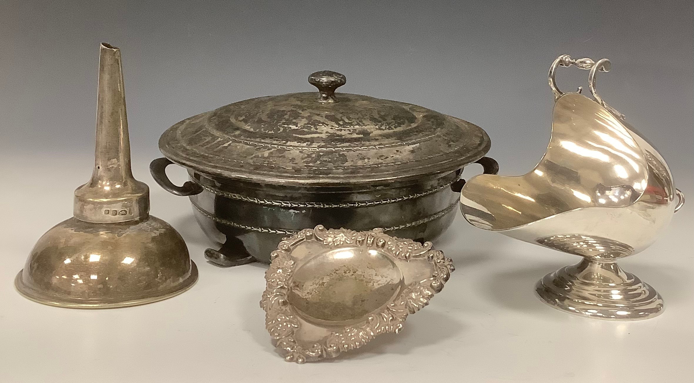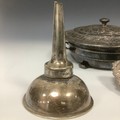 A Mappin & Webb Prince's Plate sugar scuttle, 15cm high; a wine funnel; etc (4)
