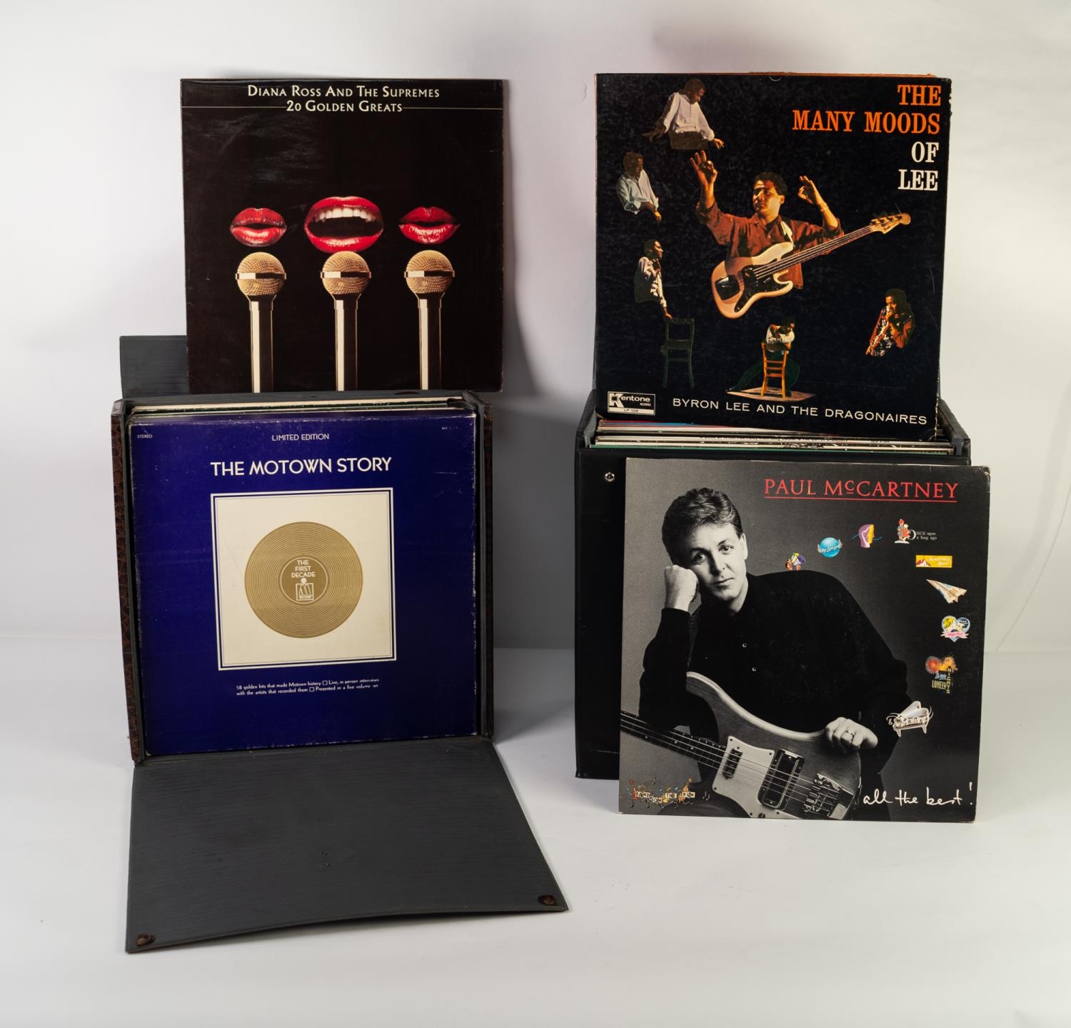Byron Lee and the Dragonaires, Kentone LP 106. The Motown Story, 5lp box set, MOTOWN, MS 5-726. Together with a quantity of other mixed genre albums, various artists to include Francois Hardy, Diana Ross, Louis Armstrong, Glen Campbell, Joan Baez, The Drifters, Tom Jones, Eddy Grant, The Four Seasons, Edith Piaf etc. contents of a large box and two carry cases. (approx 130). Condition-Various.
