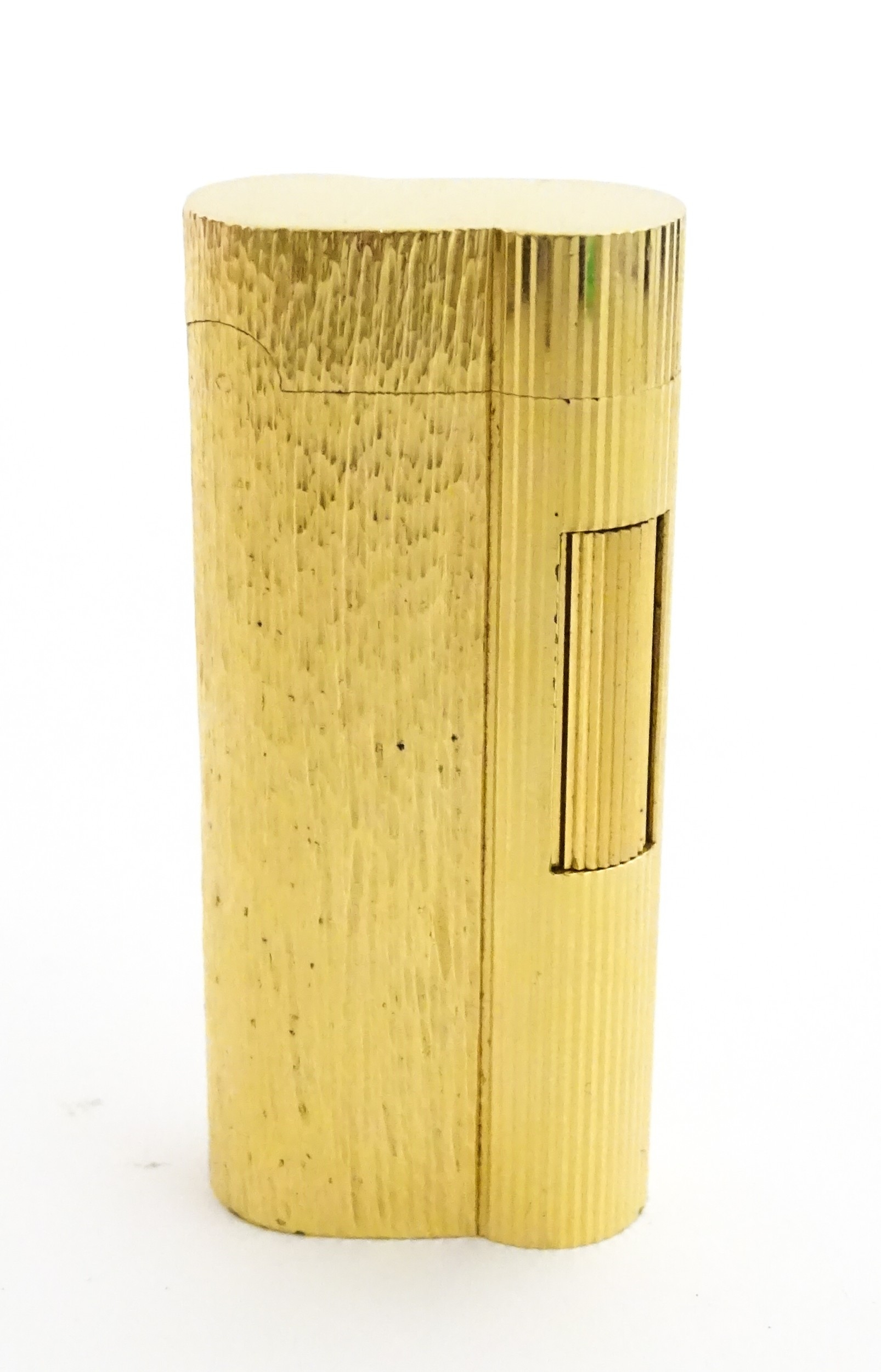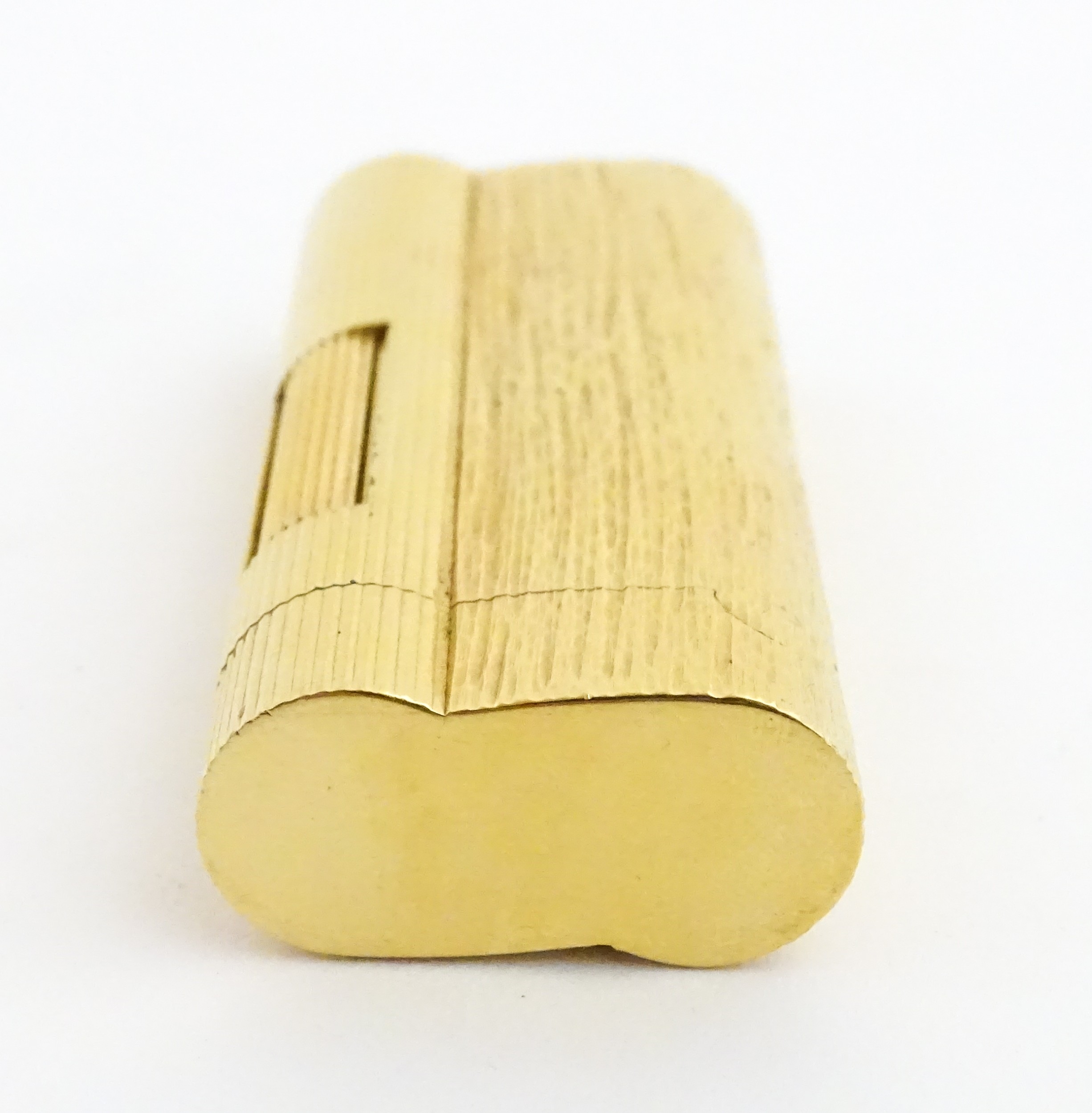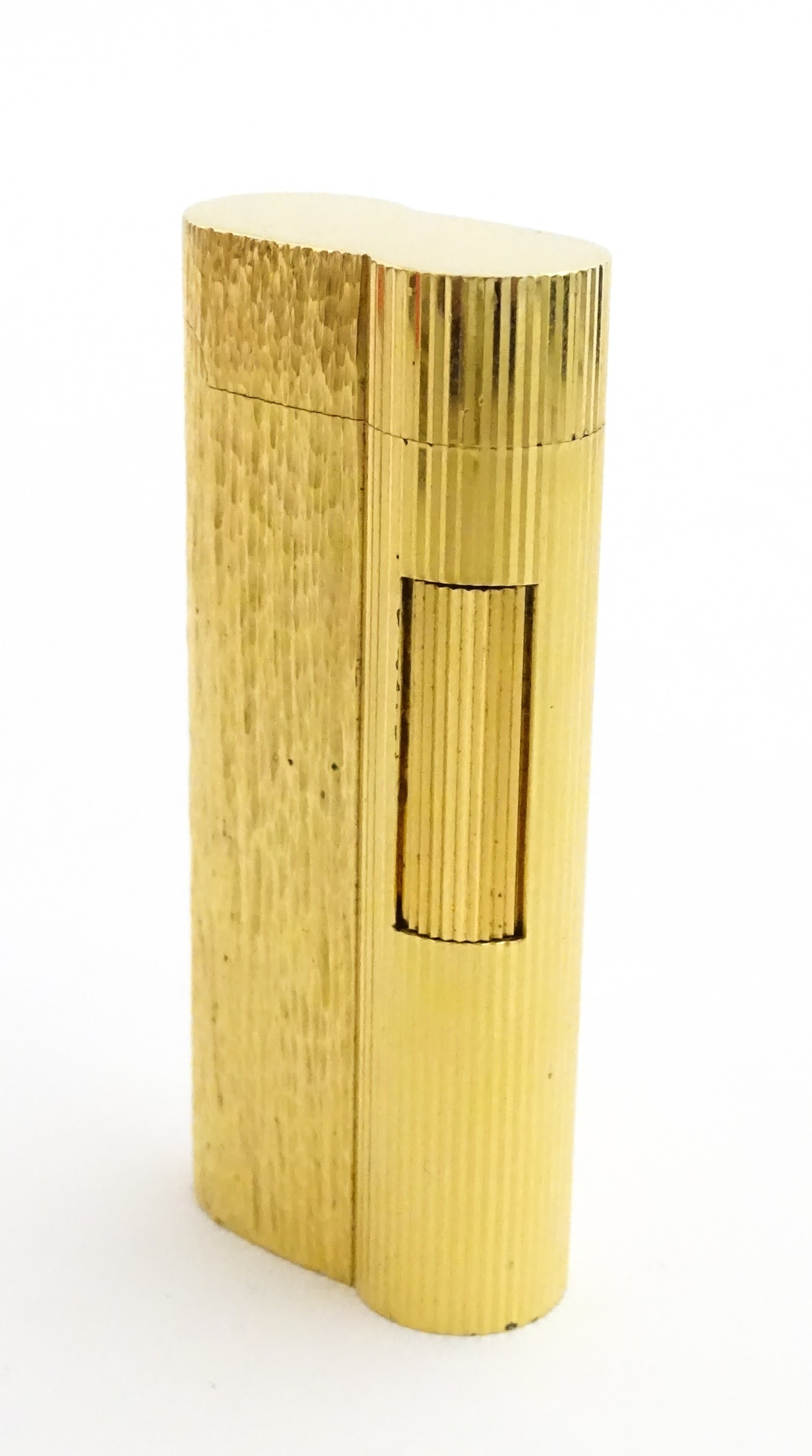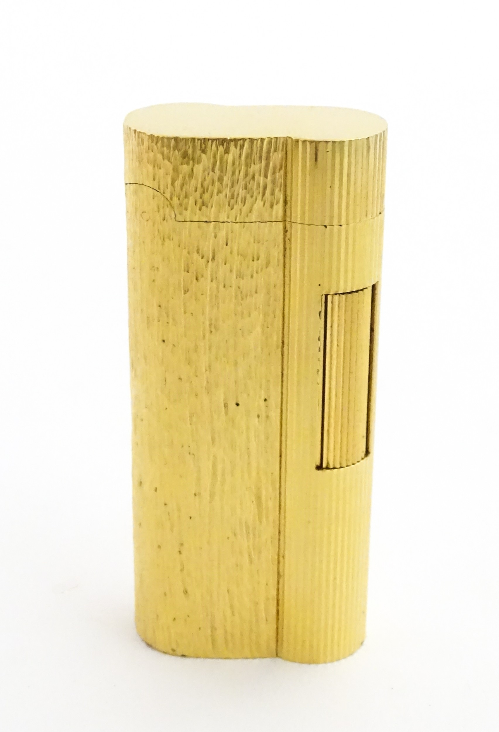A Dunhill S-type pocket lighter with linear and hammered decoration. The base stamped with serial number E60603. Approx 2 5/8" long