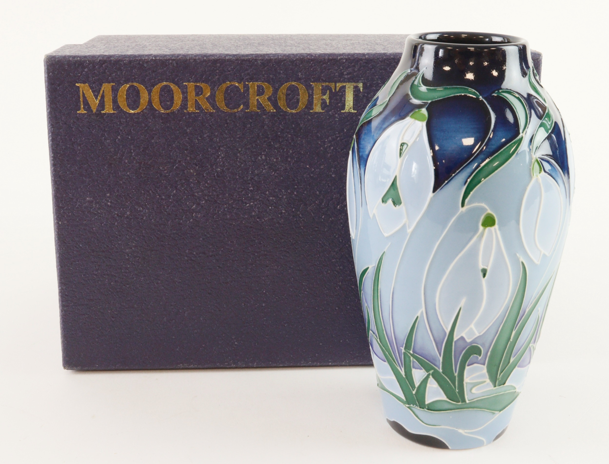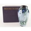 Moorcroft 'Snow Drops in Frost' pattern vase, dated 2008, makers marks to base, height 13cm approx., contained in a Moorcroft box