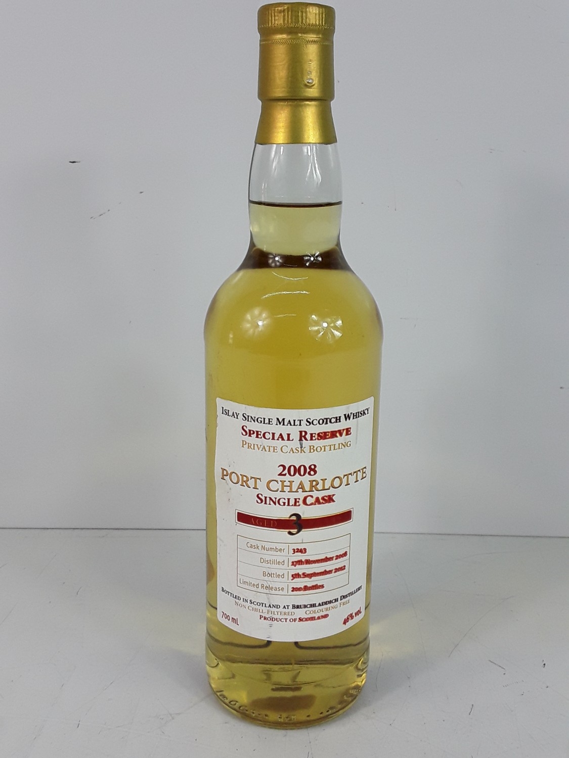 Bottle of Port Charlotte Special Reserve 3 year old private cask bottling 2008 Islay Single Malt Scotch Whisky single cask no 3243, distilled 17/11/2008, bottled 05/09/2012 at Bruichladdich Distillery, limited release 200 bottles, 46%, 70cl