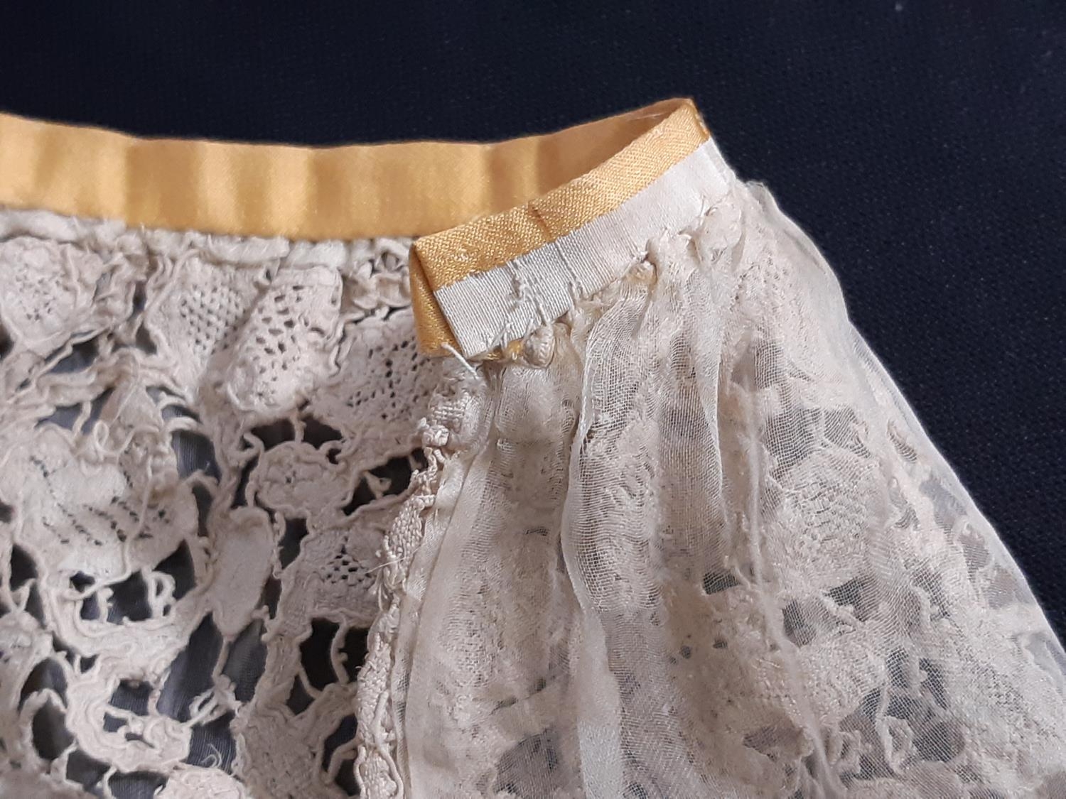 A 19th century Honiton lace bertha with raised and rolled detail, lined with fine gauze and with one edge gathered and bond. Length of gathered edge 107cm, width 27cm