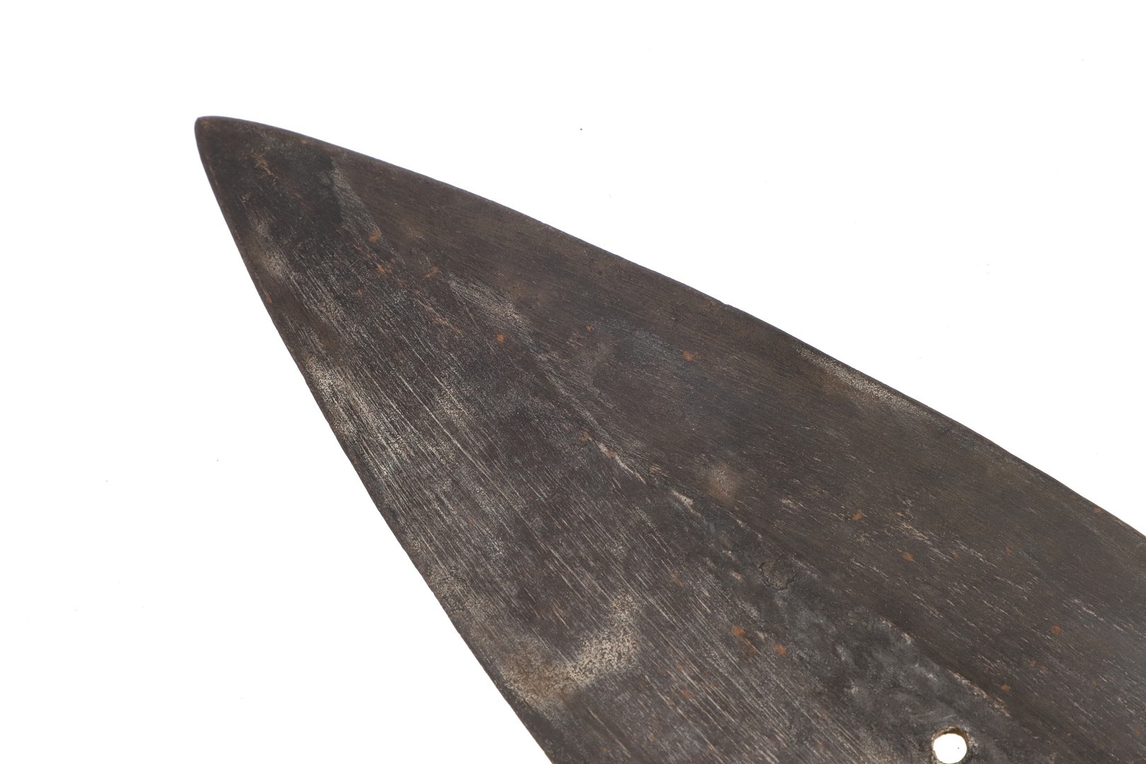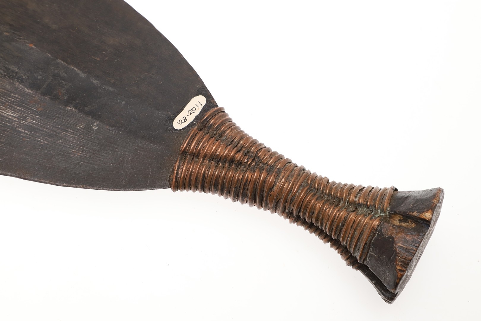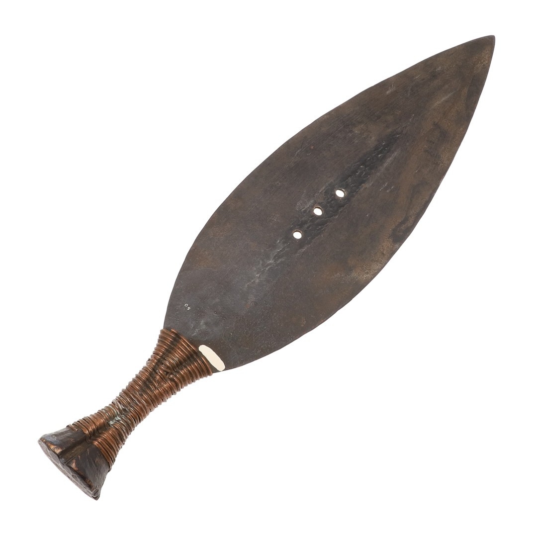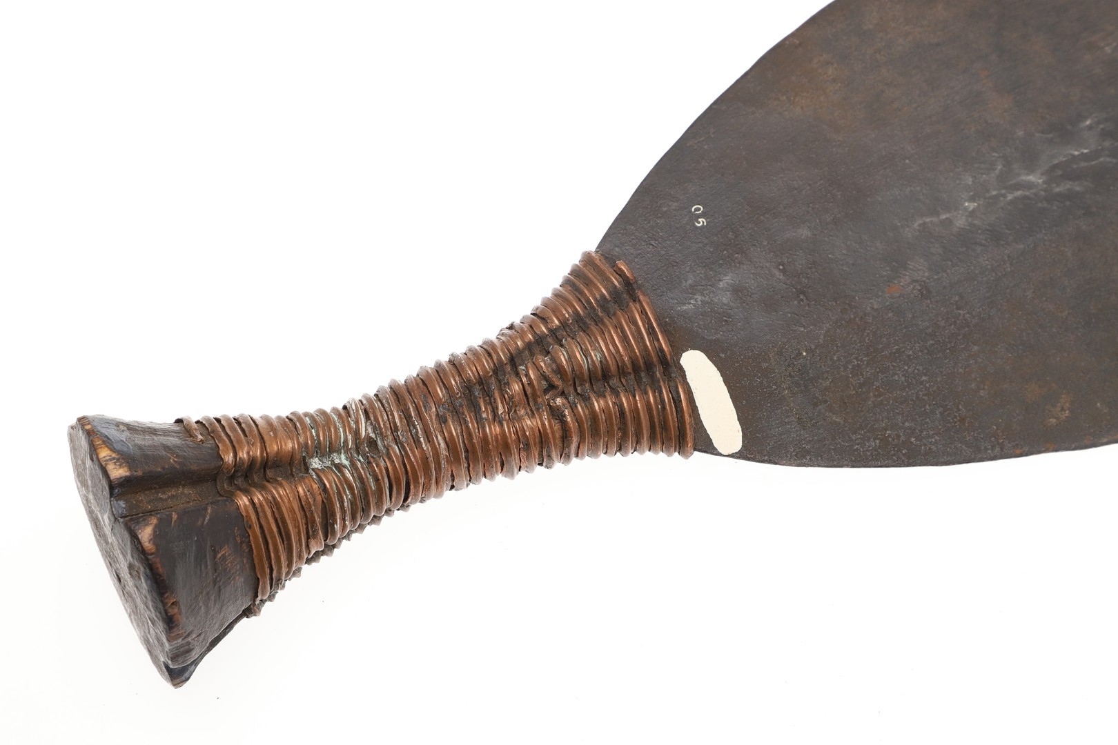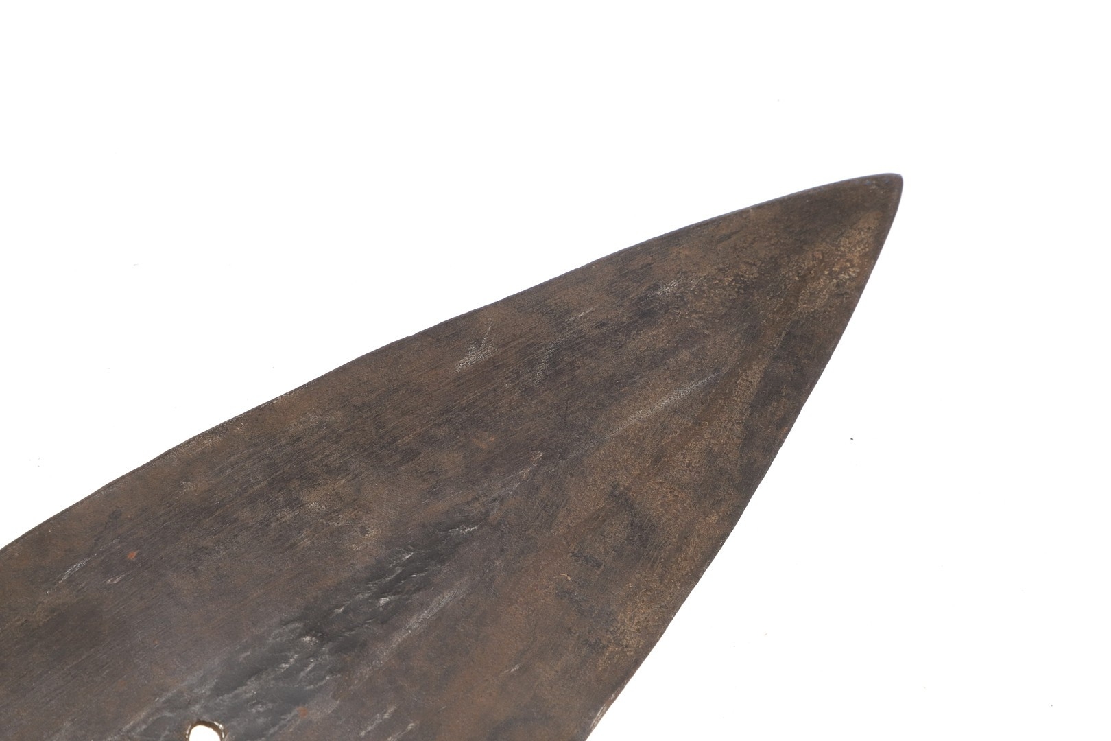 AN AFRICAN KNIFE WITH BROAD SPEAR SHAPED BLADE, NGALA. The 35.5 cm spear shaped blade, 11 cm at the widest point, with three pierced holes to the centre, on a copper bound grip with splayed pommel. 45.5 cm.