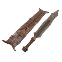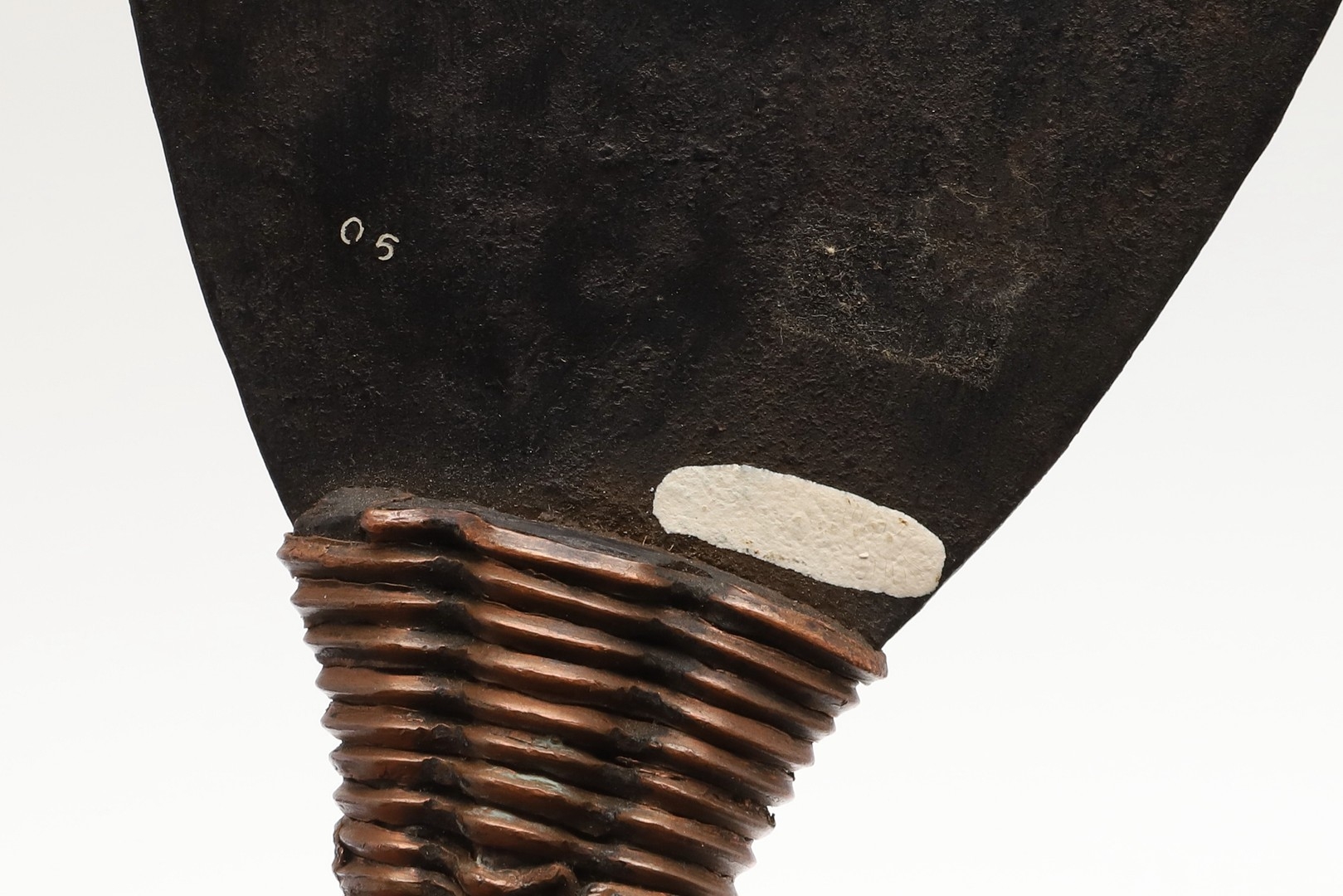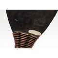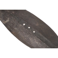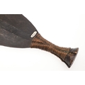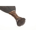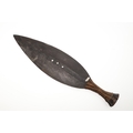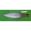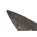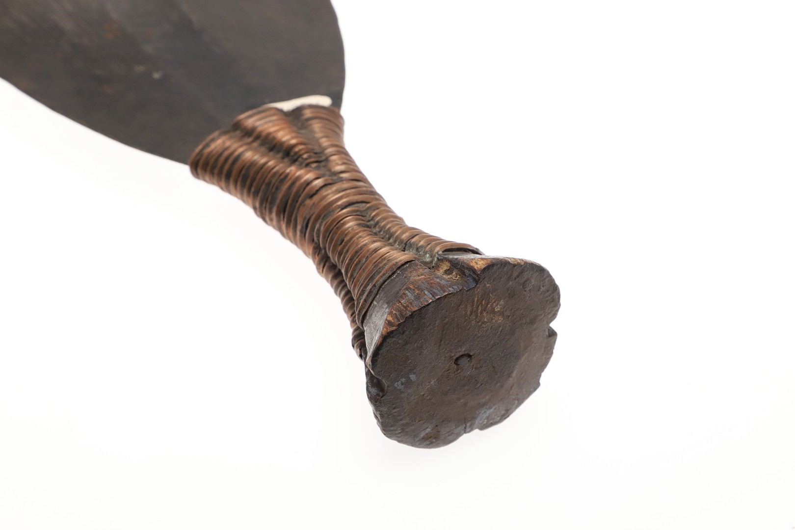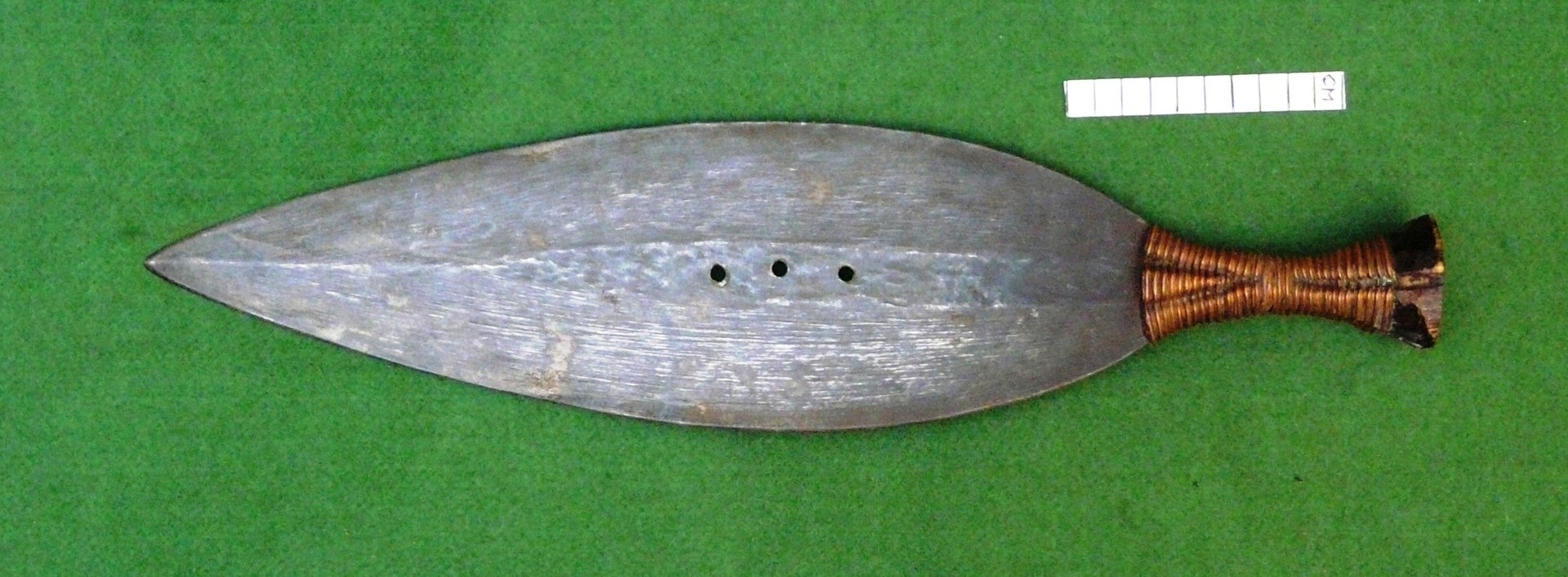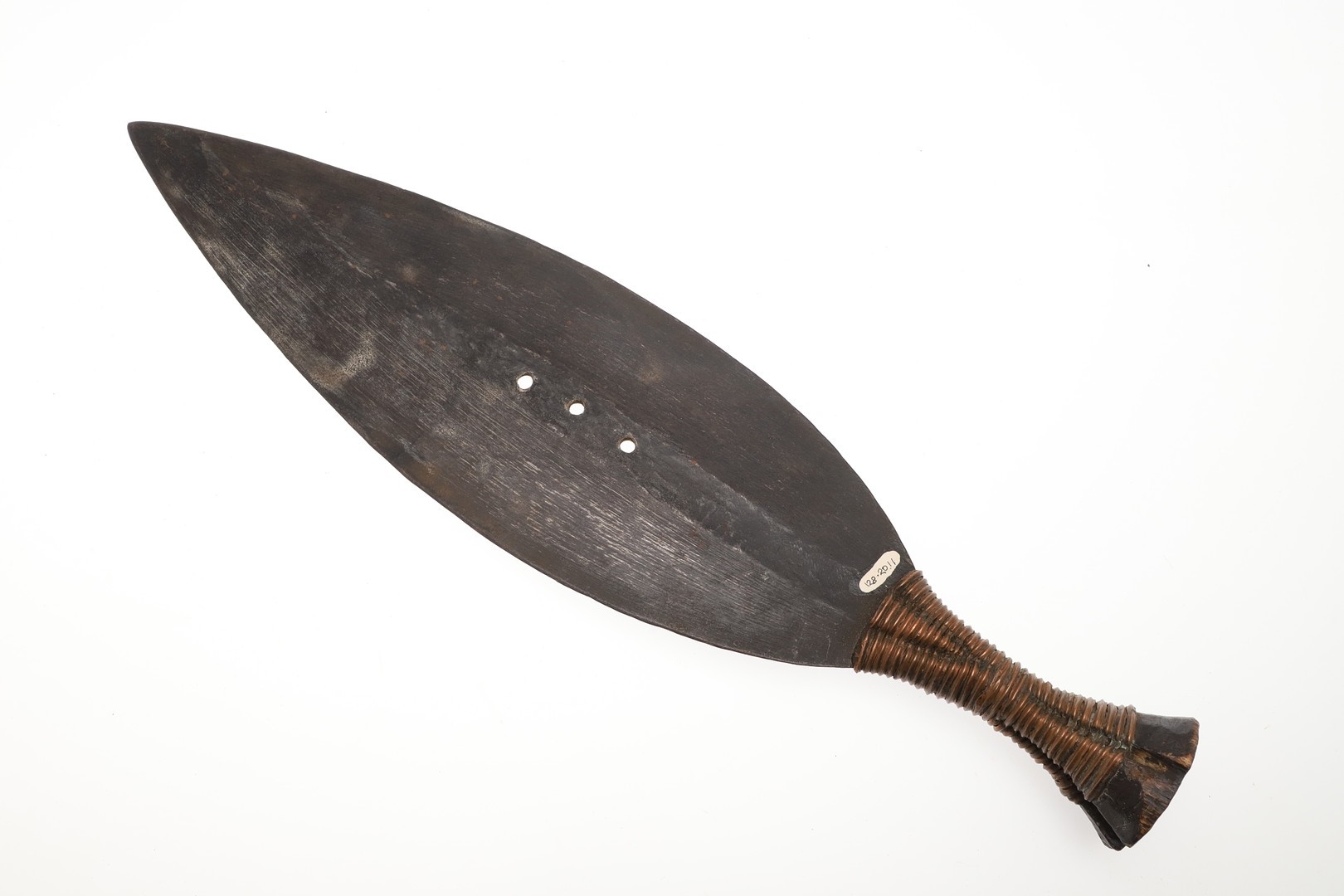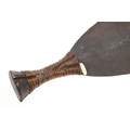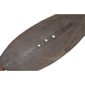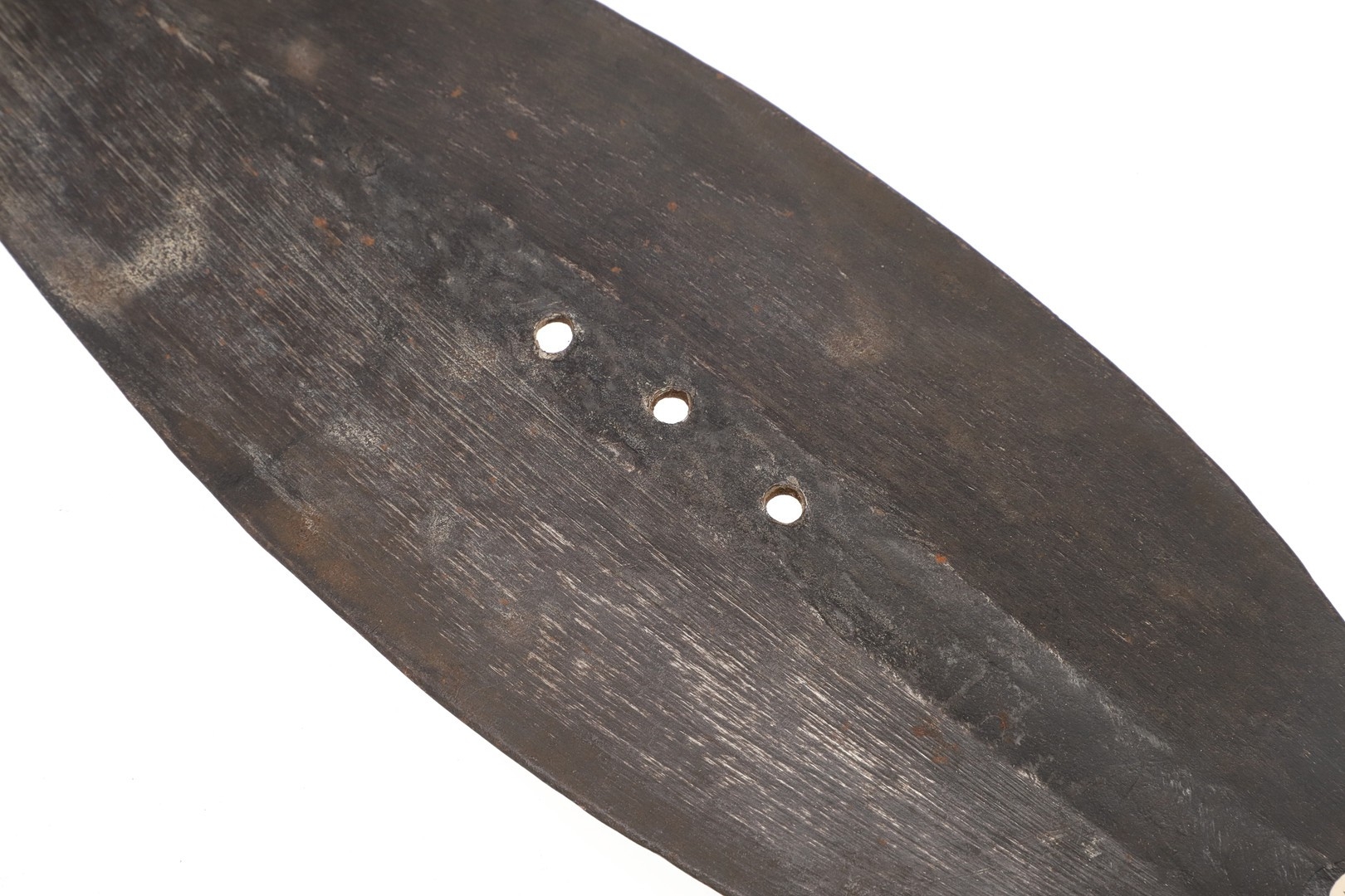 AN AFRICAN KNIFE WITH BROAD SPEAR SHAPED BLADE, NGALA. The 35.5 cm spear shaped blade, 11 cm at the widest point, with three pierced holes to the centre, on a copper bound grip with splayed pommel. 45.5 cm.