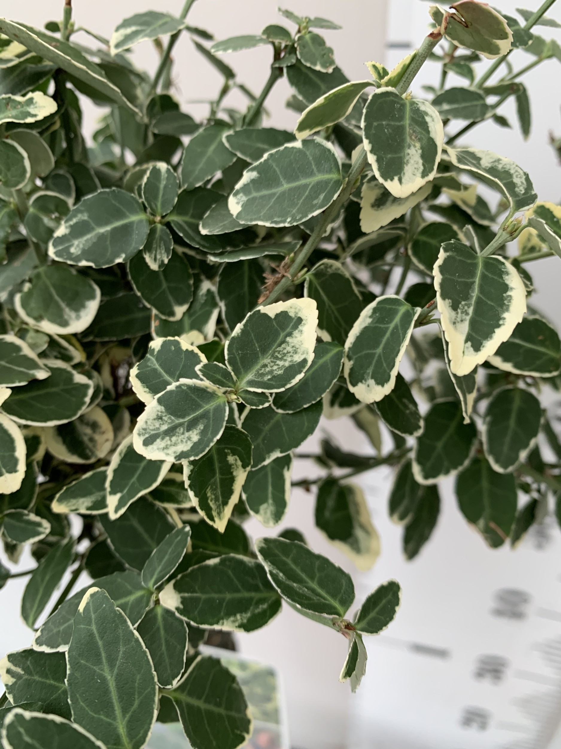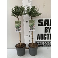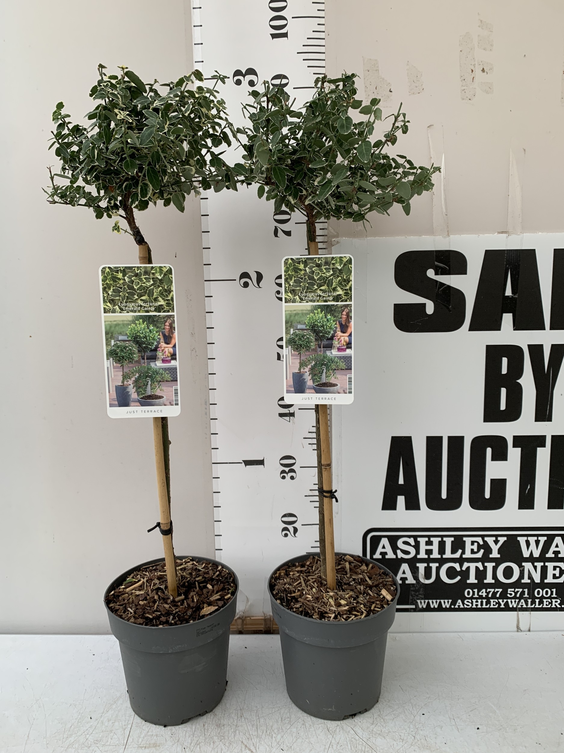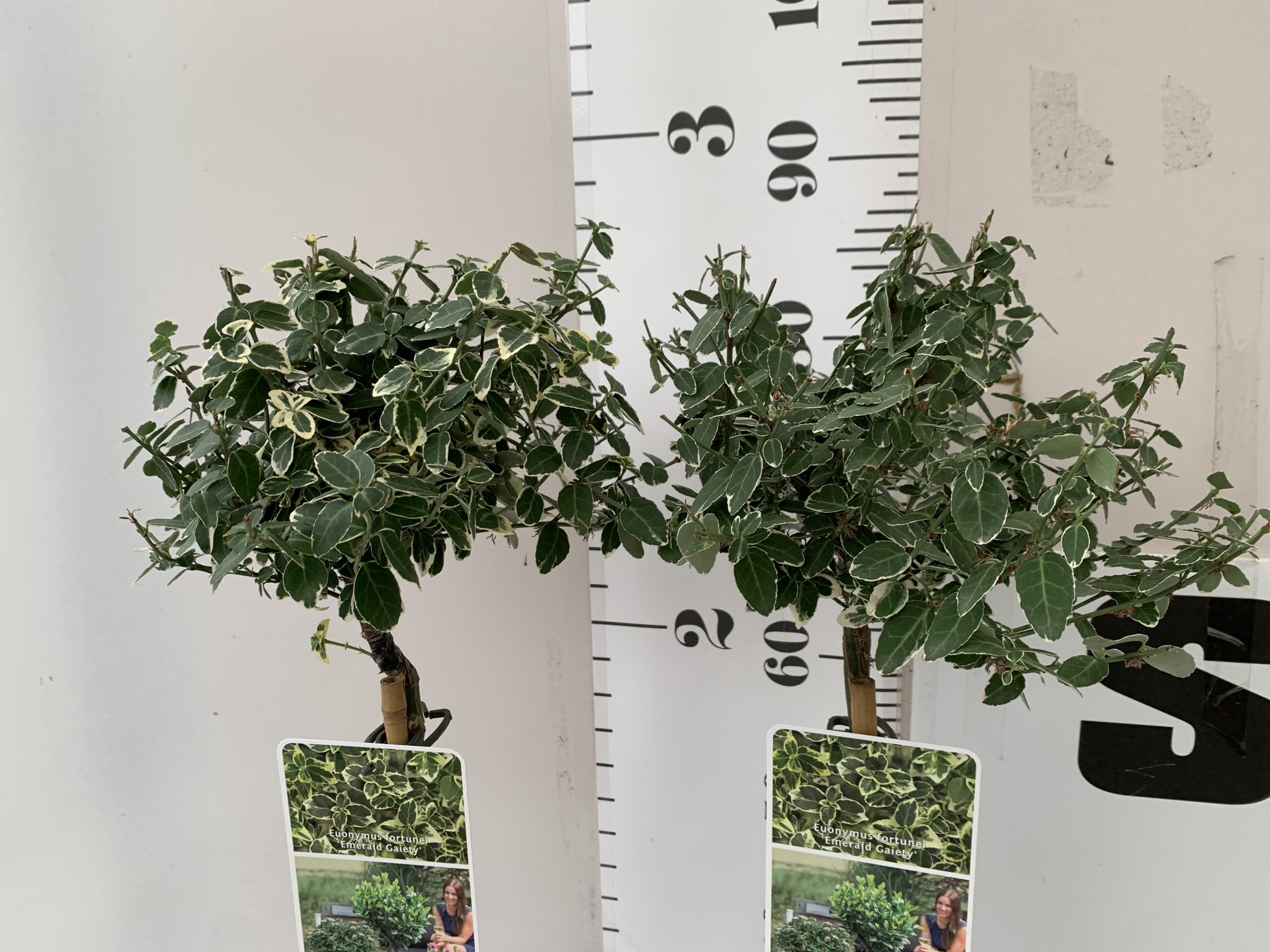 TWO EUONYMUS FORTUNEI 'HARLEQUIN' STANDARD TREES IN 3 LTR POTS. APPROX 90CM TALL TO BE SOLD FOR THE PAIR